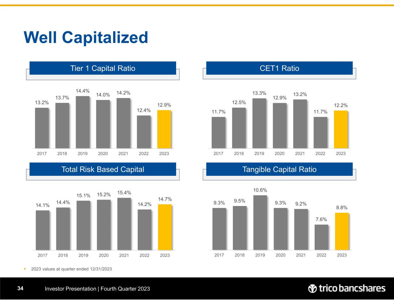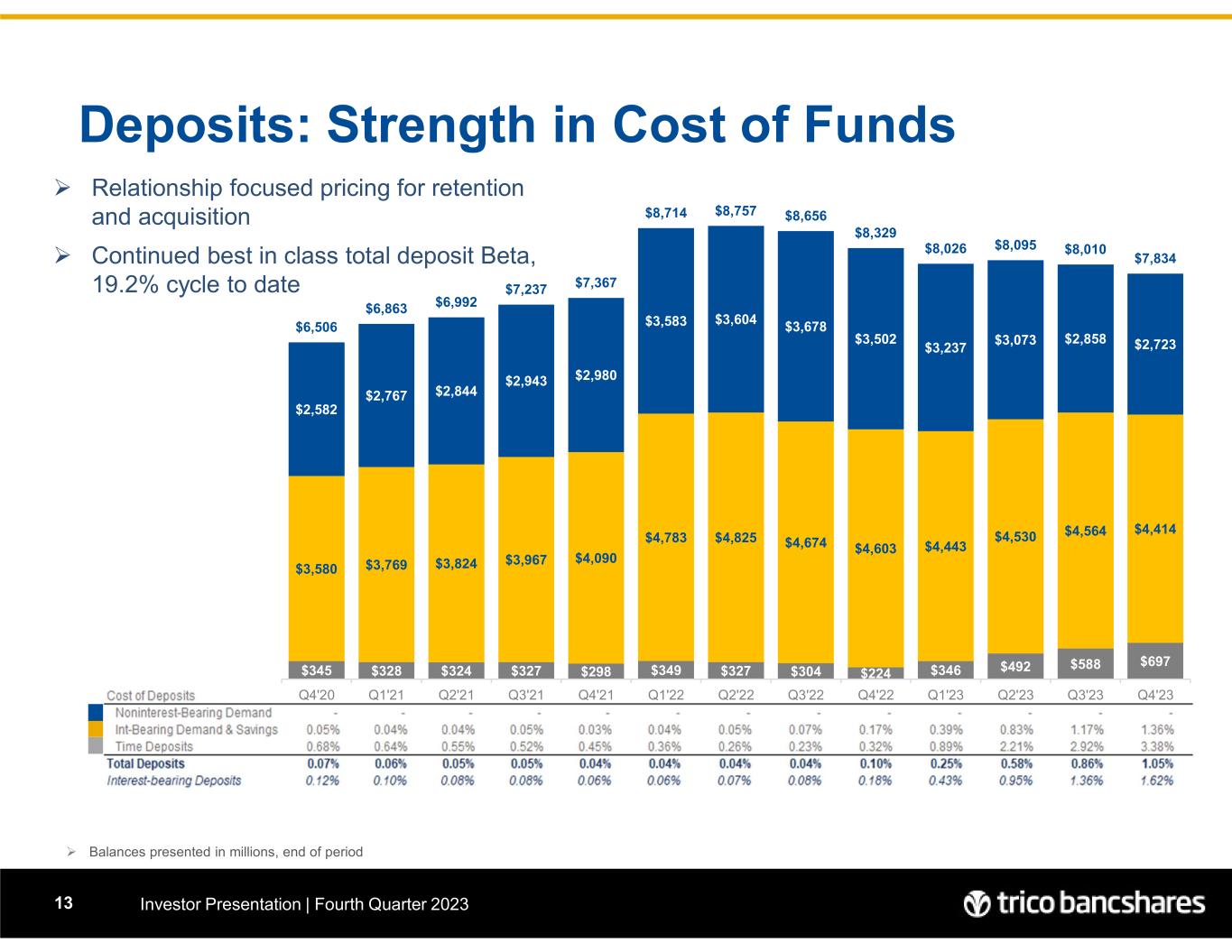 Liability Mix: Strength in Funding Investor Presentation | Fourth Quarter 202312 Total Deposits = $7.83 billion 91.4% of Funding Liabilities Liability Mix 12/31/2023  Peer group consists of 99 closest peers in terms of asset size, range $4.7-11.5 Billion; source: BankRegData.com  Net Loans includes LHFS and Allowance for Credit Loss; Core Deposits = Total Deposits less CDs > 250k and Brokered Deposits (0.03% Funding Cost) Non Interest- bearing Demand Deposits, 31.1% Interest-bearing Demand & Savings Deposits, 50.4% Time Deposits, 8.0% Borrowings & Subordinated Debt, 8.4% Other liabilities, 2.1% 7 2 .6 7 1 .8 7 0 .1 6 6 .9 6 6 .0 6 6 .4 6 9 .1 7 2 .1 7 6 .5 7 9 .5 8 0 .4 8 4 .0 8 7 .7 0 20 40 60 80 100 120 2020 Q4 2021 Q1 2021 Q2 2021 Q3 2021 Q4 2022 Q1 2022 Q2 2022 Q3 2022 Q4 2023 Q1 2023 Q2 2023 Q3 2023 Q4 Loans to Core Deposits (%) TCBK Peers 3 9 .7 4 0 .3 4 0 .7 4 0 .7 4 0 .4 4 1 .1 4 1 .2 4 2 .5 4 2 .0 4 0 .3 3 8 .0 3 5 .7 3 4 .8 0 10 20 30 40 2020 Q4 2021 Q1 2021 Q2 2021 Q3 2021 Q4 2022 Q1 2022 Q2 2022 Q3 2022 Q4 2023 Q1 2023 Q2 2023 Q3 2023 Q4 Non Interest-bearing Deposits as % of Total Deposits TCBK Peers