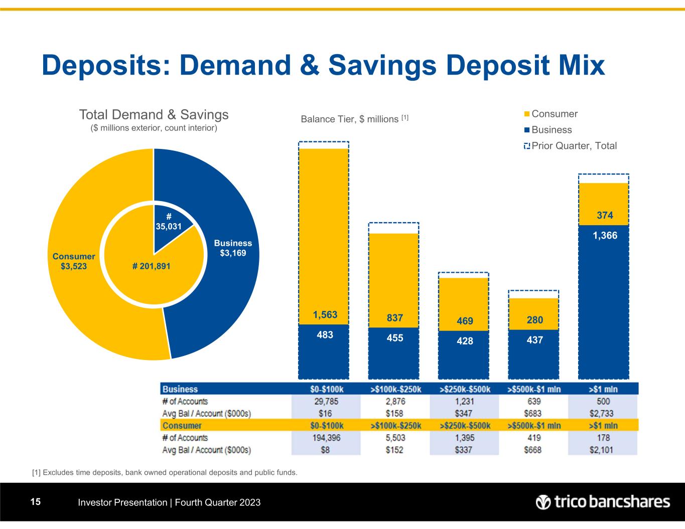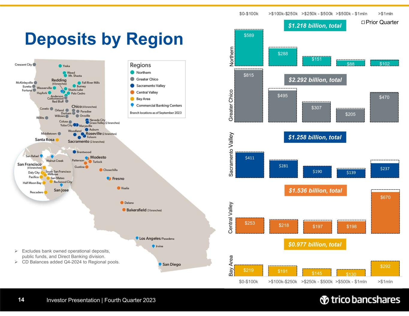 $219 $191 $145 $130 $292 - 100 200 300 400 500 600 700 800 $0-$100k >$100k-$250k >$250k - $500k >$500k - $1mln >$1mln $253 $218 $197 $198 $670 - 100 200 300 400 500 600 700 800 $411 $281 $190 $139 $237 - 100 200 300 400 500 600 700 800 $815 $495 $307 $205 $470 - 100 200 300 400 500 600 700 800 G re a te r C h ic o $589 $288 $151 $88 $102 - 100 200 300 400 500 600 700 800 Prior Quarter N o rt h er n Deposits by Region Investor Presentation | Fourth Quarter 202314  Excludes bank owned operational deposits, public funds, and Direct Banking division.  CD Balances added Q4-2024 to Regional pools. $1.218 billion, total $2.292 billion, total $1.258 billion, total $1.536 billion, total $0.977 billion, total S a cr am en to V a lle y C e nt ra l V a lle y B a y A re a