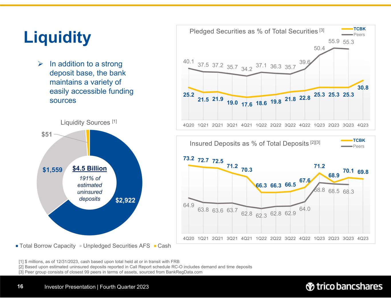 73.2 72.7 72.5 71.2 70.3 66.3 66.3 66.5 67.6 71.2 68.9 70.1 69.8 64.9 63.8 63.6 63.7 62.8 62.3 62.8 62.9 64.0 68.8 68.5 68.3 4Q20 1Q21 2Q21 3Q21 4Q21 1Q22 2Q22 3Q22 4Q22 1Q23 2Q23 3Q23 4Q23 Insured Deposits as % of Total Deposits [2][3] TCBK Peers 25.2 21.5 21.9 19.0 17.6 18.6 19.8 21.8 22.8 25.3 25.3 25.3 30.8 40.1 37.5 37.2 35.7 34.2 37.1 36.3 35.7 39.6 50.4 55.9 55.3 4Q20 1Q21 2Q21 3Q21 4Q21 1Q22 2Q22 3Q22 4Q22 1Q23 2Q23 3Q23 4Q23 Pledged Securities as % of Total Securities [3] TCBK Peers $2,922 $1,559 $51 Liquidity Sources [1] Total Borrow Capacity Unpledged Securities AFS Cash Liquidity Investor Presentation | Fourth Quarter 202316 [1] $ millions, as of 12/31/2023, cash based upon total held at or in transit with FRB [2] Based upon estimated uninsured deposits reported in Call Report schedule RC-O includes demand and time deposits [3] Peer group consists of closest 99 peers in terms of assets, sourced from BankRegData.com $4.5 Billion 191% of estimated uninsured deposits  In addition to a strong deposit base, the bank maintains a variety of easily accessible funding sources