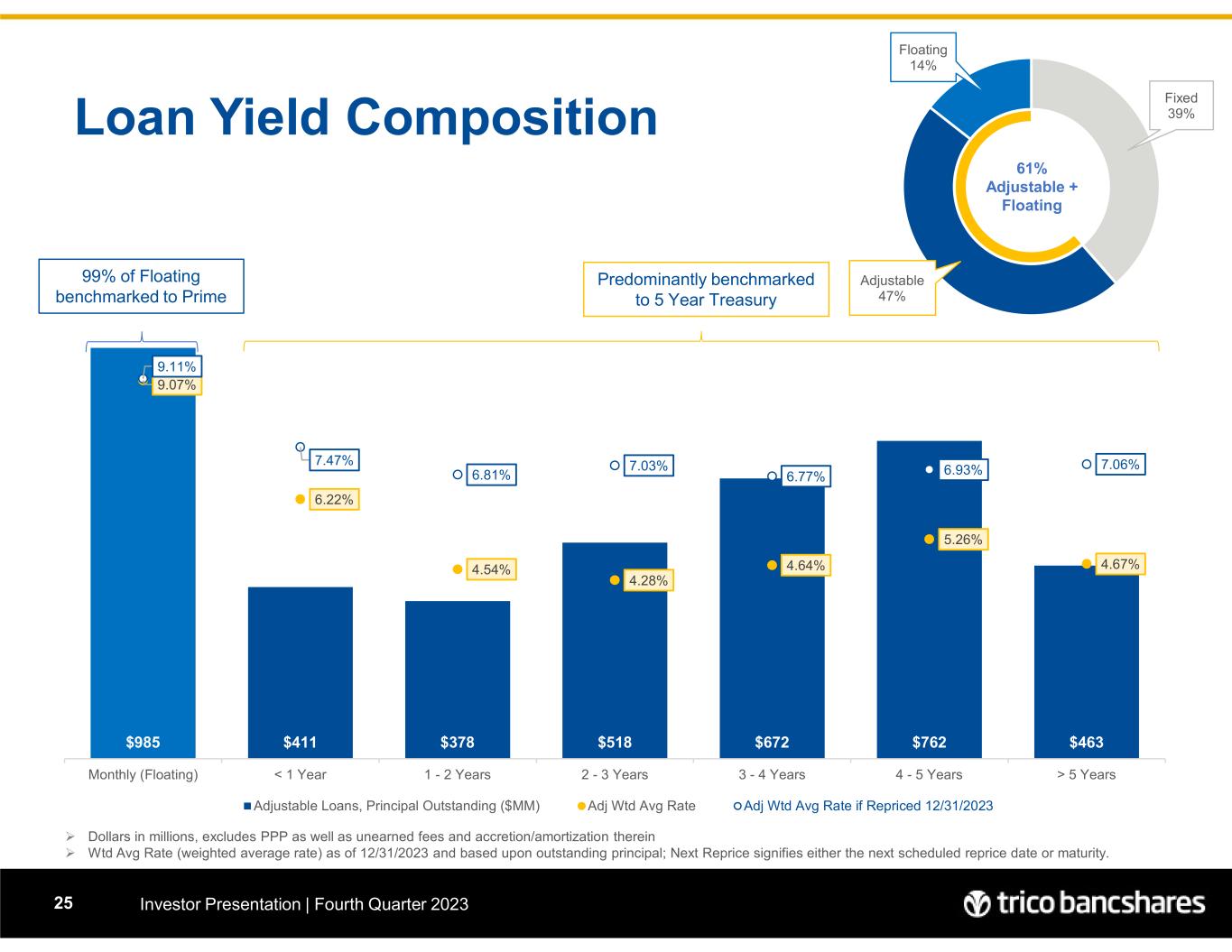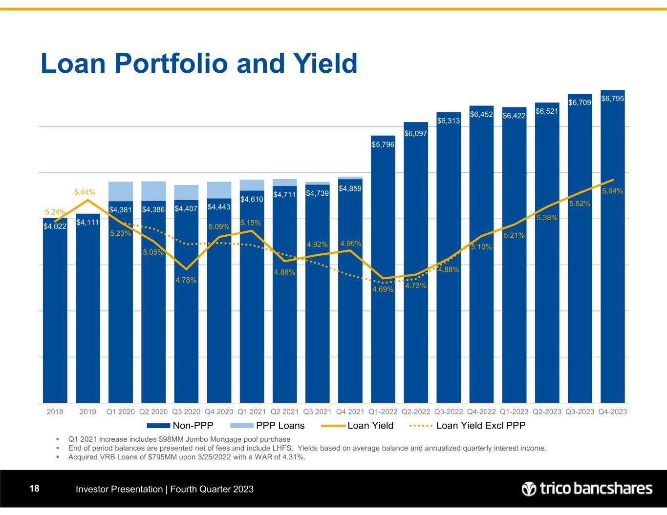 Loan Portfolio and Yield Investor Presentation | Fourth Quarter 202318  Q1 2021 increase includes $98MM Jumbo Mortgage pool purchase  End of period balances are presented net of fees and include LHFS. Yields based on average balance and annualized quarterly interest income.  Acquired VRB Loans of $795MM upon 3/25/2022 with a WAR of 4.31%. $4,022 $4,111 $4,381 $4,386 $4,407 $4,443 $4,610 $4,711 $4,739 $4,859 $5,796 $6,097 $6,313 $6,452 $6,422 $6,521 $6,709 $6,795 5.24% 5.44% 5.23% 5.05% 4.78% 5.09% 5.15% 4.86% 4.92% 4.96% 4.69% 4.73% 4.88% 5.10% 5.21% 5.38% 5.52% 5.64% 3.50% 4.50% 5.50% 6.50% $0 $1,000 $2,000 $3,000 $4,000 $5,000 $6,000 2018 2019 Q1 2020 Q2 2020 Q3 2020 Q4 2020 Q1 2021 Q2 2021 Q3 2021 Q4 2021 Q1-2022 Q2-2022 Q3-2022 Q4-2022 Q1-2023 Q2-2023 Q3-2023 Q4-2023 Non-PPP PPP Loans Loan Yield Loan Yield Excl PPP