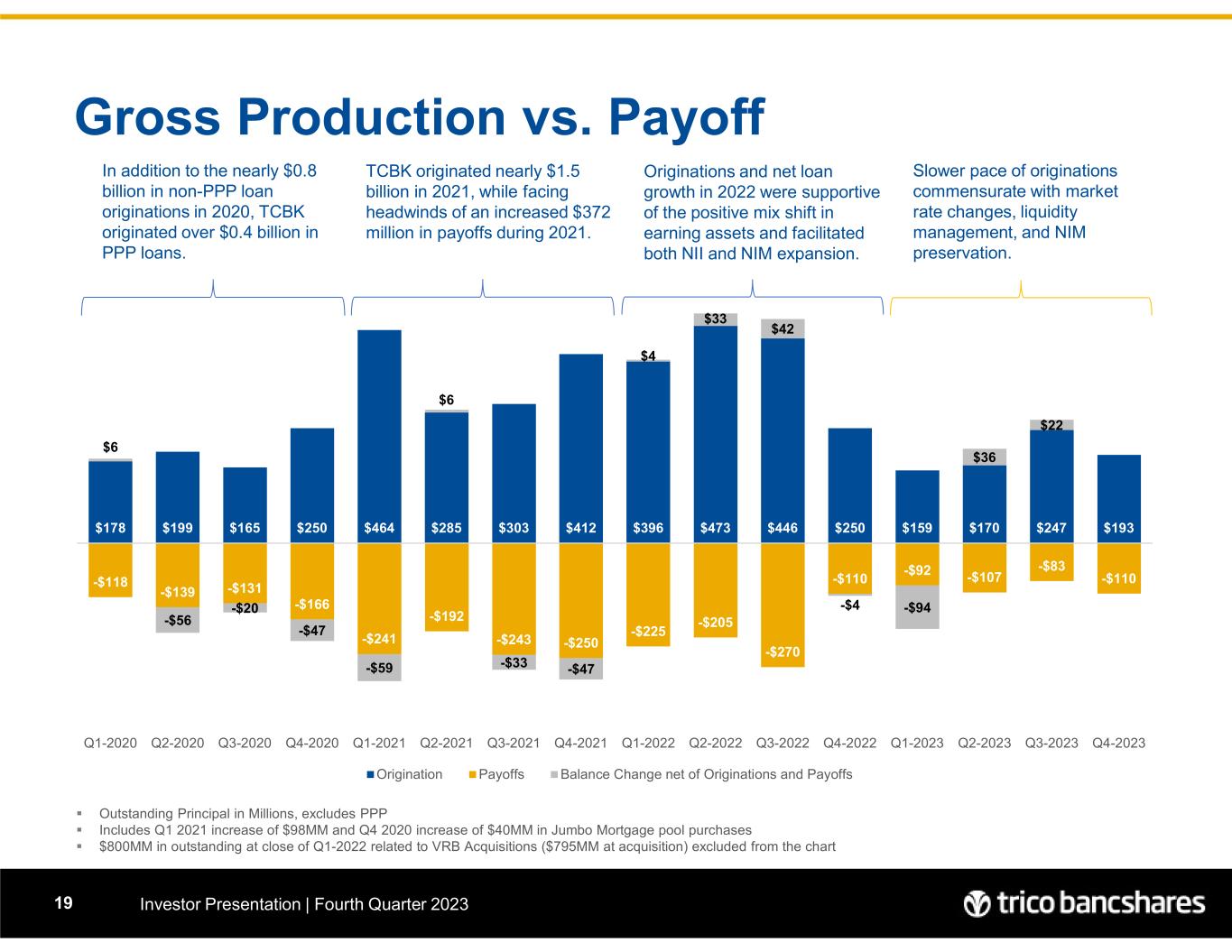 $178 $199 $165 $250 $464 $285 $303 $412 $396 $473 $446 $250 $159 $170 $247 $193 -$118 -$139 -$131 -$166 -$241 -$192 -$243 -$250 -$225 -$205 -$270 -$110 -$92 -$107 -$83 -$110 $6 -$56 -$20 -$47 -$59 $6 -$33 -$47 $4 $33 $42 -$4 -$94 $36 $22 Q1-2020 Q2-2020 Q3-2020 Q4-2020 Q1-2021 Q2-2021 Q3-2021 Q4-2021 Q1-2022 Q2-2022 Q3-2022 Q4-2022 Q1-2023 Q2-2023 Q3-2023 Q4-2023 Origination Payoffs Balance Change net of Originations and Payoffs Gross Production vs. Payoff Investor Presentation | Fourth Quarter 202319  Outstanding Principal in Millions, excludes PPP  Includes Q1 2021 increase of $98MM and Q4 2020 increase of $40MM in Jumbo Mortgage pool purchases  $800MM in outstanding at close of Q1-2022 related to VRB Acquisitions ($795MM at acquisition) excluded from the chart TCBK originated nearly $1.5 billion in 2021, while facing headwinds of an increased $372 million in payoffs during 2021. In addition to the nearly $0.8 billion in non-PPP loan originations in 2020, TCBK originated over $0.4 billion in PPP loans. Originations and net loan growth in 2022 were supportive of the positive mix shift in earning assets and facilitated both NII and NIM expansion. Slower pace of originations commensurate with market rate changes, liquidity management, and NIM preservation.