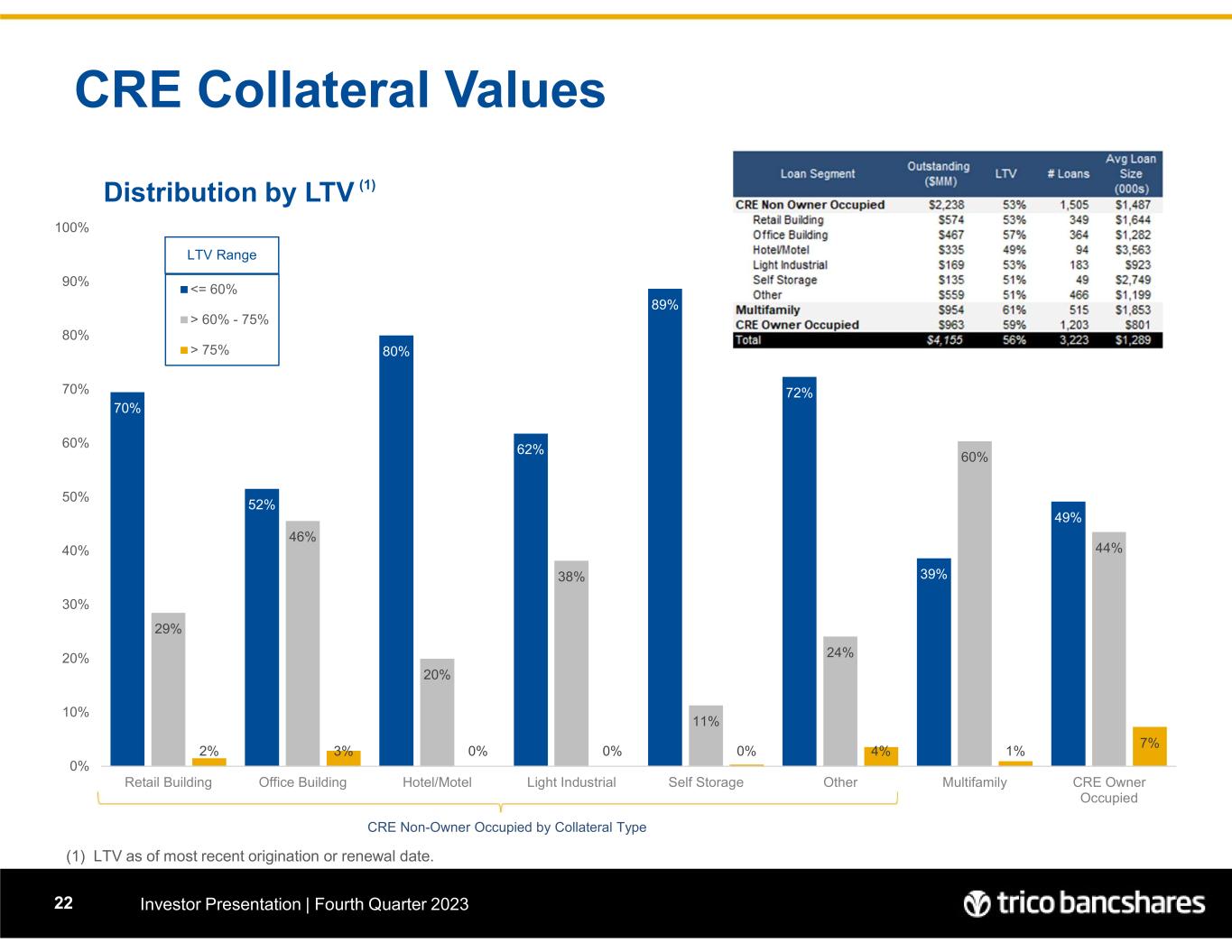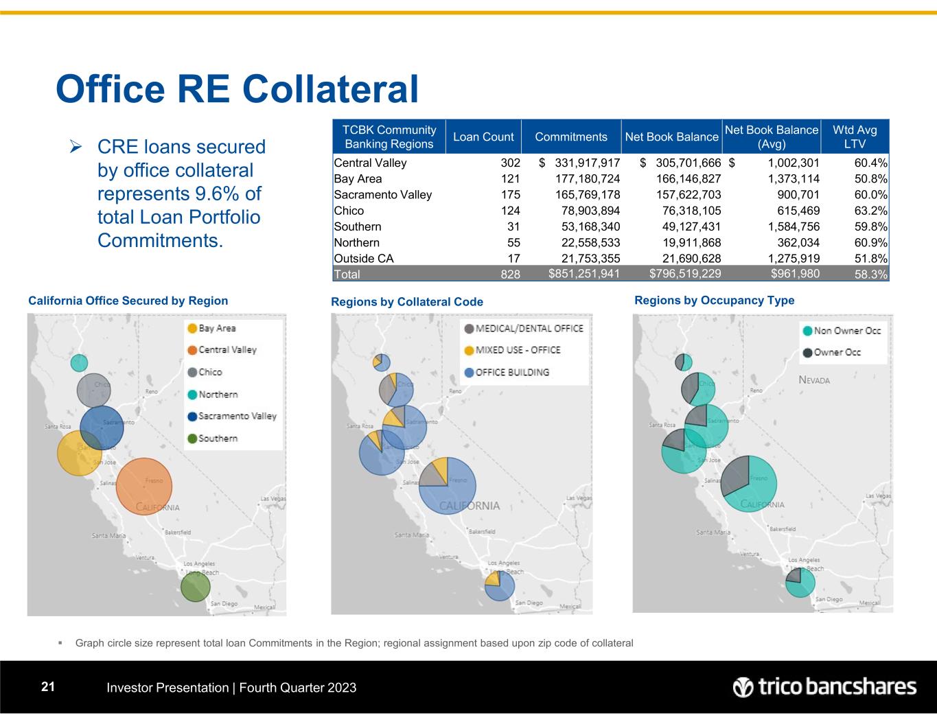 Office RE Collateral Investor Presentation | Fourth Quarter 202321  Graph circle size represent total loan Commitments in the Region; regional assignment based upon zip code of collateral  CRE loans secured by office collateral represents 9.6% of total Loan Portfolio Commitments. California Office Secured by Region Regions by Collateral Code Regions by Occupancy Type Wtd Avg LTV Net Book Balance (Avg) Net Book BalanceCommitmentsLoan Count TCBK Community Banking Regions 60.4%$ 1,002,301 $ 305,701,666 $ 331,917,917 302Central Valley 50.8%1,373,114 166,146,827 177,180,724 121Bay Area 60.0%900,701 157,622,703 165,769,178 175Sacramento Valley 63.2%615,469 76,318,105 78,903,894 124Chico 59.8%1,584,756 49,127,431 53,168,340 31Southern 60.9%362,034 19,911,868 22,558,533 55Northern 51.8%1,275,919 21,690,628 21,753,355 17Outside CA 58.3%$961,980 $796,519,229 $851,251,941 828Total