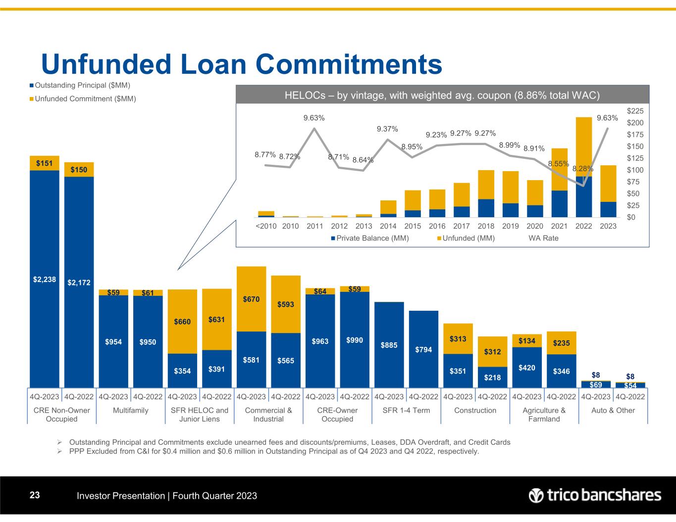 $2,238 $2,172 $954 $950 $354 $391 $581 $565 $963 $990 $885 $794 $351 $218 $420 $346 $69 $54 $151 $150 $59 $61 $660 $631 $670 $593 $64 $59 $313 $312 $134 $235 $8 $8 4Q-2023 4Q-2022 4Q-2023 4Q-2022 4Q-2023 4Q-2022 4Q-2023 4Q-2022 4Q-2023 4Q-2022 4Q-2023 4Q-2022 4Q-2023 4Q-2022 4Q-2023 4Q-2022 4Q-2023 4Q-2022 CRE Non-Owner Occupied Multifamily SFR HELOC and Junior Liens Commercial & Industrial CRE-Owner Occupied SFR 1-4 Term Construction Agriculture & Farmland Auto & Other Outstanding Principal ($MM) Unfunded Commitment ($MM) Unfunded Loan Commitments Investor Presentation | Fourth Quarter 202323 HELOCs – by vintage, with weighted avg. coupon (8.86% total WAC)  Outstanding Principal and Commitments exclude unearned fees and discounts/premiums, Leases, DDA Overdraft, and Credit Cards  PPP Excluded from C&I for $0.4 million and $0.6 million in Outstanding Principal as of Q4 2023 and Q4 2022, respectively. 7.50% 8.00% 8.50% 9.00% 9.50% 10.00% $0 $25 $50 $75 $100 $125 $150 $175 $200 $225 20232022202120202019201820172016201520142013201220112010<2010 Private Balance (MM) Unfunded (MM) WA Rate 9.63% 8.28% 8.55% 8.91%8.99% 9.27%9.27%9.23% 8.95% 9.37% 8.64%8.71% 9.63% 8.72%8.77%