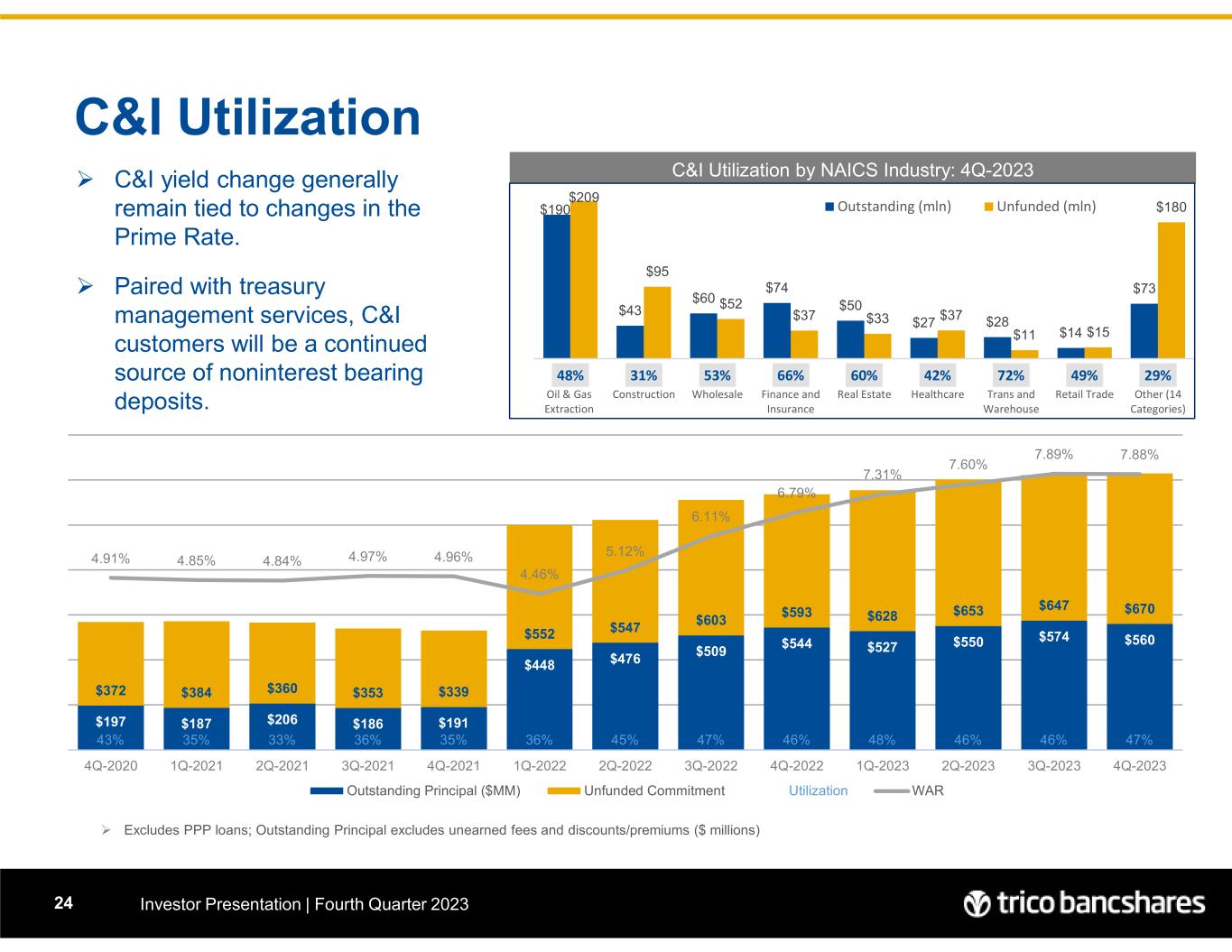 C&I Utilization Investor Presentation | Fourth Quarter 202324  Excludes PPP loans; Outstanding Principal excludes unearned fees and discounts/premiums ($ millions)  C&I yield change generally remain tied to changes in the Prime Rate.  Paired with treasury management services, C&I customers will be a continued source of noninterest bearing deposits. C&I Utilization by NAICS Industry: 4Q-2023 $197 $187 $206 $186 $191 $448 $476 $509 $544 $527 $550 $574 $560 $372 $384 $360 $353 $339 $552 $547 $603 $593 $628 $653 $647 $670 43% 35% 33% 36% 35% 36% 45% 47% 46% 48% 46% 46% 47% 4.91% 4.85% 4.84% 4.97% 4.96% 4.46% 5.12% 6.11% 6.79% 7.31% 7.60% 7.89% 7.88% 0% 1% 2% 3% 4% 5% 6% 7% 8% 9% $0 $200 $400 $600 $800 $1,000 $1,200 $1,400 4Q-2020 1Q-2021 2Q-2021 3Q-2021 4Q-2021 1Q-2022 2Q-2022 3Q-2022 4Q-2022 1Q-2023 2Q-2023 3Q-2023 4Q-2023 Outstanding Principal ($MM) Unfunded Commitment Utilization WAR $190 $43 $60 $74 $50 $27 $28 $14 $73 $209 $95 $52 $37 $33 $37 $11 $15 $180 48% 31% 53% 66% 60% 42% 72% 49% 29% 0% 5000% 10000% 15000% 20000% Oil & Gas Extraction Construction Wholesale Finance and Insurance Real Estate Healthcare Trans and Warehouse Retail Trade Other (14 Categories) Outstanding (mln) Unfunded (mln)