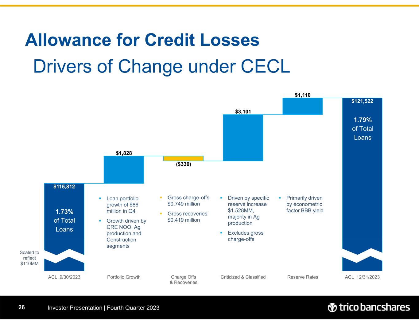 Allowance for Credit Losses Investor Presentation | Fourth Quarter 202326 Drivers of Change under CECL  Loan portfolio growth of $86 million in Q4  Growth driven by CRE NOO, Ag production and Construction segments  Primarily driven by econometric factor BBB yield  Gross charge-offs $0.749 million  Gross recoveries $0.419 million 1.73% of Total Loans 1.79% of Total Loans  Driven by specific reserve increase $1.528MM, majority in Ag production  Excludes gross charge-offs Scaled to reflect $110MM
