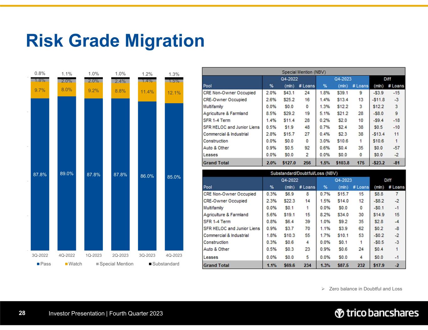 Risk Grade Migration Investor Presentation | Fourth Quarter 202328  Zero balance in Doubtful and Loss 85.0%86.0%87.8%87.8%89.0%87.8% 12.1%11.4%8.8%9.2%8.0%9.7% 1.5%1.4%2.4%2.0%2.0%1.8% 1.3%1.2%1.0%1.0%1.1%0.8% 0% 20% 40% 60% 80% 100% 4Q-20233Q-20232Q-20231Q-20234Q-20223Q-2022 Pass Watch Special Mention Substandard