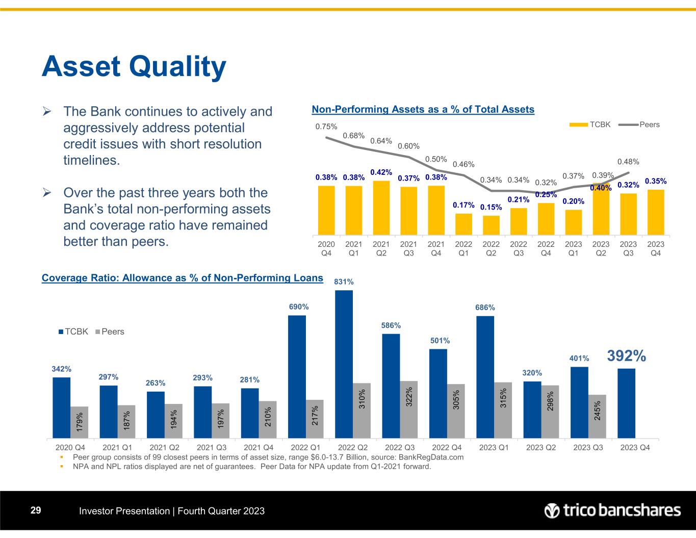 342% 297% 263% 293% 281% 690% 831% 586% 501% 686% 320% 401% 392% 1 7 9 % 1 8 7 % 1 9 4 % 1 9 7 % 2 1 0 % 2 1 7 % 3 1 0 % 3 2 2 % 3 0 5 % 3 1 5 % 2 9 8 % 2 4 5 % 2020 Q4 2021 Q1 2021 Q2 2021 Q3 2021 Q4 2022 Q1 2022 Q2 2022 Q3 2022 Q4 2023 Q1 2023 Q2 2023 Q3 2023 Q4 TCBK Peers Asset Quality Investor Presentation | Fourth Quarter 202329  Peer group consists of 99 closest peers in terms of asset size, range $6.0-13.7 Billion, source: BankRegData.com  NPA and NPL ratios displayed are net of guarantees. Peer Data for NPA update from Q1-2021 forward. Coverage Ratio: Allowance as % of Non-Performing Loans  The Bank continues to actively and aggressively address potential credit issues with short resolution timelines.  Over the past three years both the Bank’s total non-performing assets and coverage ratio have remained better than peers. Non-Performing Assets as a % of Total Assets 0.38% 0.38% 0.42% 0.37% 0.38% 0.17% 0.15% 0.21% 0.25% 0.20% 0.40% 0.32% 0.35% 0.75% 0.68% 0.64% 0.60% 0.50% 0.46% 0.34% 0.34% 0.32% 0.37% 0.39% 0.48% 2020 Q4 2021 Q1 2021 Q2 2021 Q3 2021 Q4 2022 Q1 2022 Q2 2022 Q3 2022 Q4 2023 Q1 2023 Q2 2023 Q3 2023 Q4 TCBK Peers