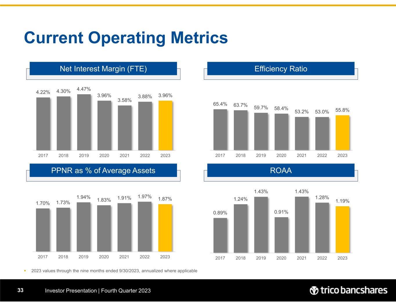 0.89% 1.24% 1.43% 0.91% 1.43% 1.28% 1.19% 2017 2018 2019 2020 2021 2022 2023 1.70% 1.73% 1.94% 1.83% 1.91% 1.97% 1.87% 2017 2018 2019 2020 2021 2022 2023 65.4% 63.7% 59.7% 58.4% 53.2% 53.0% 55.8% 2017 2018 2019 2020 2021 2022 2023 4.22% 4.30% 4.47% 3.96% 3.58% 3.88% 3.96% 2017 2018 2019 2020 2021 2022 2023 Current Operating Metrics Investor Presentation | Fourth Quarter 202333 Net Interest Margin (FTE) PPNR as % of Average Assets Efficiency Ratio ROAA  2023 values through the nine months ended 9/30/2023, annualized where applicable