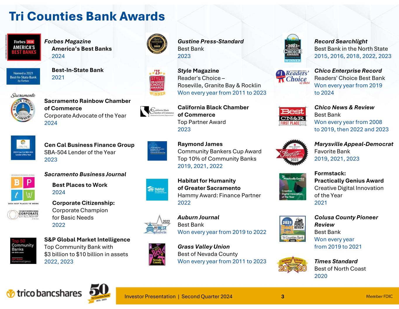 Investor Presentation | Second Quarter 2024 3 Tri Counties Bank Awards Forbes Magazine America’s Best Banks 2024 Best-In-State Bank 2021 Sacramento Rainbow Chamber of Commerce Corporate Advocate of the Year 2024 Cen Cal Business Finance Group SBA-504 Lender of the Year 2023 Sacramento Business Journal Best Places to Work 2024 Corporate Citizenship: Corporate Champion for Basic Needs 2022 S&P Global Market Intelligence Top Community Bank with $3 billion to $10 billion in assets 2022, 2023 Record Searchlight Best Bank in the North State 2015, 2016, 2018, 2022, 2023 Chico Enterprise Record Readers' Choice Best Bank Won every year from 2019 to 2024 Chico News & Review Best Bank Won every year from 2008 to 2019, then 2022 and 2023 Marysville Appeal-Democrat Favorite Bank 2019, 2021, 2023 Formstack: Practically Genius Award Creative Digital Innovation of the Year 2021 Colusa County Pioneer Review Best Bank Won every year from 2019 to 2021 Times Standard Best of North Coast 2020 Gustine Press-Standard Best Bank 2023 Style Magazine Reader's Choice – Roseville, Granite Bay & Rocklin Won every year from 2011 to 2023 California Black Chamber of Commerce Top Partner Award 2023 Raymond James Community Bankers Cup Award Top 10% of Community Banks 2019, 2021, 2022 Habitat for Humanity of Greater Sacramento Hammy Award: Finance Partner 2022 Auburn Journal Best Bank Won every year from 2019 to 2022 Grass Valley Union Best of Nevada County Won every year from 2011 to 2023