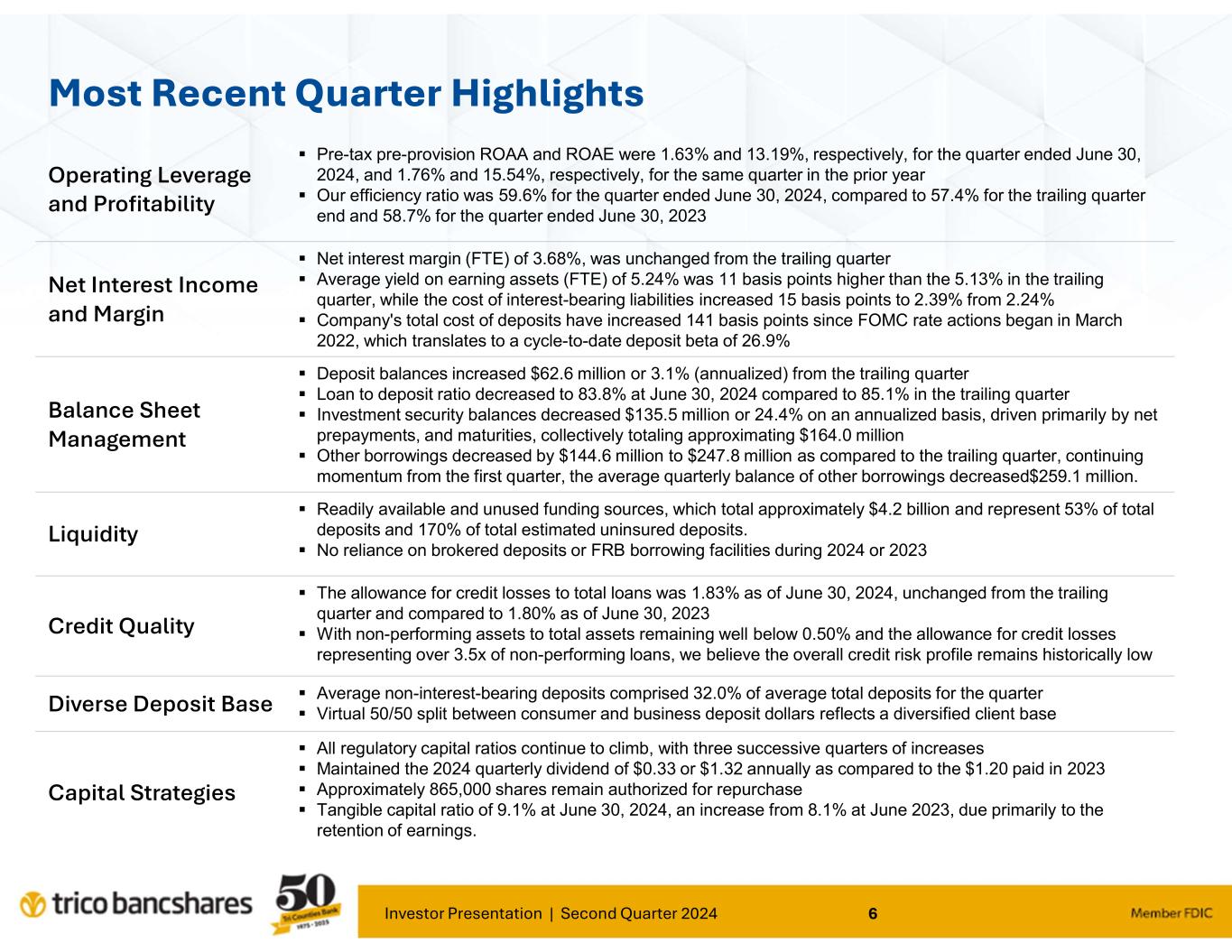 Investor Presentation | Second Quarter 2024 7 Company Overview Nasdaq: TCBK Headquarters: Chico, California Stock Price*: $39.57 Market Cap.: $1.31 Billion Asset Size: $9.74 Billion Loans: $6.74 Billion Deposits: $8.05 Billion Bank Branches: 68 ATMs: 85 Bank ATMs, with access to ~ 40,000 in network Market Area: TriCo currently serves 31 counties throughout California * As of close of business June 30, 2024