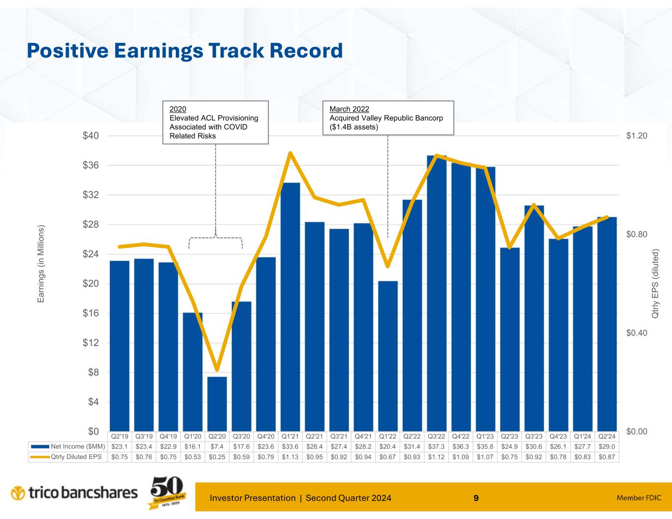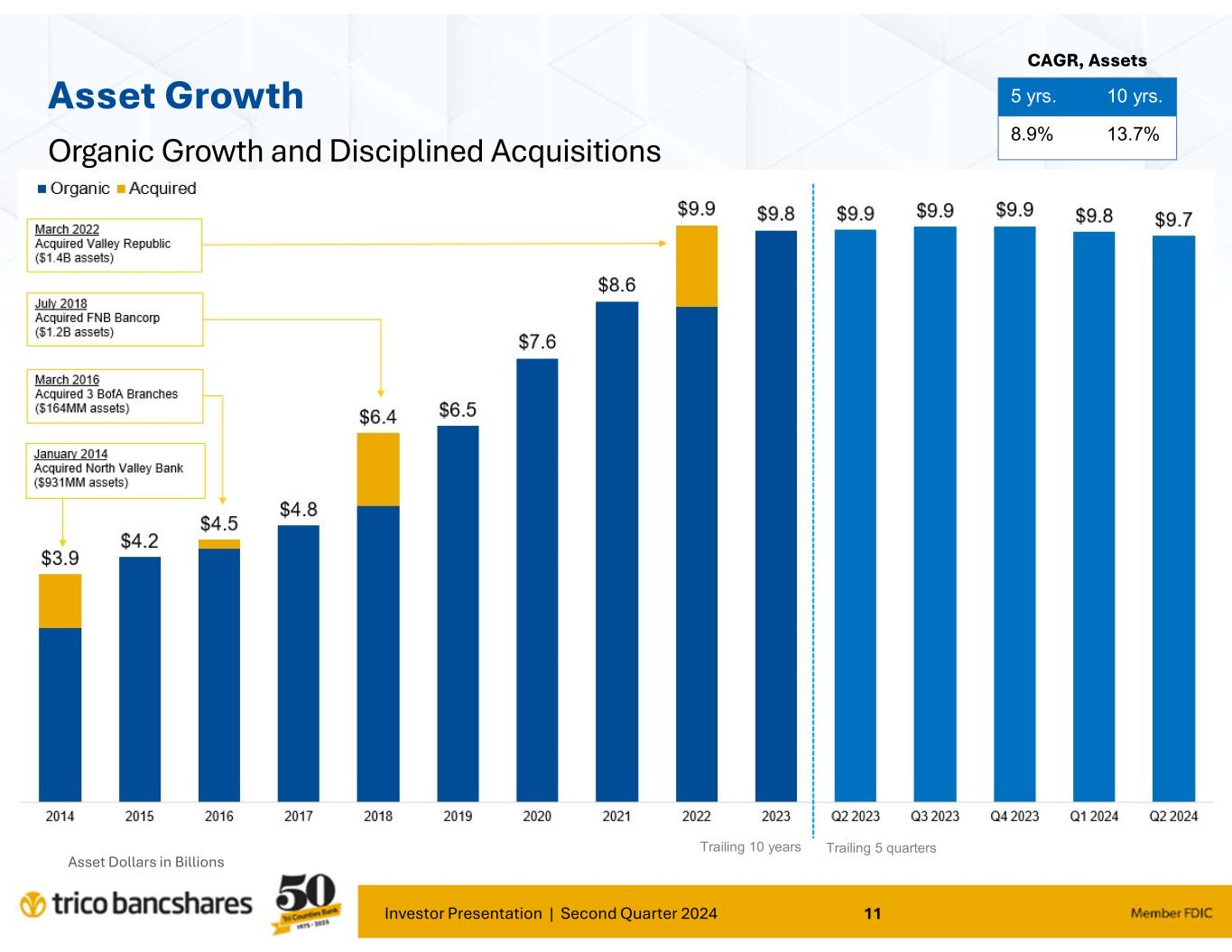 Investor Presentation | Second Quarter 2024 9 Q2'19 Q3'19 Q4'19 Q1'20 Q2'20 Q3'20 Q4'20 Q1'21 Q2'21 Q3'21 Q4'21 Q1'22 Q2'22 Q3'22 Q4'22 Q1'23 Q2'23 Q3'23 Q4'23 Q1'24 Q2'24 Net Income ($MM) $23.1 $23.4 $22.9 $16.1 $7.4 $17.6 $23.6 $33.6 $28.4 $27.4 $28.2 $20.4 $31.4 $37.3 $36.3 $35.8 $24.9 $30.6 $26.1 $27.7 $29.0 Qtrly Diluted EPS $0.75 $0.76 $0.75 $0.53 $0.25 $0.59 $0.79 $1.13 $0.95 $0.92 $0.94 $0.67 $0.93 $1.12 $1.09 $1.07 $0.75 $0.92 $0.78 $0.83 $0.87 $0.00 $0.40 $0.80 $1.20 $0 $4 $8 $12 $16 $20 $24 $28 $32 $36 $40 Q tr ly E P S ( di lu te d) E a rn in gs ( in M ill io n s) Positive Earnings Track Record March 2022 Acquired Valley Republic Bancorp ($1.4B assets) 2020 Elevated ACL Provisioning Associated with COVID Related Risks