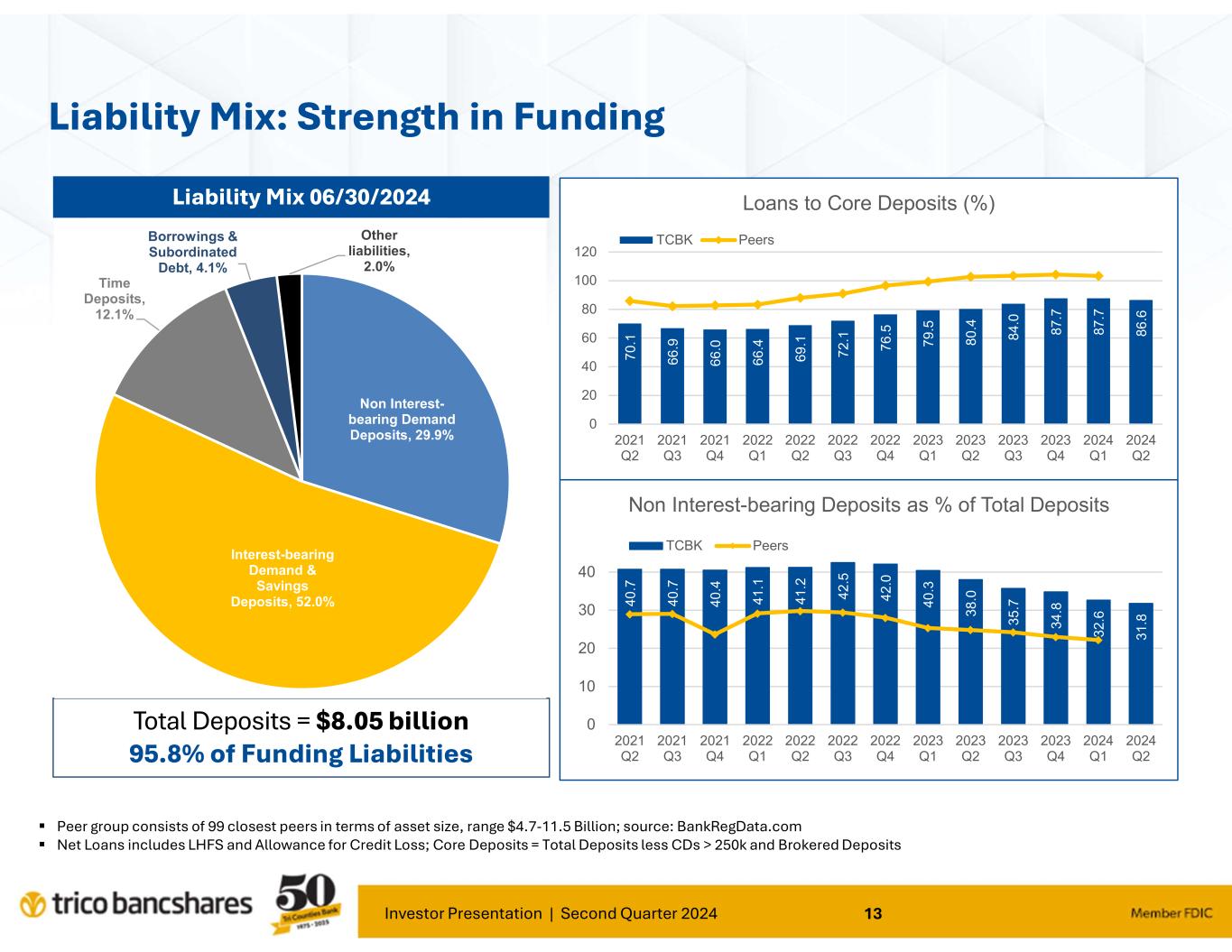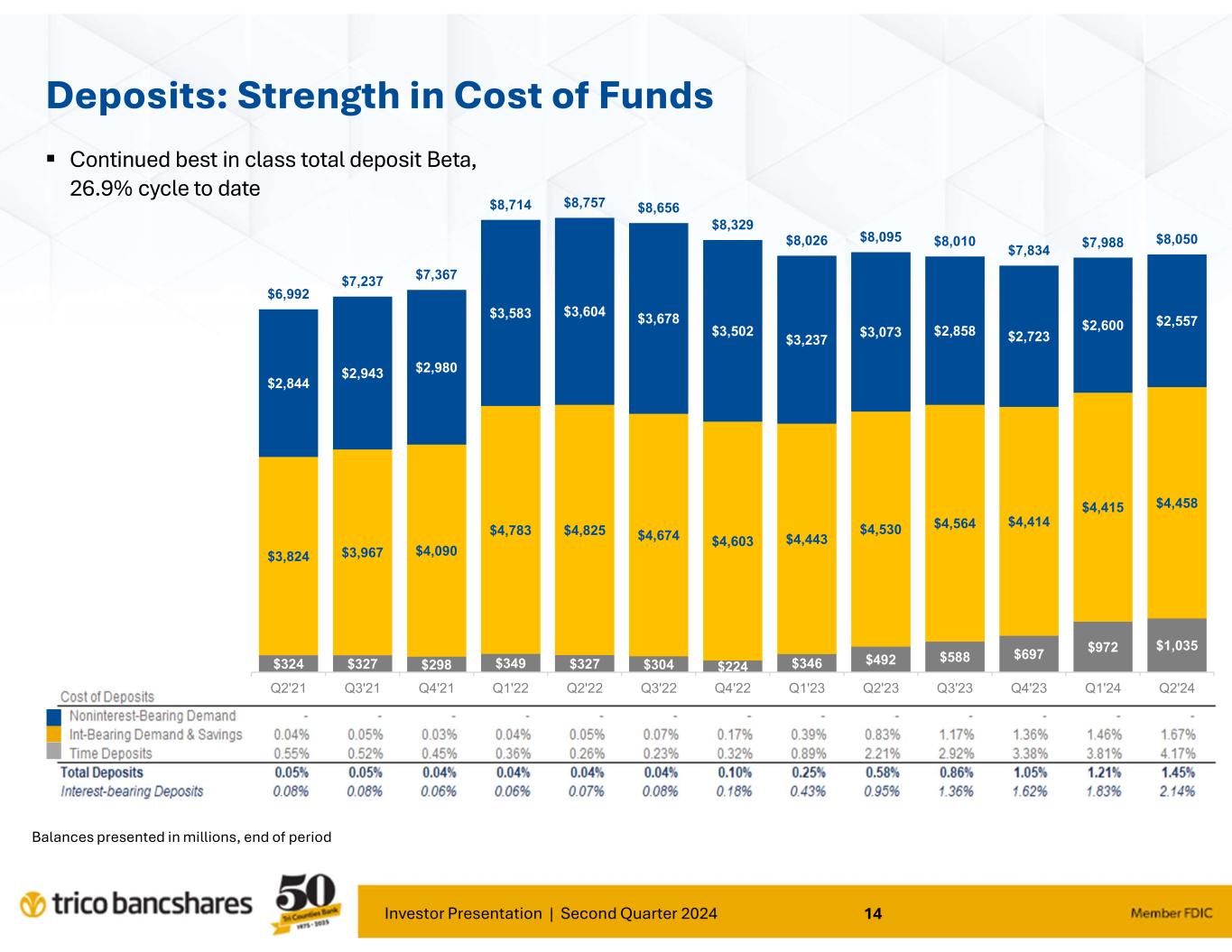 Investor Presentation | Second Quarter 2024 13 4 0 .7 4 0 .7 4 0 .4 4 1 .1 4 1 .2 4 2 .5 4 2 .0 4 0 .3 3 8 .0 3 5 .7 3 4 .8 3 2 .6 3 1 .8 0 10 20 30 40 2021 Q2 2021 Q3 2021 Q4 2022 Q1 2022 Q2 2022 Q3 2022 Q4 2023 Q1 2023 Q2 2023 Q3 2023 Q4 2024 Q1 2024 Q2 Non Interest-bearing Deposits as % of Total Deposits TCBK Peers 7 0 .1 6 6 .9 6 6 .0 6 6 .4 6 9 .1 7 2 .1 7 6 .5 7 9 .5 8 0 .4 8 4 .0 8 7 .7 8 7 .7 8 6 .6 0 20 40 60 80 100 120 2021 Q2 2021 Q3 2021 Q4 2022 Q1 2022 Q2 2022 Q3 2022 Q4 2023 Q1 2023 Q2 2023 Q3 2023 Q4 2024 Q1 2024 Q2 Loans to Core Deposits (%) TCBK Peers Liability Mix: Strength in Funding Total Deposits = $8.05 billion 95.8% of Funding Liabilities Liability Mix 06/30/2024  Peer group consists of 99 closest peers in terms of asset size, range $4.7-11.5 Billion; source: BankRegData.com  Net Loans includes LHFS and Allowance for Credit Loss; Core Deposits = Total Deposits less CDs > 250k and Brokered Deposits (0.03% Funding Cost) Non Interest- bearing Demand Deposits, 29.9% Interest-bearing Demand & Savings Deposits, 52.0% Time Deposits, 12.1% Borrowings & Subordinated Debt, 4.1% Other liabilities, 2.0%
