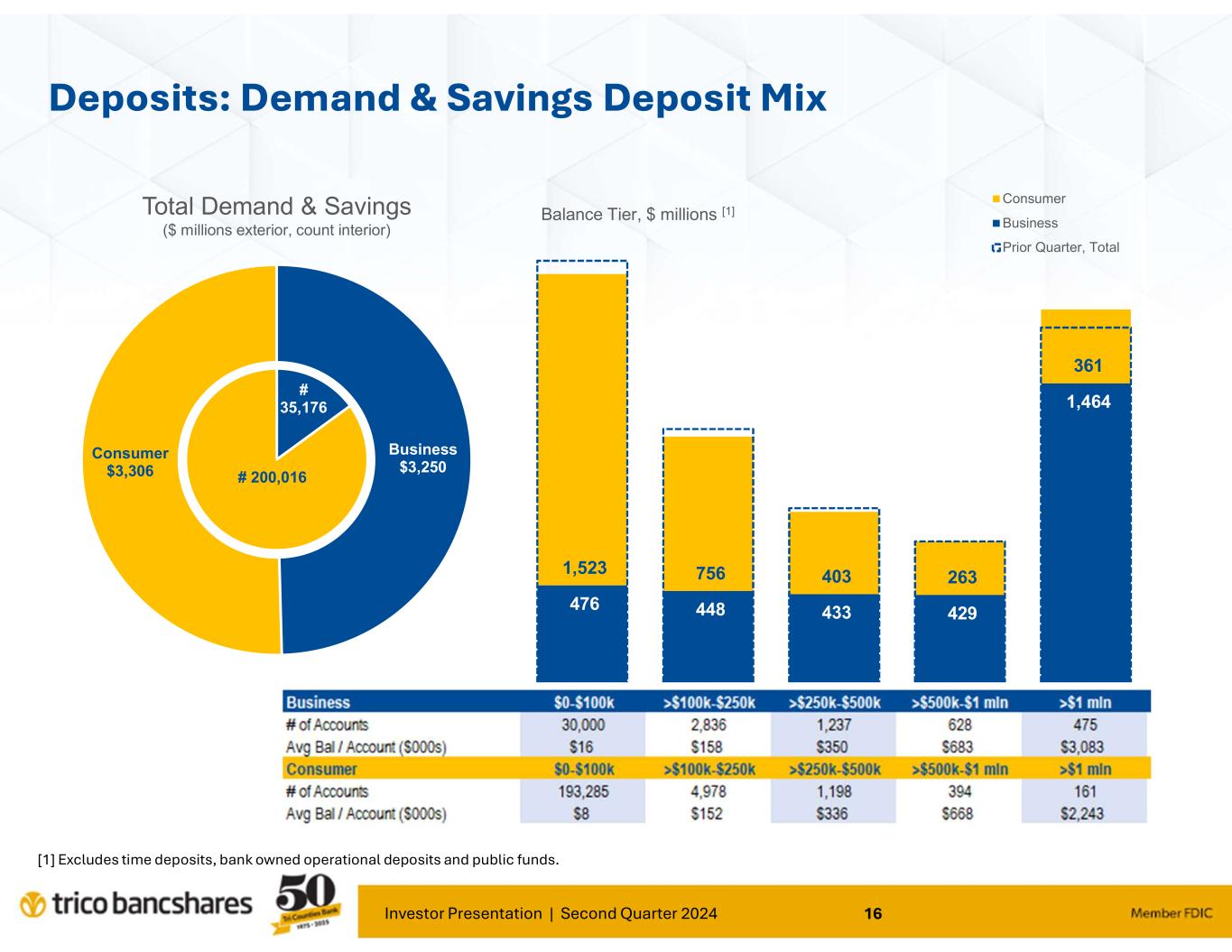 Investor Presentation | Second Quarter 2024 15 $590 $281 $154 $77 $90 - 100 200 300 400 500 600 700 800 $0-$100k >$100k-$250k >$250k - $500k >$500k - $1mln >$1mln Prior Quarter N o rt h er n $226 $193 $142 $131 $301 - 100 200 300 400 500 600 700 800 $0-$100k >$100k-$250k >$250k - $500k >$500k - $1mln >$1mln $256 $215 $199 $206 $804 - 100 200 300 400 500 600 700 800 $426 $290 $193 $148 $261 - 100 200 300 400 500 600 700 800 $822 $490 $297 $210 $425 - 100 200 300 400 500 600 700 800 G re a te r C h ic o Deposits by Region  Excludes bank owned operational deposits, public funds, and Direct Banking division.  CD Balances included in Regional pools. $1.192 billion, total $2.244 billion, total $1.318 billion, total $1.680 billion, total $0.993 billion, total S a cr am en to V a lle y C e nt ra l V a lle y B a y A re a