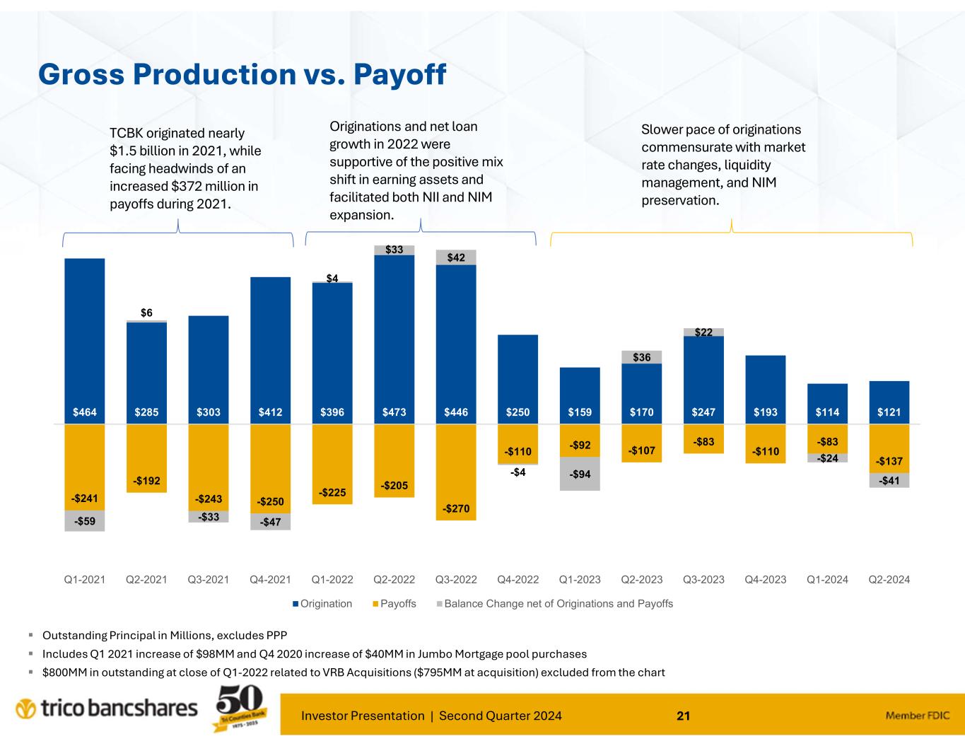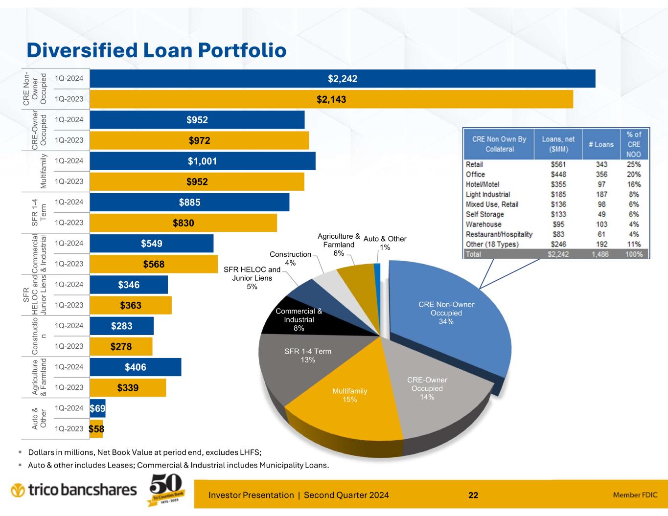 Investor Presentation | Second Quarter 2024 21 $464 $285 $303 $412 $396 $473 $446 $250 $159 $170 $247 $193 $114 $121 -$241 -$192 -$243 -$250 -$225 -$205 -$270 -$110 -$92 -$107 -$83 -$110 -$83 -$137 -$59 $6 -$33 -$47 $4 $33 $42 -$4 -$94 $36 $22 -$24 -$41 Q1-2021 Q2-2021 Q3-2021 Q4-2021 Q1-2022 Q2-2022 Q3-2022 Q4-2022 Q1-2023 Q2-2023 Q3-2023 Q4-2023 Q1-2024 Q2-2024 Origination Payoffs Balance Change net of Originations and Payoffs Gross Production vs. Payoff  Outstanding Principal in Millions, excludes PPP  Includes Q1 2021 increase of $98MM and Q4 2020 increase of $40MM in Jumbo Mortgage pool purchases  $800MM in outstanding at close of Q1-2022 related to VRB Acquisitions ($795MM at acquisition) excluded from the chart TCBK originated nearly $1.5 billion in 2021, while facing headwinds of an increased $372 million in payoffs during 2021. Originations and net loan growth in 2022 were supportive of the positive mix shift in earning assets and facilitated both NII and NIM expansion. Slower pace of originations commensurate with market rate changes, liquidity management, and NIM preservation.