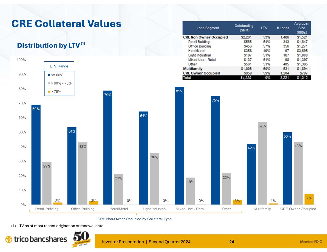 Investor Presentation | Second Quarter 2024 23 Office RE Collateral Graph circle size represent total loan Commitments in the Region; regional assignment based upon ZIP code of collateral California Office Secured by Region Regions by Collateral Code Regions by Occupancy Type TCBK Regions Loan Count Commitments Net Book Balance Per Loan Avg Book Balance Wtd Avg LTV Loan Count Commitments Net Book Balance Per Loan Avg Book Balance Wtd Avg LTV Central Valley 305 $335,966,175 $311,358,574 $1,020,848 60.6% 6 $65,673,263 $60,905,779 $10,150,963 59.4% Bay Area 123 $177,191,296 $165,241,622 $1,343,428 51.5% 6 $62,305,411 $62,036,127 $10,339,355 50.8% Sacramento Valley 175 $166,530,161 $155,236,877 $887,068 60.0% 12 $55,006,415 $51,044,572 $4,253,714 62.6% Chico 126 $79,879,103 $74,920,437 $594,607 63.2% 9 $27,732,135 $24,413,925 $2,712,658 58.4% Subtotal 729 $759,566,735 $706,757,510 $969,489 58.6% 33 $210,717,223 $198,400,404 $6,012,133 57.0% Southern 33 $52,975,093 $48,635,819 $1,473,813 59.7% Northern 51 $20,731,484 $18,280,683 $358,445 63.8% Outside CA 17 $21,965,110 $21,888,590 $1,287,564 54.6% Total Off ice RE 830 $855,238,423 $795,562,602 $958,509 58.7% Top 5 Customers w ithin Largest RegionsOffice RE Collateral