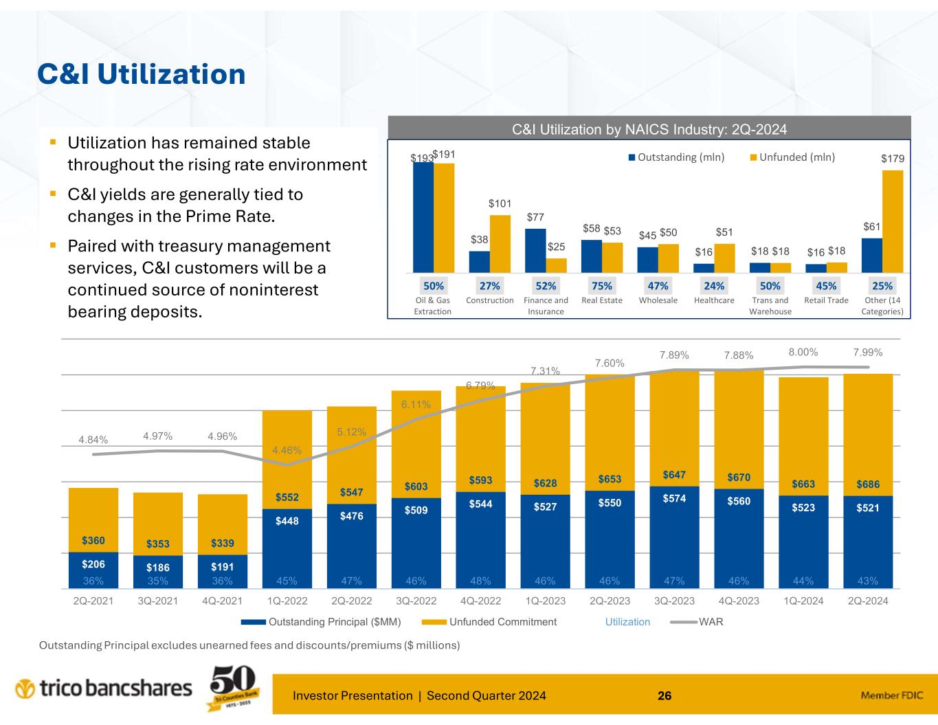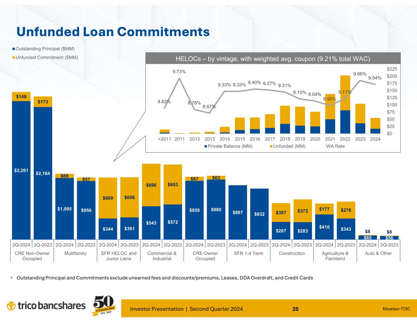 Investor Presentation | Second Quarter 2024 25 $2,261 $2,164 $1,005 $956 $344 $361 $543 $572 $959 $980 $887 $832 $287 $283 $410 $343 $65 $56 $148 $173 $69 $57 $669 $656 $696 $653 $67 $63 $307 $372 $177 $276 $8 $8 2Q-2024 2Q-2023 2Q-2024 2Q-2023 2Q-2024 2Q-2023 2Q-2024 2Q-2023 2Q-2024 2Q-2023 2Q-2024 2Q-2023 2Q-2024 2Q-2023 2Q-2024 2Q-2023 2Q-2024 2Q-2023 CRE Non-Owner Occupied Multifamily SFR HELOC and Junior Liens Commercial & Industrial CRE-Owner Occupied SFR 1-4 Term Construction Agriculture & Farmland Auto & Other Outstanding Principal ($MM) Unfunded Commitment ($MM) Unfunded Loan Commitments HELOCs – by vintage, with weighted avg. coupon (9.21% total WAC)  Outstanding Principal and Commitments exclude unearned fees and discounts/premiums, Leases, DDA Overdraft, and Credit Cards 8.00% 8.20% 8.40% 8.60% 8.80% 9.00% 9.20% 9.40% 9.60% 9.80% 10.00% $0 $25 $50 $75 $100 $125 $150 $175 $200 $225 20242023202220212020201920182017201620152014201320122011<2011 Private Balance (MM) Unfunded (MM) WA Rate 9.54% 9.66% 9.11% 8.90% 9.04%9.10% 9.31%9.37%9.40%9.33%9.33% 8.67% 8.78% 9.73% 8.82%