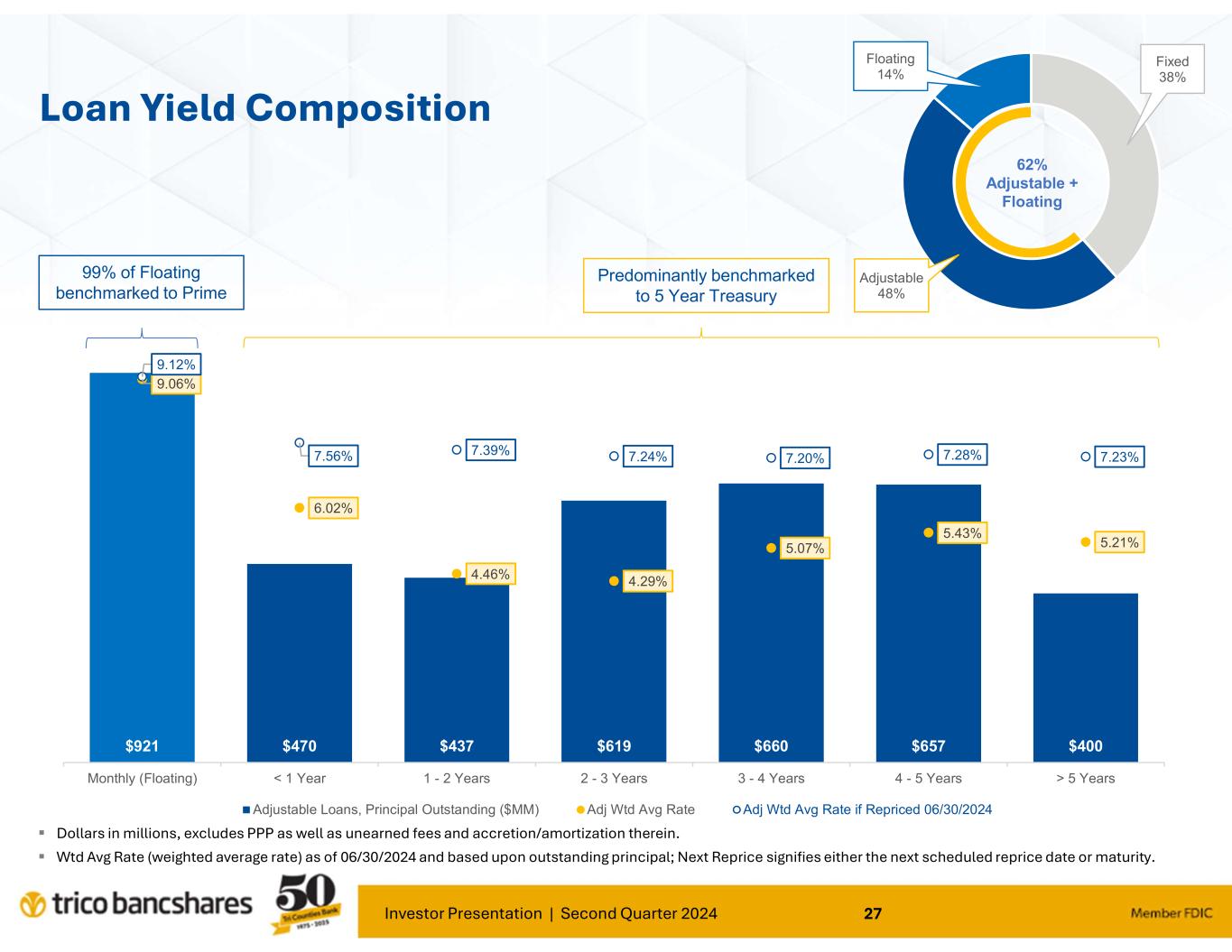 Investor Presentation | Second Quarter 2024 26 C&I Utilization Outstanding Principal excludes unearned fees and discounts/premiums ($ millions)  Utilization has remained stable throughout the rising rate environment  C&I yields are generally tied to changes in the Prime Rate.  Paired with treasury management services, C&I customers will be a continued source of noninterest bearing deposits. C&I Utilization by NAICS Industry: 2Q-2024 $206 $186 $191 $448 $476 $509 $544 $527 $550 $574 $560 $523 $521 $360 $353 $339 $552 $547 $603 $593 $628 $653 $647 $670 $663 $686 36% 35% 36% 45% 47% 46% 48% 46% 46% 47% 46% 44% 43% 4.84% 4.97% 4.96% 4.46% 5.12% 6.11% 6.79% 7.31% 7.60% 7.89% 7.88% 8.00% 7.99% 0% 1% 2% 3% 4% 5% 6% 7% 8% 9% $0 $200 $400 $600 $800 $1,000 $1,200 $1,400 2Q-2021 3Q-2021 4Q-2021 1Q-2022 2Q-2022 3Q-2022 4Q-2022 1Q-2023 2Q-2023 3Q-2023 4Q-2023 1Q-2024 2Q-2024 Outstanding Principal ($MM) Unfunded Commitment Utilization WAR $193 $38 $77 $58 $45 $16 $18 $16 $61 $191 $101 $25 $53 $50 $51 $18 $18 $179 50% 27% 52% 75% 47% 24% 50% 45% 25% 0% 5000% 10000% 15000% 20000% Oil & Gas Extraction Construction Finance and Insurance Real Estate Wholesale Healthcare Trans and Warehouse Retail Trade Other (14 Categories) Outstanding (mln) Unfunded (mln)