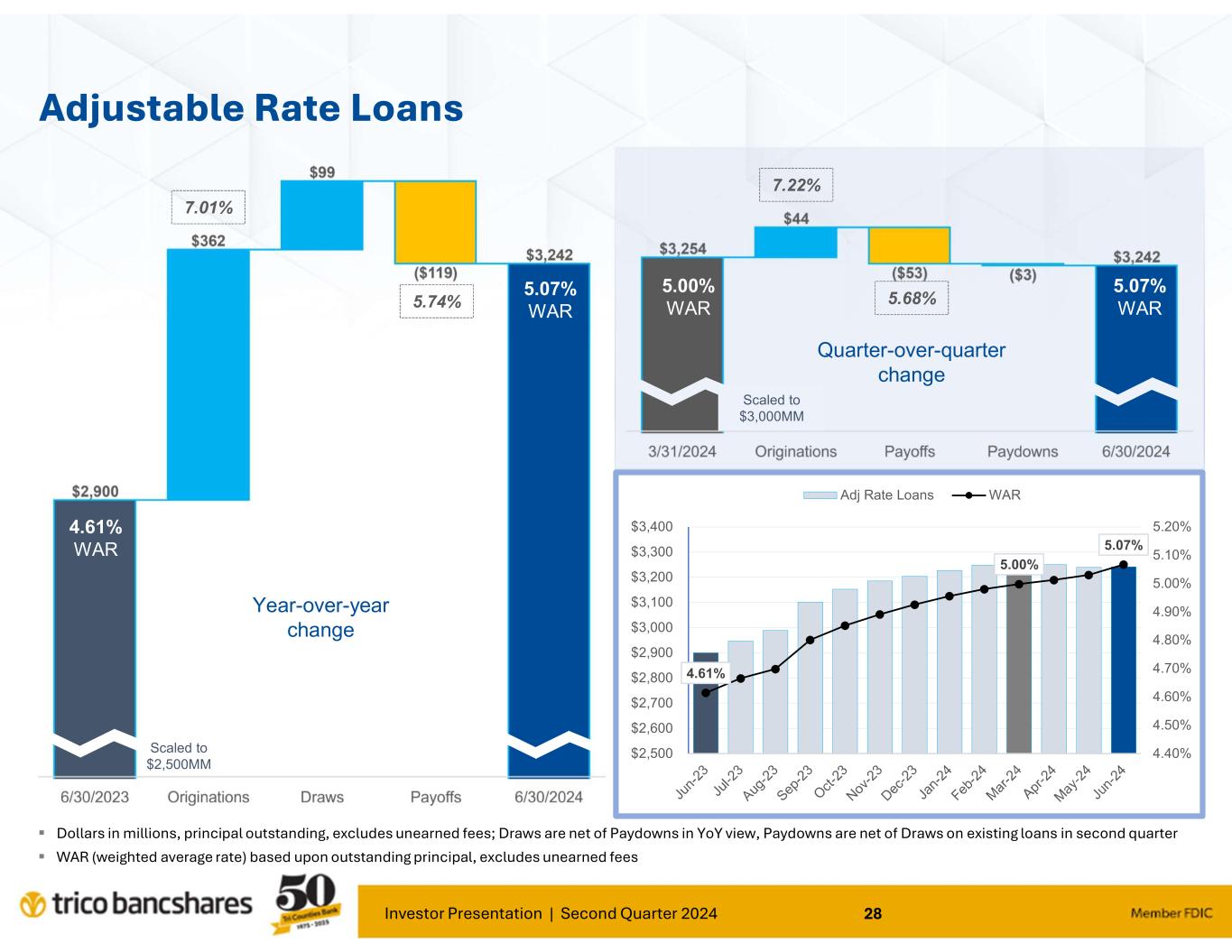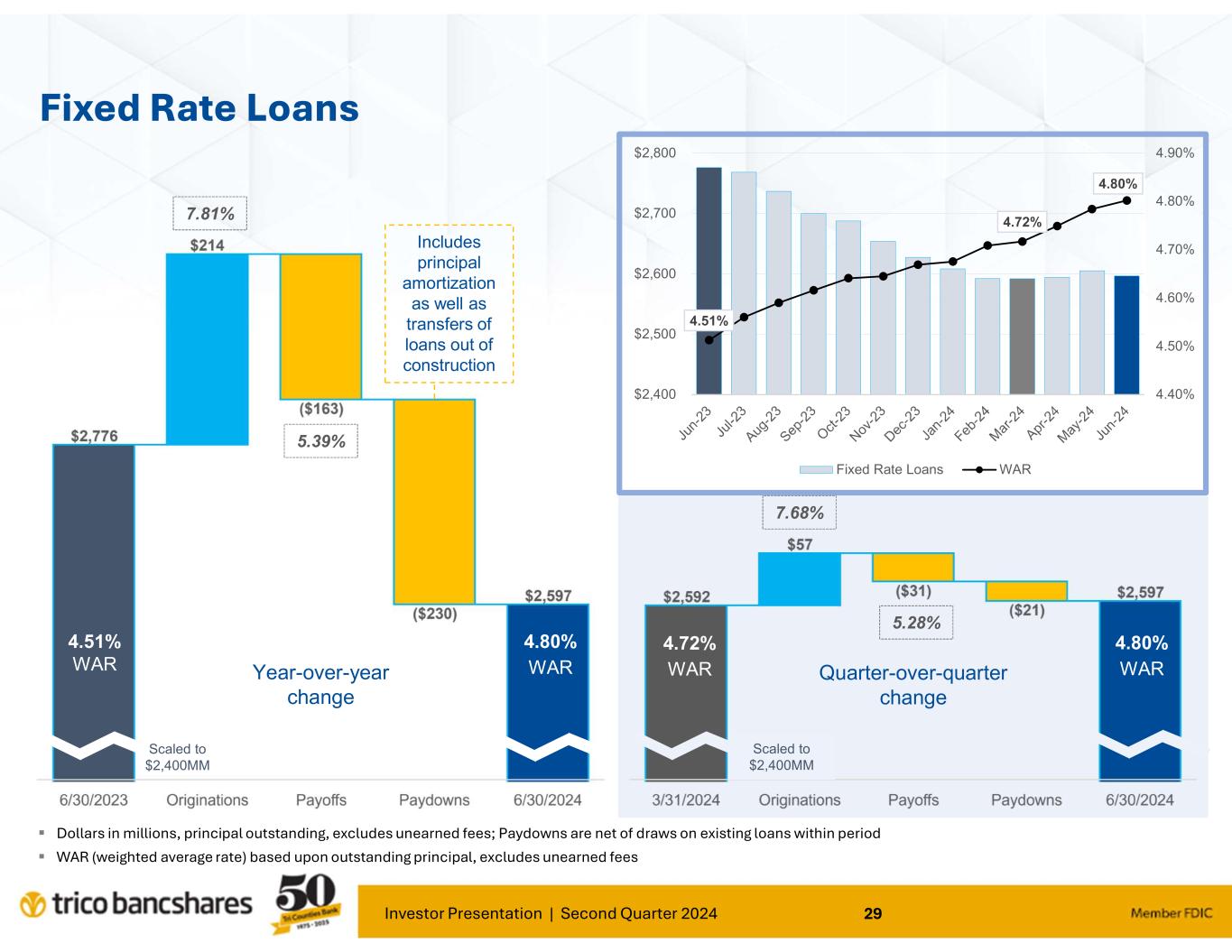 Investor Presentation | Second Quarter 2024 29 Fixed Rate Loans  Dollars in millions, principal outstanding, excludes unearned fees; Paydowns are net of draws on existing loans within period  WAR (weighted average rate) based upon outstanding principal, excludes unearned fees Year-over-year change Quarter-over-quarter change Scaled to $2,400MM Scaled to $2,400MM 4.51% WAR 4.80% WAR 4.80% WAR 4.72% WAR 4.51% 4.72% 4.80% 4.40% 4.50% 4.60% 4.70% 4.80% 4.90% $2,400 $2,500 $2,600 $2,700 $2,800 Fixed Rate Loans WAR 7.81% 5.39% 7.68% 5.28% Includes principal amortization as well as transfers of loans out of construction