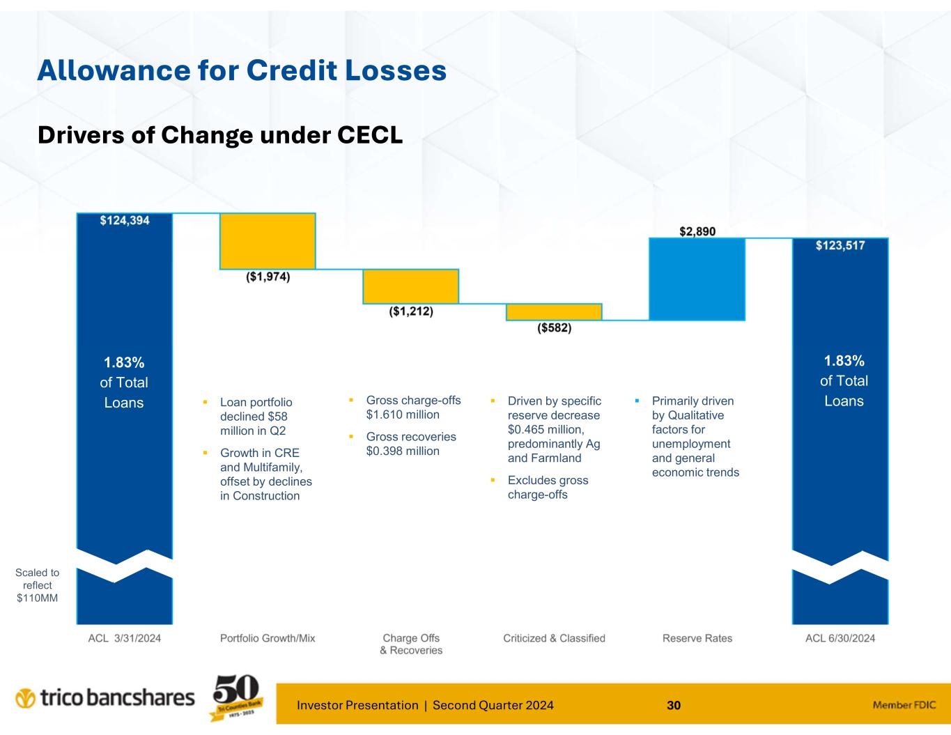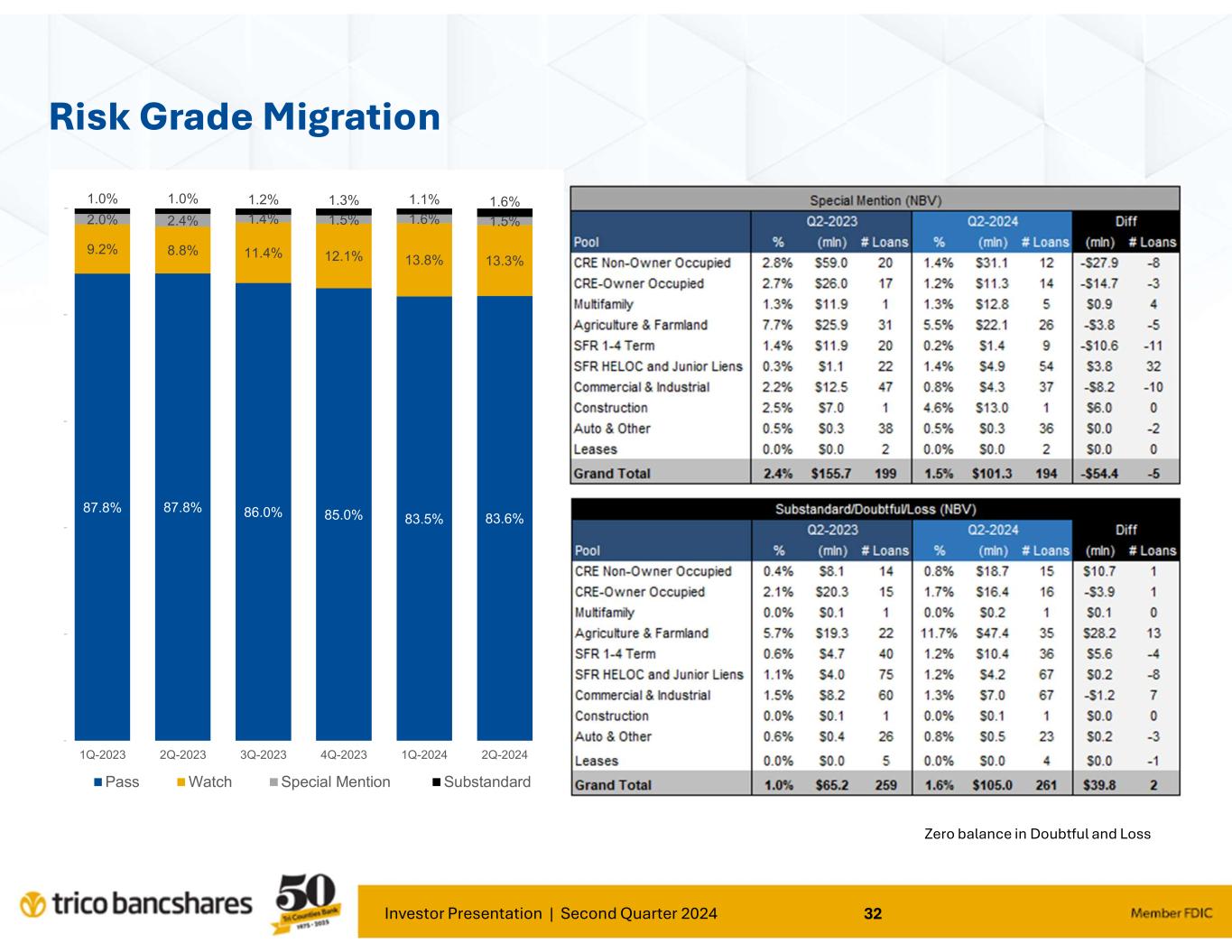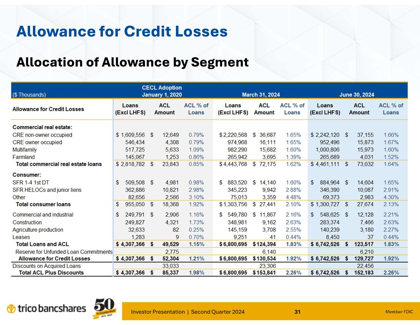 Investor Presentation | Second Quarter 2024 30 Allowance for Credit Losses Drivers of Change under CECL  Loan portfolio declined $58 million in Q2  Growth in CRE and Multifamily, offset by declines in Construction  Primarily driven by Qualitative factors for unemployment and general economic trends  Gross charge-offs $1.610 million  Gross recoveries $0.398 million 1.83% of Total Loans 1.83% of Total Loans Driven by specific reserve decrease $0.465 million, predominantly Ag and Farmland  Excludes gross charge-offs Scaled to reflect $110MM