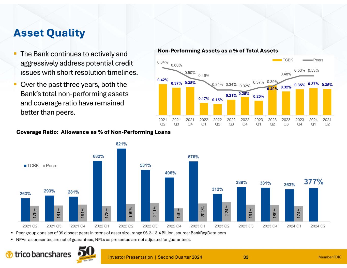 Investor Presentation | Second Quarter 2024 33 263% 293% 281% 682% 821% 581% 496% 676% 312% 389% 381% 363% 377% 17 9% 18 1% 19 1% 17 8% 19 9% 21 1% 14 9% 20 4% 22 4% 19 1% 18 9% 17 4% 2021 Q2 2021 Q3 2021 Q4 2022 Q1 2022 Q2 2022 Q3 2022 Q4 2023 Q1 2023 Q2 2023 Q3 2023 Q4 2024 Q1 2024 Q2 TCBK Peers  Peer group consists of 99 closest peers in terms of asset size, range $6.2-13.4 Billion, source: BankRegData.com  NPAs as presented are net of guarantees, NPLs as presented are not adjusted for guarantees. Asset Quality  The Bank continues to actively and aggressively address potential credit issues with short resolution timelines.  Over the past three years, both the Bank’s total non-performing assets and coverage ratio have remained better than peers. Non-Performing Assets as a % of Total Assets Coverage Ratio: Allowance as % of Non-Performing Loans 0.42% 0.37% 0.38% 0.17% 0.15% 0.21% 0.25% 0.20% 0.40% 0.32% 0.35% 0.37% 0.35% 0.64% 0.60% 0.50% 0.46% 0.34% 0.34% 0.32% 0.37% 0.39% 0.48% 0.53% 0.53% 2021 Q2 2021 Q3 2021 Q4 2022 Q1 2022 Q2 2022 Q3 2022 Q4 2023 Q1 2023 Q2 2023 Q3 2023 Q4 2024 Q1 2024 Q2 TCBK Peers