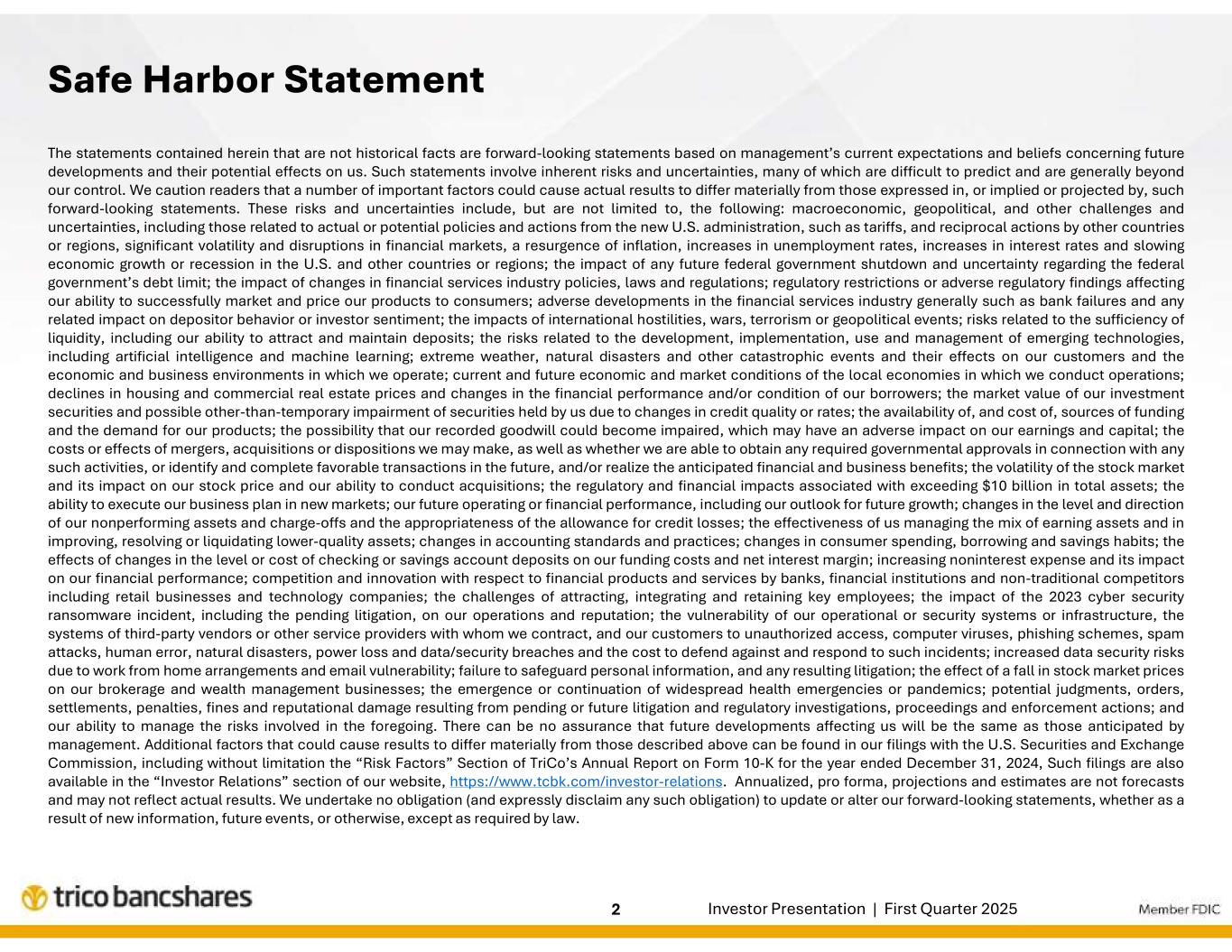 Investor Presentation | First Quarter 20252 Safe Harbor Statement The statements contained herein that are not historical facts are forward-looking statements based on management’s current expectations and beliefs concerning future developments and their potential effects on us. Such statements involve inherent risks and uncertainties, many of which are difficult to predict and are generally beyond our control. We caution readers that a number of important factors could cause actual results to differ materially from those expressed in, or implied or projected by, such forward-looking statements. These risks and uncertainties include, but are not limited to, the following: macroeconomic, geopolitical, and other challenges and uncertainties, including those related to actual or potential policies and actions from the new U.S. administration, such as tariffs, and reciprocal actions by other countries or regions, significant volatility and disruptions in financial markets, a resurgence of inflation, increases in unemployment rates, increases in interest rates and slowing economic growth or recession in the U.S. and other countries or regions; the impact of any future federal government shutdown and uncertainty regarding the federal government’s debt limit; the impact of changes in financial services industry policies, laws and regulations; regulatory restrictions or adverse regulatory findings affecting our ability to successfully market and price our products to consumers; adverse developments in the financial services industry generally such as bank failures and any related impact on depositor behavior or investor sentiment; the impacts of international hostilities, wars, terrorism or geopolitical events; risks related to the sufficiency of liquidity, including our ability to attract and maintain deposits; the risks related to the development, implementation, use and management of emerging technologies, including artificial intelligence and machine learning; extreme weather, natural disasters and other catastrophic events and their effects on our customers and the economic and business environments in which we operate; current and future economic and market conditions of the local economies in which we conduct operations; declines in housing and commercial real estate prices and changes in the financial performance and/or condition of our borrowers; the market value of our investment securities and possible other-than-temporary impairment of securities held by us due to changes in credit quality or rates; the availability of, and cost of, sources of funding and the demand for our products; the possibility that our recorded goodwill could become impaired, which may have an adverse impact on our earnings and capital; the costs or effects of mergers, acquisitions or dispositions we may make, as well as whether we are able to obtain any required governmental approvals in connection with any such activities, or identify and complete favorable transactions in the future, and/or realize the anticipated financial and business benefits; the volatility of the stock market and its impact on our stock price and our ability to conduct acquisitions; the regulatory and financial impacts associated with exceeding $10 billion in total assets; the ability to execute our business plan in new markets; our future operating or financial performance, including our outlook for future growth; changes in the level and direction of our nonperforming assets and charge-offs and the appropriateness of the allowance for credit losses; the effectiveness of us managing the mix of earning assets and in improving, resolving or liquidating lower-quality assets; changes in accounting standards and practices; changes in consumer spending, borrowing and savings habits; the effects of changes in the level or cost of checking or savings account deposits on our funding costs and net interest margin; increasing noninterest expense and its impact on our financial performance; competition and innovation with respect to financial products and services by banks, financial institutions and non-traditional competitors including retail businesses and technology companies; the challenges of attracting, integrating and retaining key employees; the impact of the 2023 cyber security ransomware incident, including the pending litigation, on our operations and reputation; the vulnerability of our operational or security systems or infrastructure, the systems of third-party vendors or other service providers with whom we contract, and our customers to unauthorized access, computer viruses, phishing schemes, spam attacks, human error, natural disasters, power loss and data/security breaches and the cost to defend against and respond to such incidents; increased data security risks due to work from home arrangements and email vulnerability; failure to safeguard personal information, and any resulting litigation; the effect of a fall in stock market prices on our brokerage and wealth management businesses; the emergence or continuation of widespread health emergencies or pandemics; potential judgments, orders, settlements, penalties, fines and reputational damage resulting from pending or future litigation and regulatory investigations, proceedings and enforcement actions; and our ability to manage the risks involved in the foregoing. There can be no assurance that future developments affecting us will be the same as those anticipated by management. Additional factors that could cause results to differ materially from those described above can be found in our filings with the U.S. Securities and Exchange Commission, including without limitation the “Risk Factors” Section of TriCo’s Annual Report on Form 10-K for the year ended December 31, 2024, Such filings are also available in the “Investor Relations” section of our website, https://www.tcbk.com/investor-relations. Annualized, pro forma, projections and estimates are not forecasts 