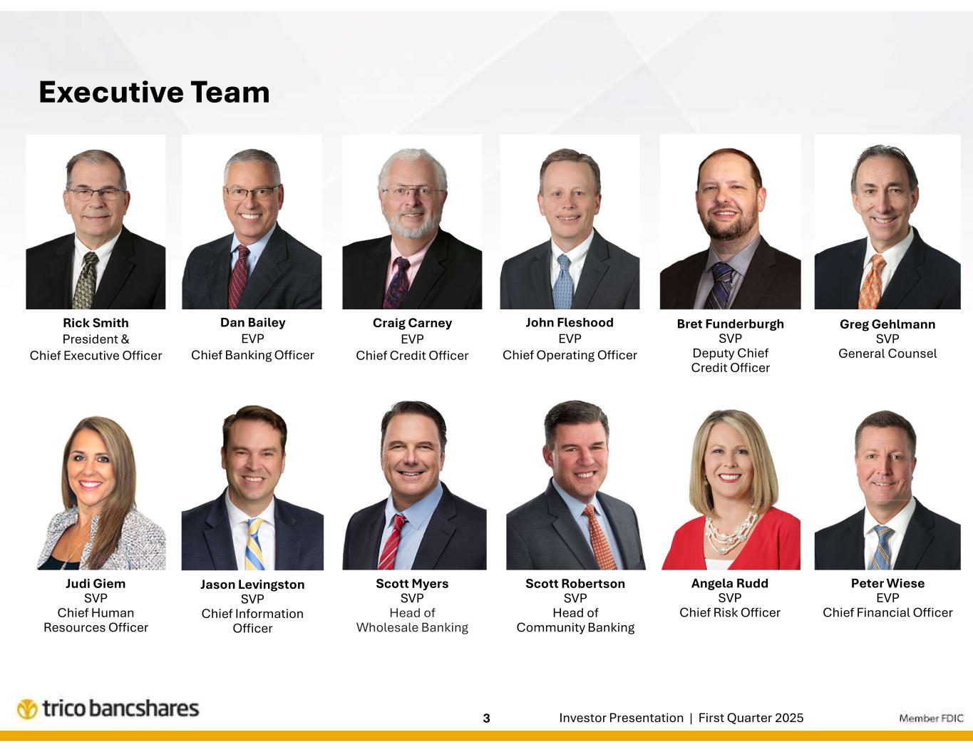 Investor Presentation | First Quarter 20252 Safe Harbor Statement The statements contained herein that are not historical facts are forward-looking statements based on management’s current expectations and beliefs concerning future developments and their potential effects on us. Such statements involve inherent risks and uncertainties, many of which are difficult to predict and are generally beyond our control. We caution readers that a number of important factors could cause actual results to differ materially from those expressed in, or implied or projected by, such forward-looking statements. These risks and uncertainties include, but are not limited to, the following: macroeconomic, geopolitical, and other challenges and uncertainties, including those related to actual or potential policies and actions from the new U.S. administration, such as tariffs, and reciprocal actions by other countries or regions, significant volatility and disruptions in financial markets, a resurgence of inflation, increases in unemployment rates, increases in interest rates and slowing economic growth or recession in the U.S. and other countries or regions; the impact of any future federal government shutdown and uncertainty regarding the federal government’s debt limit; the impact of changes in financial services industry policies, laws and regulations; regulatory restrictions or adverse regulatory findings affecting our ability to successfully market and price our products to consumers; adverse developments in the financial services industry generally such as bank failures and any related impact on depositor behavior or investor sentiment; the impacts of international hostilities, wars, terrorism or geopolitical events; risks related to the sufficiency of liquidity, including our ability to attract and maintain deposits; the risks related to the development, implementation, use and management of emerging technologies, including artificial intelligence and machine learning; extreme weather, natural disasters and other catastrophic events and their effects on our customers and the economic and business environments in which we operate; current and future economic and market conditions of the local economies in which we conduct operations; declines in housing and commercial real estate prices and changes in the financial performance and/or condition of our borrowers; the market value of our investment securities and possible other-than-temporary impairment of securities held by us due to changes in credit quality or rates; the availability of, and cost of, sources of funding and the demand for our products; the possibility that our recorded goodwill could become impaired, which may have an adverse impact on our earnings and capital; the costs or effects of mergers, acquisitions or dispositions we may make, as well as whether we are able to obtain any required governmental approvals in connection with any such activities, or identify and complete favorable transactions in the future, and/or realize the anticipated financial and business benefits; the volatility of the stock market and its impact on our stock price and our ability to conduct acquisitions; the regulatory and financial impacts associated with exceeding $10 billion in total assets; the ability to execute our business plan in new markets; our future operating or financial performance, including our outlook for future growth; changes in the level and direction of our nonperforming assets and charge-offs and the appropriateness of the allowance for credit losses; the effectiveness of us managing the mix of earning assets and in improving, resolving or liquidating lower-quality assets; changes in accounting standards and practices; changes in consumer spending, borrowing and savings habits; the effects of changes in the level or cost of checking or savings account deposits on our funding costs and net interest margin; increasing noninterest expense and its impact on our financial performance; competition and innovation with respect to financial products and services by banks, financial institutions and non-traditional competitors including retail businesses and technology companies; the challenges of attracting, integrating and retaining key employees; the impact of the 2023 cyber security ransomware incident, including the pending litigation, on our operations and reputation; the vulnerability of our operational or security systems or infrastructure, the systems of third-party vendors or other service providers with whom we contract, and our customers to unauthorized access, computer viruses, phishing schemes, spam attacks, human error, natural disasters, power loss and data/security breaches and the cost to defend against and respond to such incidents; increased data security risks due to work from home arrangements and email vulnerability; failure to safeguard personal information, and any resulting litigation; the effect of a fall in stock market prices on our brokerage and wealth management businesses; the emergence or continuation of widespread health emergencies or pandemics; potential judgments, orders, settlements, penalties, fines and reputational damage resulting from pending or future litigation and regulatory investigations, proceedings and enforcement actions; and our ability to manage the risks involved in the foregoing. There can be no assurance that future developments affecting us will be the same as those anticipated by management. Additional factors that could cause results to differ materially from those described above can be found in our filings with the U.S. Securities and Exchange Commission, including without limitation the “Risk Factors” Section of TriCo’s Annual Report on Form 10-K for the year ended December 31, 2024, Such filings are also available in the “Investor Relations” section of our website, https://www.tcbk.com/investor-relations. Annualized, pro forma, projections and estimates are not forecasts 