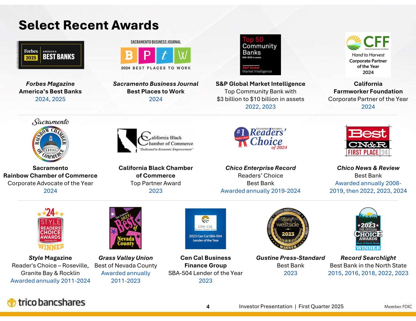 Investor Presentation | First Quarter 20252 Safe Harbor Statement The statements contained herein that are not historical facts are forward-looking statements based on management’s current expectations and beliefs concerning future developments and their potential effects on us. Such statements involve inherent risks and uncertainties, many of which are difficult to predict and are generally beyond our control. We caution readers that a number of important factors could cause actual results to differ materially from those expressed in, or implied or projected by, such forward-looking statements. These risks and uncertainties include, but are not limited to, the following: macroeconomic, geopolitical, and other challenges and uncertainties, including those related to actual or potential policies and actions from the new U.S. administration, such as tariffs, and reciprocal actions by other countries or regions, significant volatility and disruptions in financial markets, a resurgence of inflation, increases in unemployment rates, increases in interest rates and slowing economic growth or recession in the U.S. and other countries or regions; the impact of any future federal government shutdown and uncertainty regarding the federal government’s debt limit; the impact of changes in financial services industry policies, laws and regulations; regulatory restrictions or adverse regulatory findings affecting our ability to successfully market and price our products to consumers; adverse developments in the financial services industry generally such as bank failures and any related impact on depositor behavior or investor sentiment; the impacts of international hostilities, wars, terrorism or geopolitical events; risks related to the sufficiency of liquidity, including our ability to attract and maintain deposits; the risks related to the development, implementation, use and management of emerging technologies, including artificial intelligence and machine learning; extreme weather, natural disasters and other catastrophic events and their effects on our customers and the economic and business environments in which we operate; current and future economic and market conditions of the local economies in which we conduct operations; declines in housing and commercial real estate prices and changes in the financial performance and/or condition of our borrowers; the market value of our investment securities and possible other-than-temporary impairment of securities held by us due to changes in credit quality or rates; the availability of, and cost of, sources of funding and the demand for our products; the possibility that our recorded goodwill could become impaired, which may have an adverse impact on our earnings and capital; the costs or effects of mergers, acquisitions or dispositions we may make, as well as whether we are able to obtain any required governmental approvals in connection with any such activities, or identify and complete favorable transactions in the future, and/or realize the anticipated financial and business benefits; the volatility of the stock market and its impact on our stock price and our ability to conduct acquisitions; the regulatory and financial impacts associated with exceeding $10 billion in total assets; the ability to execute our business plan in new markets; our future operating or financial performance, including our outlook for future growth; changes in the level and direction of our nonperforming assets and charge-offs and the appropriateness of the allowance for credit losses; the effectiveness of us managing the mix of earning assets and in improving, resolving or liquidating lower-quality assets; changes in accounting standards and practices; changes in consumer spending, borrowing and savings habits; the effects of changes in the level or cost of checking or savings account deposits on our funding costs and net interest margin; increasing noninterest expense and its impact on our financial performance; competition and innovation with respect to financial products and services by banks, financial institutions and non-traditional competitors including retail businesses and technology companies; the challenges of attracting, integrating and retaining key employees; the impact of the 2023 cyber security ransomware incident, including the pending litigation, on our operations and reputation; the vulnerability of our operational or security systems or infrastructure, the systems of third-party vendors or other service providers with whom we contract, and our customers to unauthorized access, computer viruses, phishing schemes, spam attacks, human error, natural disasters, power loss and data/security breaches and the cost to defend against and respond to such incidents; increased data security risks due to work from home arrangements and email vulnerability; failure to safeguard personal information, and any resulting litigation; the effect of a fall in stock market prices on our brokerage and wealth management businesses; the emergence or continuation of widespread health emergencies or pandemics; potential judgments, orders, settlements, penalties, fines and reputational damage resulting from pending or future litigation and regulatory investigations, proceedings and enforcement actions; and our ability to manage the risks involved in the foregoing. There can be no assurance that future developments affecting us will be the same as those anticipated by management. Additional factors that could cause results to differ materially from those described above can be found in our filings with the U.S. Securities and Exchange Commission, including without limitation the “Risk Factors” Section of TriCo’s Annual Report on Form 10-K for the year ended December 31, 2024, Such filings are also available in the “Investor Relations” section of our website, https://www.tcbk.com/investor-relations. Annualized, pro forma, projections and estimates are not forecasts 