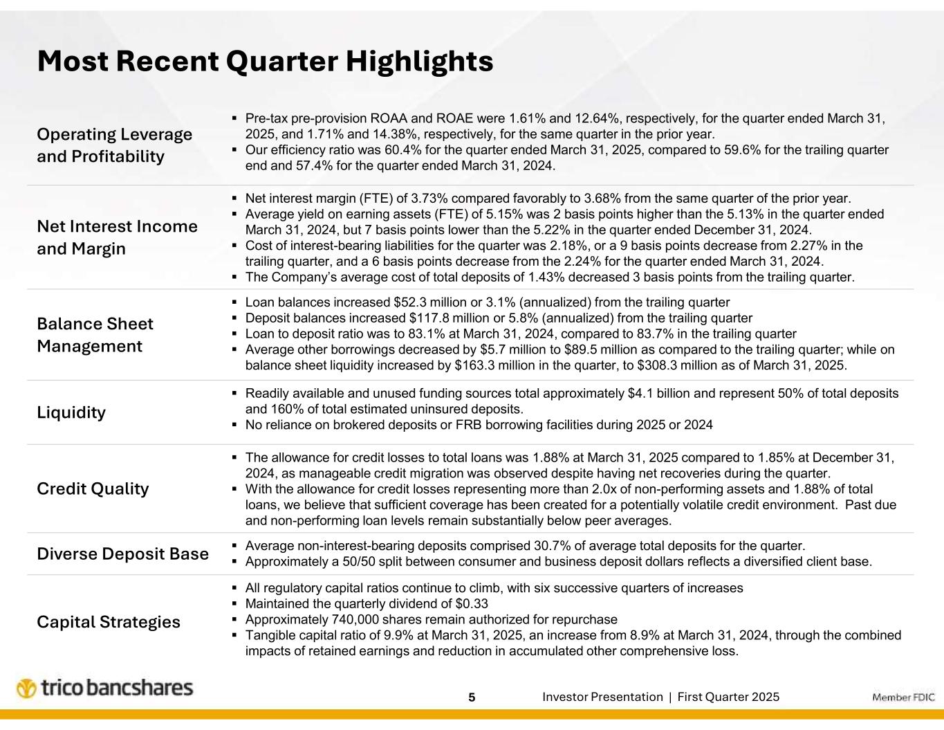 Investor Presentation | First Quarter 20252 Safe Harbor Statement The statements contained herein that are not historical facts are forward-looking statements based on management’s current expectations and beliefs concerning future developments and their potential effects on us. Such statements involve inherent risks and uncertainties, many of which are difficult to predict and are generally beyond our control. We caution readers that a number of important factors could cause actual results to differ materially from those expressed in, or implied or projected by, such forward-looking statements. These risks and uncertainties include, but are not limited to, the following: macroeconomic, geopolitical, and other challenges and uncertainties, including those related to actual or potential policies and actions from the new U.S. administration, such as tariffs, and reciprocal actions by other countries or regions, significant volatility and disruptions in financial markets, a resurgence of inflation, increases in unemployment rates, increases in interest rates and slowing economic growth or recession in the U.S. and other countries or regions; the impact of any future federal government shutdown and uncertainty regarding the federal government’s debt limit; the impact of changes in financial services industry policies, laws and regulations; regulatory restrictions or adverse regulatory findings affecting our ability to successfully market and price our products to consumers; adverse developments in the financial services industry generally such as bank failures and any related impact on depositor behavior or investor sentiment; the impacts of international hostilities, wars, terrorism or geopolitical events; risks related to the sufficiency of liquidity, including our ability to attract and maintain deposits; the risks related to the development, implementation, use and management of emerging technologies, including artificial intelligence and machine learning; extreme weather, natural disasters and other catastrophic events and their effects on our customers and the economic and business environments in which we operate; current and future economic and market conditions of the local economies in which we conduct operations; declines in housing and commercial real estate prices and changes in the financial performance and/or condition of our borrowers; the market value of our investment securities and possible other-than-temporary impairment of securities held by us due to changes in credit quality or rates; the availability of, and cost of, sources of funding and the demand for our products; the possibility that our recorded goodwill could become impaired, which may have an adverse impact on our earnings and capital; the costs or effects of mergers, acquisitions or dispositions we may make, as well as whether we are able to obtain any required governmental approvals in connection with any such activities, or identify and complete favorable transactions in the future, and/or realize the anticipated financial and business benefits; the volatility of the stock market and its impact on our stock price and our ability to conduct acquisitions; the regulatory and financial impacts associated with exceeding $10 billion in total assets; the ability to execute our business plan in new markets; our future operating or financial performance, including our outlook for future growth; changes in the level and direction of our nonperforming assets and charge-offs and the appropriateness of the allowance for credit losses; the effectiveness of us managing the mix of earning assets and in improving, resolving or liquidating lower-quality assets; changes in accounting standards and practices; changes in consumer spending, borrowing and savings habits; the effects of changes in the level or cost of checking or savings account deposits on our funding costs and net interest margin; increasing noninterest expense and its impact on our financial performance; competition and innovation with respect to financial products and services by banks, financial institutions and non-traditional competitors including retail businesses and technology companies; the challenges of attracting, integrating and retaining key employees; the impact of the 2023 cyber security ransomware incident, including the pending litigation, on our operations and reputation; the vulnerability of our operational or security systems or infrastructure, the systems of third-party vendors or other service providers with whom we contract, and our customers to unauthorized access, computer viruses, phishing schemes, spam attacks, human error, natural disasters, power loss and data/security breaches and the cost to defend against and respond to such incidents; increased data security risks due to work from home arrangements and email vulnerability; failure to safeguard personal information, and any resulting litigation; the effect of a fall in stock market prices on our brokerage and wealth management businesses; the emergence or continuation of widespread health emergencies or pandemics; potential judgments, orders, settlements, penalties, fines and reputational damage resulting from pending or future litigation and regulatory investigations, proceedings and enforcement actions; and our ability to manage the risks involved in the foregoing. There can be no assurance that future developments affecting us will be the same as those anticipated by management. Additional factors that could cause results to differ materially from those described above can be found in our filings with the U.S. Securities and Exchange Commission, including without limitation the “Risk Factors” Section of TriCo’s Annual Report on Form 10-K for the year ended December 31, 2024, Such filings are also available in the “Investor Relations” section of our website, https://www.tcbk.com/investor-relations. Annualized, pro forma, projections and estimates are not forecasts 