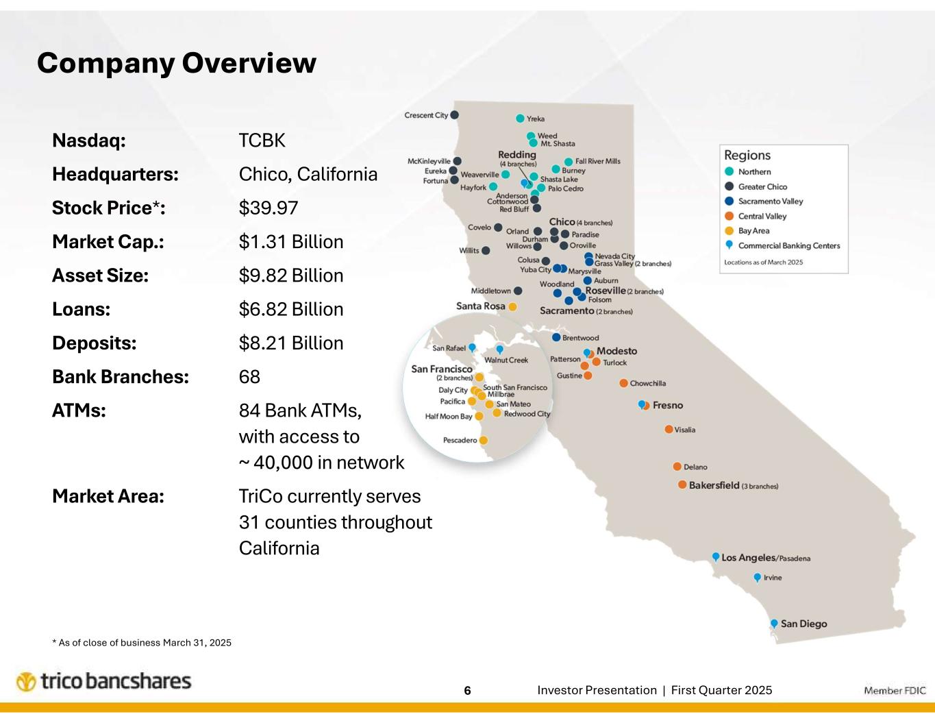Investor Presentation | First Quarter 20252 Safe Harbor Statement The statements contained herein that are not historical facts are forward-looking statements based on management’s current expectations and beliefs concerning future developments and their potential effects on us. Such statements involve inherent risks and uncertainties, many of which are difficult to predict and are generally beyond our control. We caution readers that a number of important factors could cause actual results to differ materially from those expressed in, or implied or projected by, such forward-looking statements. These risks and uncertainties include, but are not limited to, the following: macroeconomic, geopolitical, and other challenges and uncertainties, including those related to actual or potential policies and actions from the new U.S. administration, such as tariffs, and reciprocal actions by other countries or regions, significant volatility and disruptions in financial markets, a resurgence of inflation, increases in unemployment rates, increases in interest rates and slowing economic growth or recession in the U.S. and other countries or regions; the impact of any future federal government shutdown and uncertainty regarding the federal government’s debt limit; the impact of changes in financial services industry policies, laws and regulations; regulatory restrictions or adverse regulatory findings affecting our ability to successfully market and price our products to consumers; adverse developments in the financial services industry generally such as bank failures and any related impact on depositor behavior or investor sentiment; the impacts of international hostilities, wars, terrorism or geopolitical events; risks related to the sufficiency of liquidity, including our ability to attract and maintain deposits; the risks related to the development, implementation, use and management of emerging technologies, including artificial intelligence and machine learning; extreme weather, natural disasters and other catastrophic events and their effects on our customers and the economic and business environments in which we operate; current and future economic and market conditions of the local economies in which we conduct operations; declines in housing and commercial real estate prices and changes in the financial performance and/or condition of our borrowers; the market value of our investment securities and possible other-than-temporary impairment of securities held by us due to changes in credit quality or rates; the availability of, and cost of, sources of funding and the demand for our products; the possibility that our recorded goodwill could become impaired, which may have an adverse impact on our earnings and capital; the costs or effects of mergers, acquisitions or dispositions we may make, as well as whether we are able to obtain any required governmental approvals in connection with any such activities, or identify and complete favorable transactions in the future, and/or realize the anticipated financial and business benefits; the volatility of the stock market and its impact on our stock price and our ability to conduct acquisitions; the regulatory and financial impacts associated with exceeding $10 billion in total assets; the ability to execute our business plan in new markets; our future operating or financial performance, including our outlook for future growth; changes in the level and direction of our nonperforming assets and charge-offs and the appropriateness of the allowance for credit losses; the effectiveness of us managing the mix of earning assets and in improving, resolving or liquidating lower-quality assets; changes in accounting standards and practices; changes in consumer spending, borrowing and savings habits; the effects of changes in the level or cost of checking or savings account deposits on our funding costs and net interest margin; increasing noninterest expense and its impact on our financial performance; competition and innovation with respect to financial products and services by banks, financial institutions and non-traditional competitors including retail businesses and technology companies; the challenges of attracting, integrating and retaining key employees; the impact of the 2023 cyber security ransomware incident, including the pending litigation, on our operations and reputation; the vulnerability of our operational or security systems or infrastructure, the systems of third-party vendors or other service providers with whom we contract, and our customers to unauthorized access, computer viruses, phishing schemes, spam attacks, human error, natural disasters, power loss and data/security breaches and the cost to defend against and respond to such incidents; increased data security risks due to work from home arrangements and email vulnerability; failure to safeguard personal information, and any resulting litigation; the effect of a fall in stock market prices on our brokerage and wealth management businesses; the emergence or continuation of widespread health emergencies or pandemics; potential judgments, orders, settlements, penalties, fines and reputational damage resulting from pending or future litigation and regulatory investigations, proceedings and enforcement actions; and our ability to manage the risks involved in the foregoing. There can be no assurance that future developments affecting us will be the same as those anticipated by management. Additional factors that could cause results to differ materially from those described above can be found in our filings with the U.S. Securities and Exchange Commission, including without limitation the “Risk Factors” Section of TriCo’s Annual Report on Form 10-K for the year ended December 31, 2024, Such filings are also available in the “Investor Relations” section of our website, https://www.tcbk.com/investor-relations. Annualized, pro forma, projections and estimates are not forecasts 