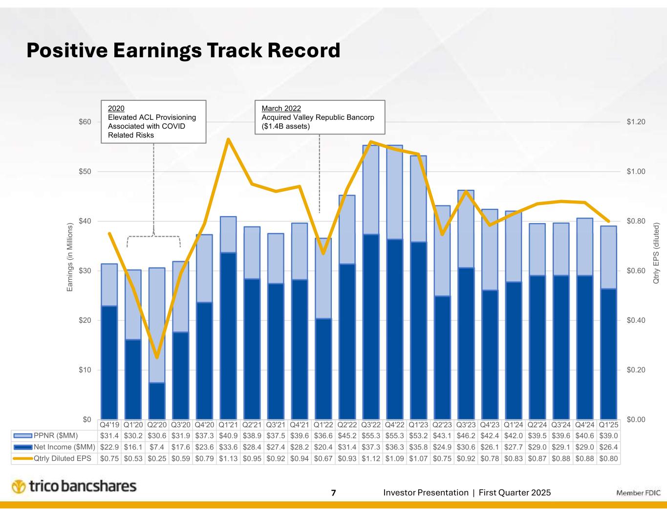 Investor Presentation | First Quarter 20256 Company Overview Nasdaq: TCBK Headquarters: Chico, California Stock Price*: $39.97 Market Cap.: $1.31 Billion Asset Size: $9.82 Billion Loans: $6.82 Billion Deposits: $8.21 Billion Bank Branches: 68 ATMs: 84 Bank ATMs, with access to ~ 40,000 in network Market Area: TriCo currently serves 31 counties throughout California * As of close of business March 31, 2025