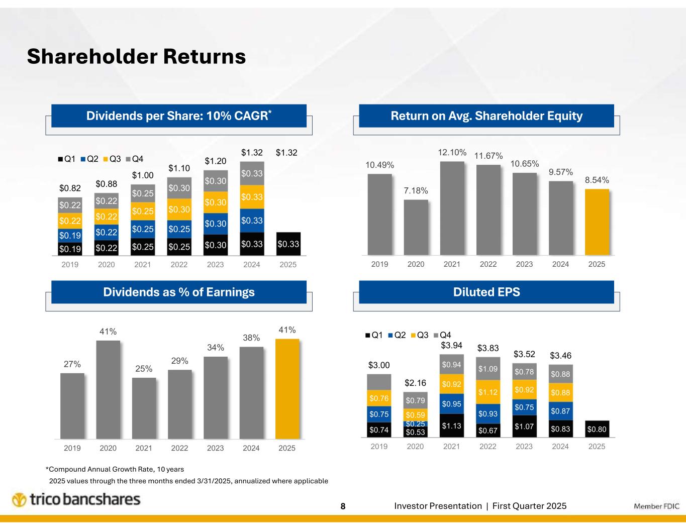 Investor Presentation | First Quarter 20252 Safe Harbor Statement The statements contained herein that are not historical facts are forward-looking statements based on management’s current expectations and beliefs concerning future developments and their potential effects on us. Such statements involve inherent risks and uncertainties, many of which are difficult to predict and are generally beyond our control. We caution readers that a number of important factors could cause actual results to differ materially from those expressed in, or implied or projected by, such forward-looking statements. These risks and uncertainties include, but are not limited to, the following: macroeconomic, geopolitical, and other challenges and uncertainties, including those related to actual or potential policies and actions from the new U.S. administration, such as tariffs, and reciprocal actions by other countries or regions, significant volatility and disruptions in financial markets, a resurgence of inflation, increases in unemployment rates, increases in interest rates and slowing economic growth or recession in the U.S. and other countries or regions; the impact of any future federal government shutdown and uncertainty regarding the federal government’s debt limit; the impact of changes in financial services industry policies, laws and regulations; regulatory restrictions or adverse regulatory findings affecting our ability to successfully market and price our products to consumers; adverse developments in the financial services industry generally such as bank failures and any related impact on depositor behavior or investor sentiment; the impacts of international hostilities, wars, terrorism or geopolitical events; risks related to the sufficiency of liquidity, including our ability to attract and maintain deposits; the risks related to the development, implementation, use and management of emerging technologies, including artificial intelligence and machine learning; extreme weather, natural disasters and other catastrophic events and their effects on our customers and the economic and business environments in which we operate; current and future economic and market conditions of the local economies in which we conduct operations; declines in housing and commercial real estate prices and changes in the financial performance and/or condition of our borrowers; the market value of our investment securities and possible other-than-temporary impairment of securities held by us due to changes in credit quality or rates; the availability of, and cost of, sources of funding and the demand for our products; the possibility that our recorded goodwill could become impaired, which may have an adverse impact on our earnings and capital; the costs or effects of mergers, acquisitions or dispositions we may make, as well as whether we are able to obtain any required governmental approvals in connection with any such activities, or identify and complete favorable transactions in the future, and/or realize the anticipated financial and business benefits; the volatility of the stock market and its impact on our stock price and our ability to conduct acquisitions; the regulatory and financial impacts associated with exceeding $10 billion in total assets; the ability to execute our business plan in new markets; our future operating or financial performance, including our outlook for future growth; changes in the level and direction of our nonperforming assets and charge-offs and the appropriateness of the allowance for credit losses; the effectiveness of us managing the mix of earning assets and in improving, resolving or liquidating lower-quality assets; changes in accounting standards and practices; changes in consumer spending, borrowing and savings habits; the effects of changes in the level or cost of checking or savings account deposits on our funding costs and net interest margin; increasing noninterest expense and its impact on our financial performance; competition and innovation with respect to financial products and services by banks, financial institutions and non-traditional competitors including retail businesses and technology companies; the challenges of attracting, integrating and retaining key employees; the impact of the 2023 cyber security ransomware incident, including the pending litigation, on our operations and reputation; the vulnerability of our operational or security systems or infrastructure, the systems of third-party vendors or other service providers with whom we contract, and our customers to unauthorized access, computer viruses, phishing schemes, spam attacks, human error, natural disasters, power loss and data/security breaches and the cost to defend against and respond to such incidents; increased data security risks due to work from home arrangements and email vulnerability; failure to safeguard personal information, and any resulting litigation; the effect of a fall in stock market prices on our brokerage and wealth management businesses; the emergence or continuation of widespread health emergencies or pandemics; potential judgments, orders, settlements, penalties, fines and reputational damage resulting from pending or future litigation and regulatory investigations, proceedings and enforcement actions; and our ability to manage the risks involved in the foregoing. There can be no assurance that future developments affecting us will be the same as those anticipated by management. Additional factors that could cause results to differ materially from those described above can be found in our filings with the U.S. Securities and Exchange Commission, including without limitation the “Risk Factors” Section of TriCo’s Annual Report on Form 10-K for the year ended December 31, 2024, Such filings are also available in the “Investor Relations” section of our website, https://www.tcbk.com/investor-relations. Annualized, pro forma, projections and estimates are not forecasts 