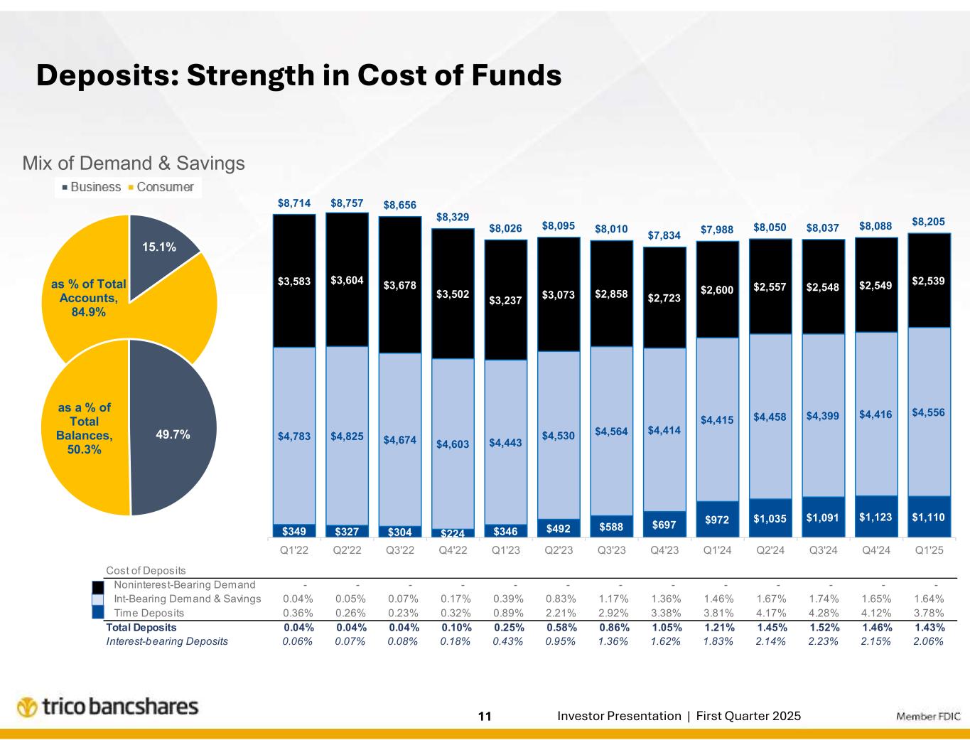 Investor Presentation | First Quarter 202510 4 1 .1 4 1 .2 4 2 .5 4 2 .0 4 0 .3 3 8 .0 3 5 .7 3 4 .8 3 2 .6 3 1 .8 3 1 .7 3 1 .5 3 0 .9 0 10 20 30 40 2022 Q1 2022 Q2 2022 Q3 2022 Q4 2023 Q1 2023 Q2 2023 Q3 2023 Q4 2024 Q1 2024 Q2 2024 Q3 2024 Q4 2025 Q1 Non Interest-bearing Deposits as % of Total Deposits TCBK Peers 66 .4 69 .1 72 .1 76 .5 79 .5 80 .4 84 .0 87 .7 87 .7 86 .6 86 .5 87 .2 86 .5 0 20 40 60 80 100 120 2022 Q1 2022 Q2 2022 Q3 2022 Q4 2023 Q1 2023 Q2 2023 Q3 2023 Q4 2024 Q1 2024 Q2 2024 Q3 2024 Q4 2025 Q1 Loans to Core Deposits (%) TCBK Peers Liability Mix: Strength in Funding Total Deposits = $8.21 billion 97.7% of Funding Liabilities Liability Mix 3/31/2025  Peer group consists of 99 closest peers in terms of total deposits, range $5.1 to 11.1 Billion; source: BankRegData.com  Net Loans includes LHFS and Allowance for Credit Loss; Core Deposits = Total Deposits less CDs > 250k and Brokered Deposits Non Interest- bearing Demand Deposits, 29.6% Interest-bearing Demand & Savings Deposits, 53.2% Time Deposits, 13.0% Borrowings & Subordinated Debt, 2.3% Other liabilities, 1.9%