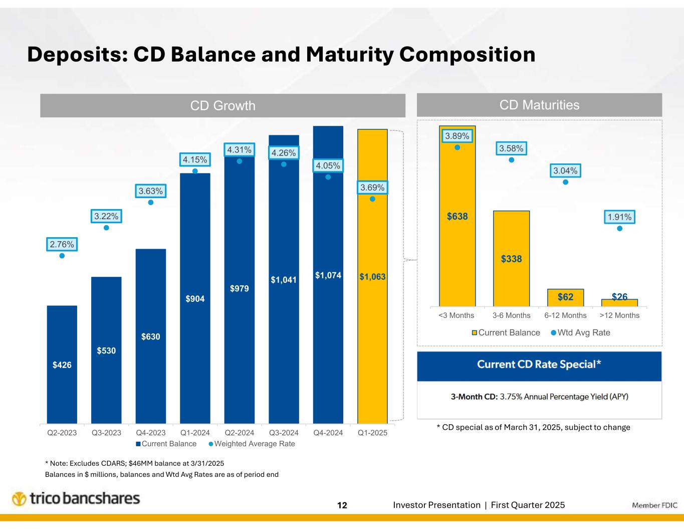 Investor Presentation | First Quarter 202511 15.1% as % of Total Accounts, 84.9% $349 $327 $304 $224 $346 $492 $588 $697 $972 $1,035 $1,091 $1,123 $1,110 $4,783 $4,825 $4,674 $4,603 $4,443 $4,530 $4,564 $4,414 $4,415 $4,458 $4,399 $4,416 $4,556 $3,583 $3,604 $3,678 $3,502 $3,237 $3,073 $2,858 $2,723 $2,600 $2,557 $2,548 $2,549 $2,539 $8,714 $8,757 $8,656 $8,329 $8,026 $8,095 $8,010 $7,834 $7,988 $8,050 $8,037 $8,088 $8,205 0 1,000 2,000 3,000 4,000 5,000 6,000 7,000 8,000 9,000 Q1'22 Q2'22 Q3'22 Q4'22 Q1'23 Q2'23 Q3'23 Q4'23 Q1'24 Q2'24 Q3'24 Q4'24 Q1'25 Deposits: Strength in Cost of Funds Mix of Demand & Savings 49.7% as a % of Total Balances, 50.3% Cost of Deposits Noninterest-Bearing Demand - - - - - - - - - - - - - Int-Bearing Demand & Savings 0.04% 0.05% 0.07% 0.17% 0.39% 0.83% 1.17% 1.36% 1.46% 1.67% 1.74% 1.65% 1.64% Time Deposits 0.36% 0.26% 0.23% 0.32% 0.89% 2.21% 2.92% 3.38% 3.81% 4.17% 4.28% 4.12% 3.78% Total Deposits 0.04% 0.04% 0.04% 0.10% 0.25% 0.58% 0.86% 1.05% 1.21% 1.45% 1.52% 1.46% 1.43% Interest-bearing Deposits 0.06% 0.07% 0.08% 0.18% 0.43% 0.95% 1.36% 1.62% 1.83% 2.14% 2.23% 2.15% 2.06%