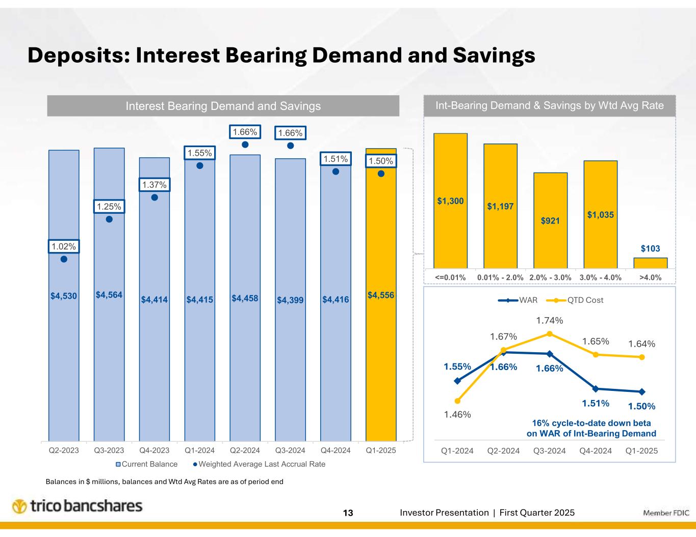 Investor Presentation | First Quarter 202512 $426 $530 $630 $904 $979 $1,041 $1,074 $1,063 2.76% 3.22% 3.63% 4.15% 4.31% 4.26% 4.05% 3.69% 0.00% 0.50% 1.00% 1.50% 2.00% 2.50% 3.00% 3.50% 4.00% 4.50% 5.00% $0.00 $200.00 $400.00 $600.00 $800.00 $1,000.00 Q2-2023 Q3-2023 Q4-2023 Q1-2024 Q2-2024 Q3-2024 Q4-2024 Q1-2025 Current Balance Weighted Average Rate Deposits: CD Balance and Maturity Composition * Note: Excludes CDARS; $46MM balance at 3/31/2025 * CD special as of March 31, 2025, subject to change CD Growth Balances in $ millions, balances and Wtd Avg Rates are as of period end CD Maturities $638 $338 $62 $26 3.89% 3.58% 3.04% 1.91% 0.00% 0.50% 1.00% 1.50% 2.00% 2.50% 3.00% 3.50% 4.00% 4.50% $0 $100 $200 $300 $400 $500 $600 <3 Months 3-6 Months 6-12 Months >12 Months Current Balance Wtd Avg Rate