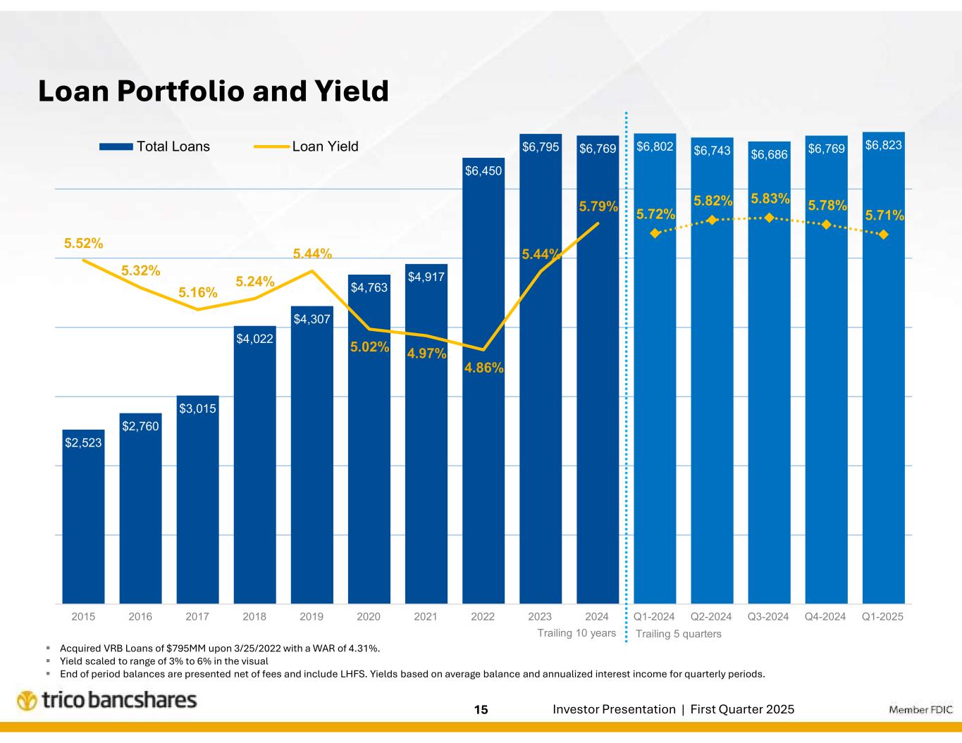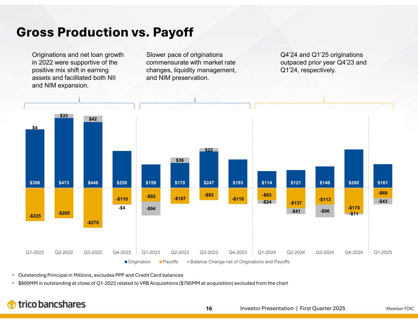 Investor Presentation | First Quarter 202515 $2,523 $2,760 $3,015 $4,022 $4,307 $4,763 $4,917 $6,450 $6,795 $6,769 $6,802 $6,743 $6,686 $6,769 $6,823 5.52% 5.32% 5.16% 5.24% 5.44% 5.02% 4.97% 4.86% 5.44% 5.79% 5.72% 5.82% 5.83% 5.78% 5.71% 3.00% 4.00% 5.00% 6.00% $0 $1,000 $2,000 $3,000 $4,000 $5,000 $6,000 2015 2016 2017 2018 2019 2020 2021 2022 2023 2024 Q1-2024 Q2-2024 Q3-2024 Q4-2024 Q1-2025 Total Loans Loan Yield Loan Portfolio and Yield Trailing 10 years Trailing 5 quarters  Acquired VRB Loans of $795MM upon 3/25/2022 with a WAR of 4.31%.  Yield scaled to range of 3% to 6% in the visual  End of period balances are presented net of fees and include LHFS. Yields based on average balance and annualized interest income for quarterly periods.