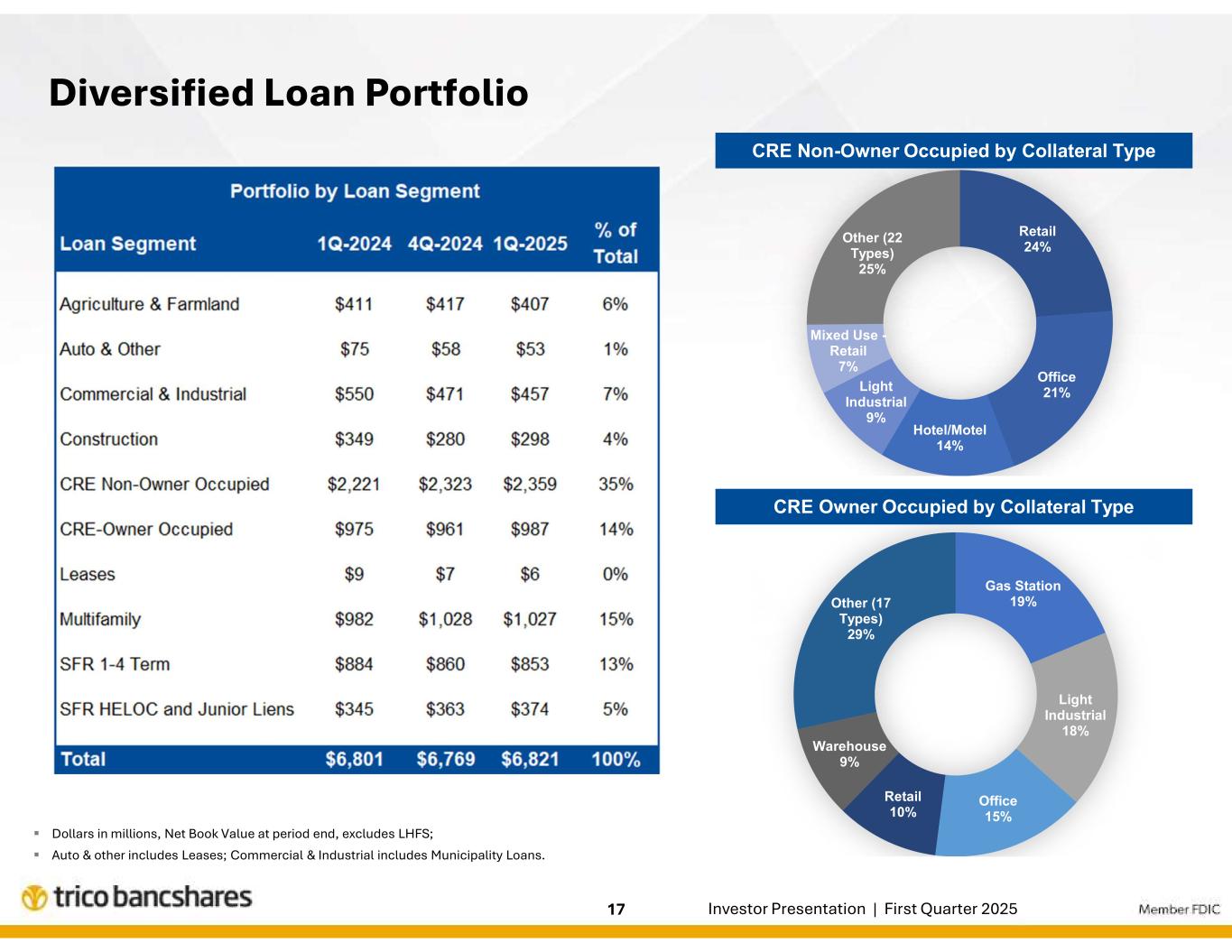 Investor Presentation | First Quarter 20252 Safe Harbor Statement The statements contained herein that are not historical facts are forward-looking statements based on management’s current expectations and beliefs concerning future developments and their potential effects on us. Such statements involve inherent risks and uncertainties, many of which are difficult to predict and are generally beyond our control. We caution readers that a number of important factors could cause actual results to differ materially from those expressed in, or implied or projected by, such forward-looking statements. These risks and uncertainties include, but are not limited to, the following: macroeconomic, geopolitical, and other challenges and uncertainties, including those related to actual or potential policies and actions from the new U.S. administration, such as tariffs, and reciprocal actions by other countries or regions, significant volatility and disruptions in financial markets, a resurgence of inflation, increases in unemployment rates, increases in interest rates and slowing economic growth or recession in the U.S. and other countries or regions; the impact of any future federal government shutdown and uncertainty regarding the federal government’s debt limit; the impact of changes in financial services industry policies, laws and regulations; regulatory restrictions or adverse regulatory findings affecting our ability to successfully market and price our products to consumers; adverse developments in the financial services industry generally such as bank failures and any related impact on depositor behavior or investor sentiment; the impacts of international hostilities, wars, terrorism or geopolitical events; risks related to the sufficiency of liquidity, including our ability to attract and maintain deposits; the risks related to the development, implementation, use and management of emerging technologies, including artificial intelligence and machine learning; extreme weather, natural disasters and other catastrophic events and their effects on our customers and the economic and business environments in which we operate; current and future economic and market conditions of the local economies in which we conduct operations; declines in housing and commercial real estate prices and changes in the financial performance and/or condition of our borrowers; the market value of our investment securities and possible other-than-temporary impairment of securities held by us due to changes in credit quality or rates; the availability of, and cost of, sources of funding and the demand for our products; the possibility that our recorded goodwill could become impaired, which may have an adverse impact on our earnings and capital; the costs or effects of mergers, acquisitions or dispositions we may make, as well as whether we are able to obtain any required governmental approvals in connection with any such activities, or identify and complete favorable transactions in the future, and/or realize the anticipated financial and business benefits; the volatility of the stock market and its impact on our stock price and our ability to conduct acquisitions; the regulatory and financial impacts associated with exceeding $10 billion in total assets; the ability to execute our business plan in new markets; our future operating or financial performance, including our outlook for future growth; changes in the level and direction of our nonperforming assets and charge-offs and the appropriateness of the allowance for credit losses; the effectiveness of us managing the mix of earning assets and in improving, resolving or liquidating lower-quality assets; changes in accounting standards and practices; changes in consumer spending, borrowing and savings habits; the effects of changes in the level or cost of checking or savings account deposits on our funding costs and net interest margin; increasing noninterest expense and its impact on our financial performance; competition and innovation with respect to financial products and services by banks, financial institutions and non-traditional competitors including retail businesses and technology companies; the challenges of attracting, integrating and retaining key employees; the impact of the 2023 cyber security ransomware incident, including the pending litigation, on our operations and reputation; the vulnerability of our operational or security systems or infrastructure, the systems of third-party vendors or other service providers with whom we contract, and our customers to unauthorized access, computer viruses, phishing schemes, spam attacks, human error, natural disasters, power loss and data/security breaches and the cost to defend against and respond to such incidents; increased data security risks due to work from home arrangements and email vulnerability; failure to safeguard personal information, and any resulting litigation; the effect of a fall in stock market prices on our brokerage and wealth management businesses; the emergence or continuation of widespread health emergencies or pandemics; potential judgments, orders, settlements, penalties, fines and reputational damage resulting from pending or future litigation and regulatory investigations, proceedings and enforcement actions; and our ability to manage the risks involved in the foregoing. There can be no assurance that future developments affecting us will be the same as those anticipated by management. Additional factors that could cause results to differ materially from those described above can be found in our filings with the U.S. Securities and Exchange Commission, including without limitation the “Risk Factors” Section of TriCo’s Annual Report on Form 10-K for the year ended December 31, 2024, Such filings are also available in the “Investor Relations” section of our website, https://www.tcbk.com/investor-relations. Annualized, pro forma, projections and estimates are not forecasts 