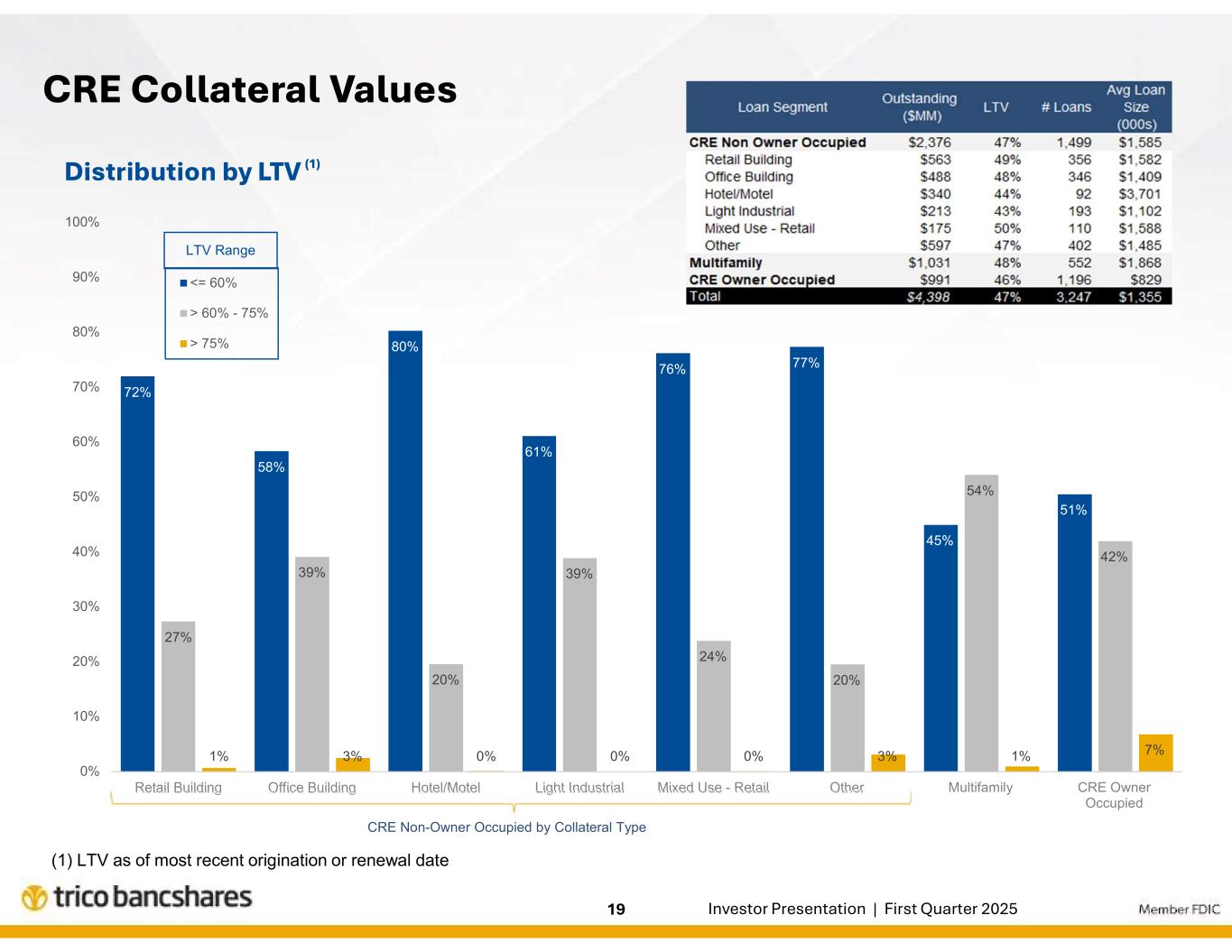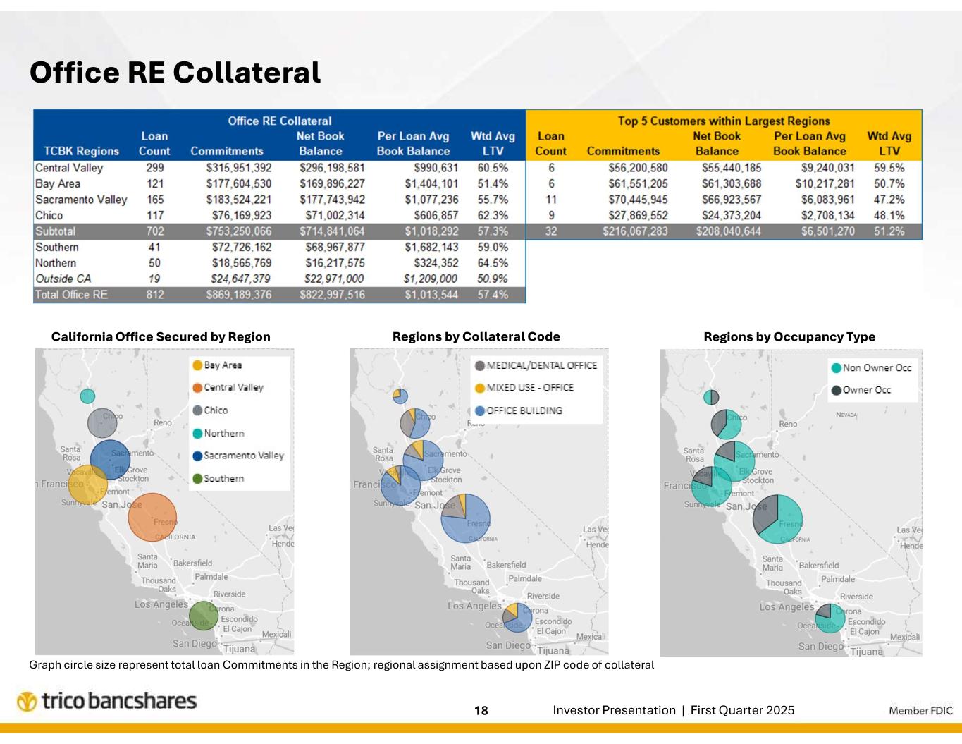 Investor Presentation | First Quarter 202518 Office RE Collateral Graph circle size represent total loan Commitments in the Region; regional assignment based upon ZIP code of collateral California Office Secured by Region Regions by Collateral Code Regions by Occupancy Type