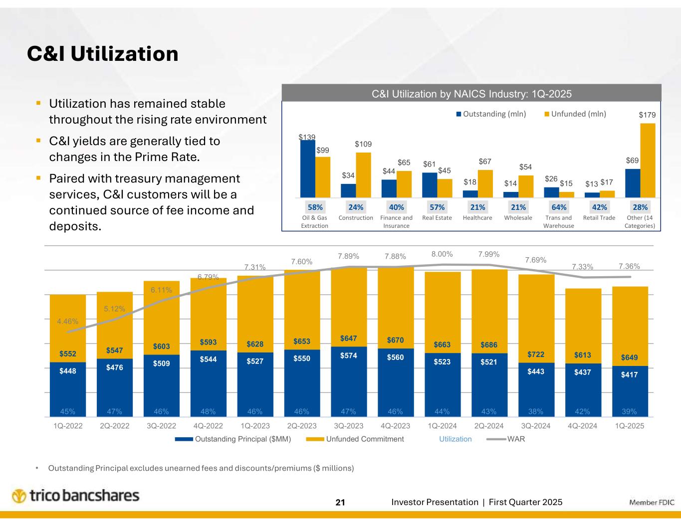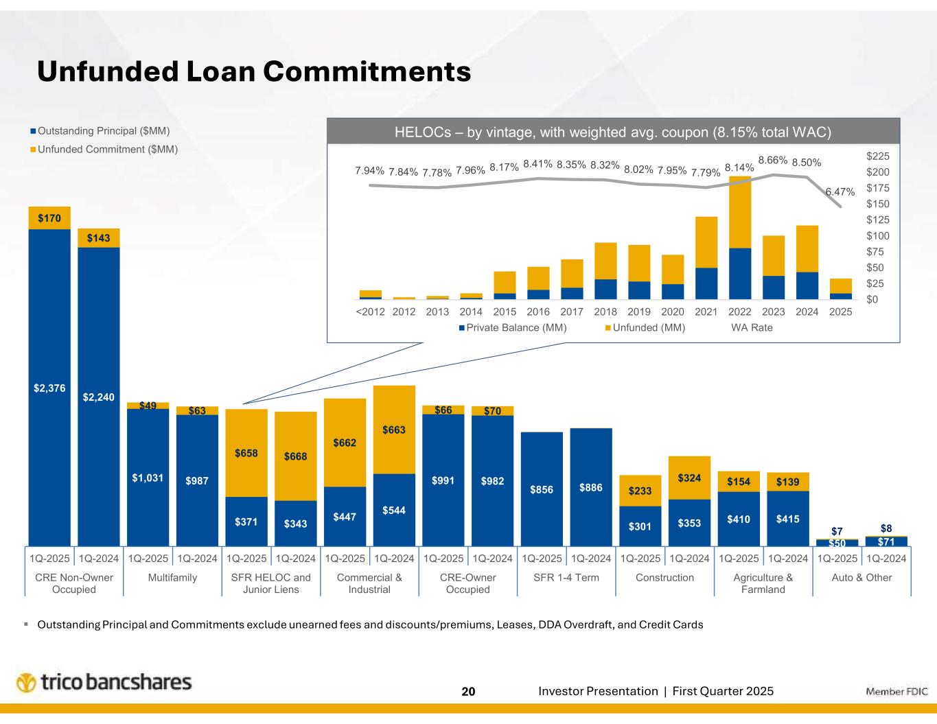 Investor Presentation | First Quarter 202520 $2,376 $2,240 $1,031 $987 $371 $343 $447 $544 $991 $982 $856 $886 $301 $353 $410 $415 $50 $71 $170 $143 $49 $63 $658 $668 $662 $663 $66 $70 $233 $324 $154 $139 $7 $8 1Q-2025 1Q-2024 1Q-2025 1Q-2024 1Q-2025 1Q-2024 1Q-2025 1Q-2024 1Q-2025 1Q-2024 1Q-2025 1Q-2024 1Q-2025 1Q-2024 1Q-2025 1Q-2024 1Q-2025 1Q-2024 CRE Non-Owner Occupied Multifamily SFR HELOC and Junior Liens Commercial & Industrial CRE-Owner Occupied SFR 1-4 Term Construction Agriculture & Farmland Auto & Other Outstanding Principal ($MM) Unfunded Commitment ($MM) 0.00% 1.00% 2.00% 3.00% 4.00% 5.00% 6.00% 7.00% 8.00% 9.00% 10.00% $0 $25 $50 $75 $100 $125 $150 $175 $200 $225 20252024202320222021202020192018201720162015201420132012<2012 Private Balance (MM) Unfunded (MM) WA Rate Unfunded Loan Commitments HELOCs – by vintage, with weighted avg. coupon (8.15% total WAC)  Outstanding Principal and Commitments exclude unearned fees and discounts/premiums, Leases, DDA Overdraft, and Credit Cards 6.47% 8.50%8.66% 8.14%7.79%7.95%8.02%8.32%8.35%8.41%8.17%7.96%7.78%7.84%7.94%