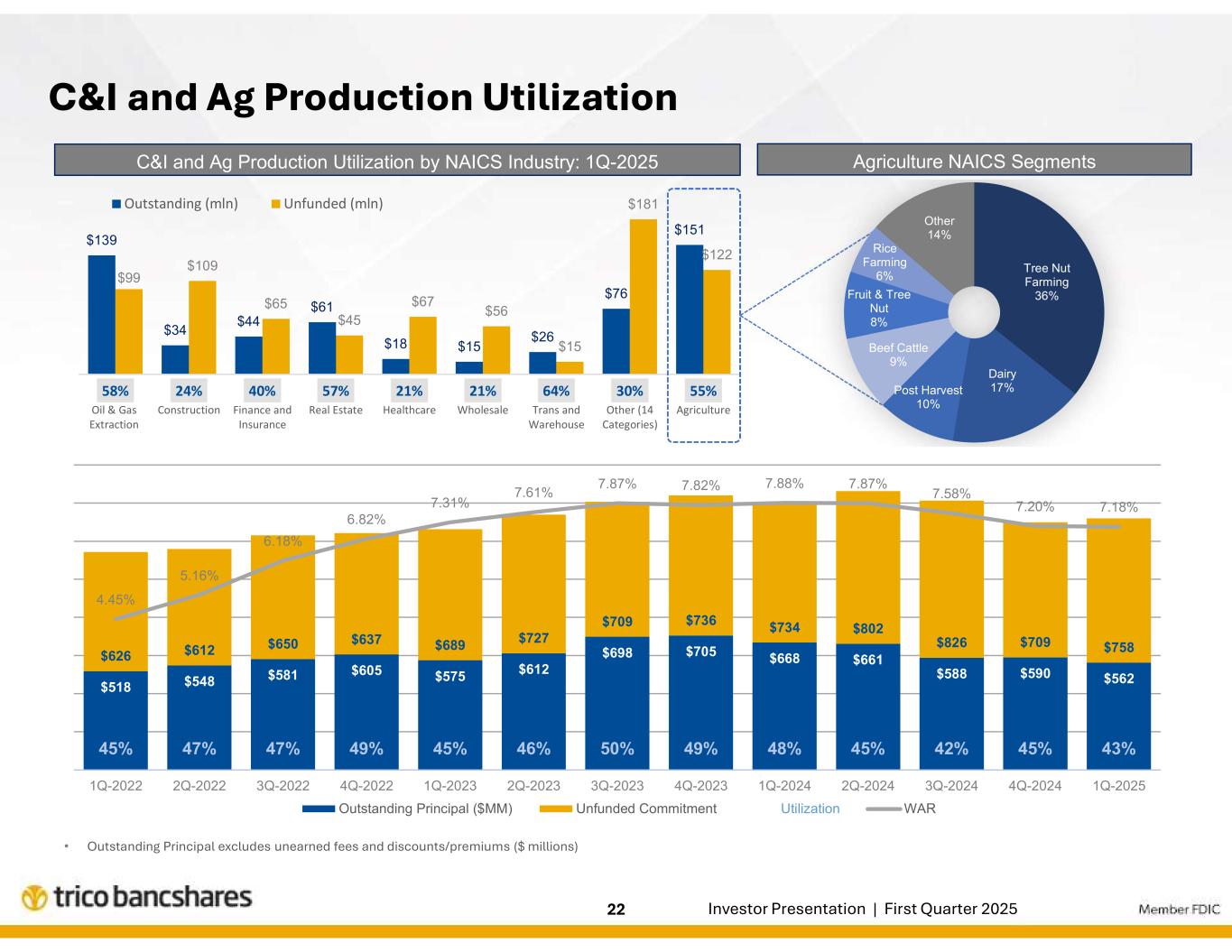 Investor Presentation | First Quarter 202521 $139 $34 $44 $61 $18 $14 $26 $13 $69 $99 $109 $65 $45 $67 $54 $15 $17 $179 58% 24% 40% 57% 21% 21% 64% 42% 28% 0% 5000% 10000% 15000% 20000% Oil & Gas Extraction Construction Finance and Insurance Real Estate Healthcare Wholesale Trans and Warehouse Retail Trade Other (14 Categories) Outstanding (mln) Unfunded (mln) $448 $476 $509 $544 $527 $550 $574 $560 $523 $521 $443 $437 $417 $552 $547 $603 $593 $628 $653 $647 $670 $663 $686 $722 $613 $649 45% 47% 46% 48% 46% 46% 47% 46% 44% 43% 38% 42% 39% 4.46% 5.12% 6.11% 6.79% 7.31% 7.60% 7.89% 7.88% 8.00% 7.99% 7.69% 7.33% 7.36% 0% 1% 2% 3% 4% 5% 6% 7% 8% 9% $0 $200 $400 $600 $800 $1,000 $1,200 $1,400 1Q-2022 2Q-2022 3Q-2022 4Q-2022 1Q-2023 2Q-2023 3Q-2023 4Q-2023 1Q-2024 2Q-2024 3Q-2024 4Q-2024 1Q-2025 Outstanding Principal ($MM) Unfunded Commitment Utilization WAR C&I Utilization • Outstanding Principal excludes unearned fees and discounts/premiums ($ millions)  Utilization has remained stable throughout the rising rate environment  C&I yields are generally tied to changes in the Prime Rate.  Paired with treasury management services, C&I customers will be a continued source of fee income and deposits. C&I Utilization by NAICS Industry: 1Q-2025