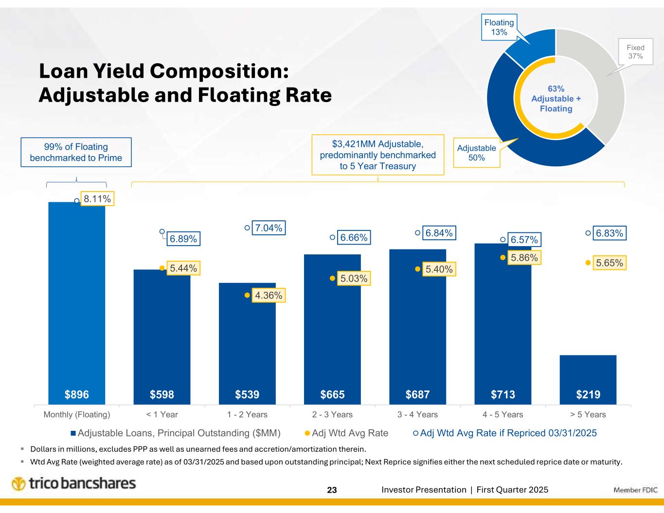Investor Presentation | First Quarter 202522 $518 $548 $581 $605 $575 $612 $698 $705 $668 $661 $588 $590 $562 $626 $612 $650 $637 $689 $727 $709 $736 $734 $802 $826 $709 $758 45% 47% 47% 49% 45% 46% 50% 49% 48% 45% 42% 45% 43% 4.45% 5.16% 6.18% 6.82% 7.31% 7.61% 7.87% 7.82% 7.88% 7.87% 7.58% 7.20% 7.18% 0% 1% 2% 3% 4% 5% 6% 7% 8% 9% $0 $200 $400 $600 $800 $1,000 $1,200 $1,400 $1,600 1Q-2022 2Q-2022 3Q-2022 4Q-2022 1Q-2023 2Q-2023 3Q-2023 4Q-2023 1Q-2024 2Q-2024 3Q-2024 4Q-2024 1Q-2025 Outstanding Principal ($MM) Unfunded Commitment Utilization WAR C&I and Ag Production Utilization • Outstanding Principal excludes unearned fees and discounts/premiums ($ millions) C&I and Ag Production Utilization by NAICS Industry: 1Q-2025 Tree Nut Farming 36% Dairy 17%Post Harvest 10% Beef Cattle 9% Fruit & Tree Nut 8% Rice Farming 6% Other 14% Agriculture NAICS Segments $139 $34 $44 $61 $18 $15 $26 $76 $151 $99 $109 $65 $45 $67 $56 $15 $181 $122 58% 24% 40% 57% 21% 21% 64% 30% 55% 0% 5000% 10000% 15000% 20000% Oil & Gas Extraction Construction Finance and Insurance Real Estate Healthcare Wholesale Trans and Warehouse Other (14 Categories) Agriculture Outstanding (mln) Unfunded (mln)