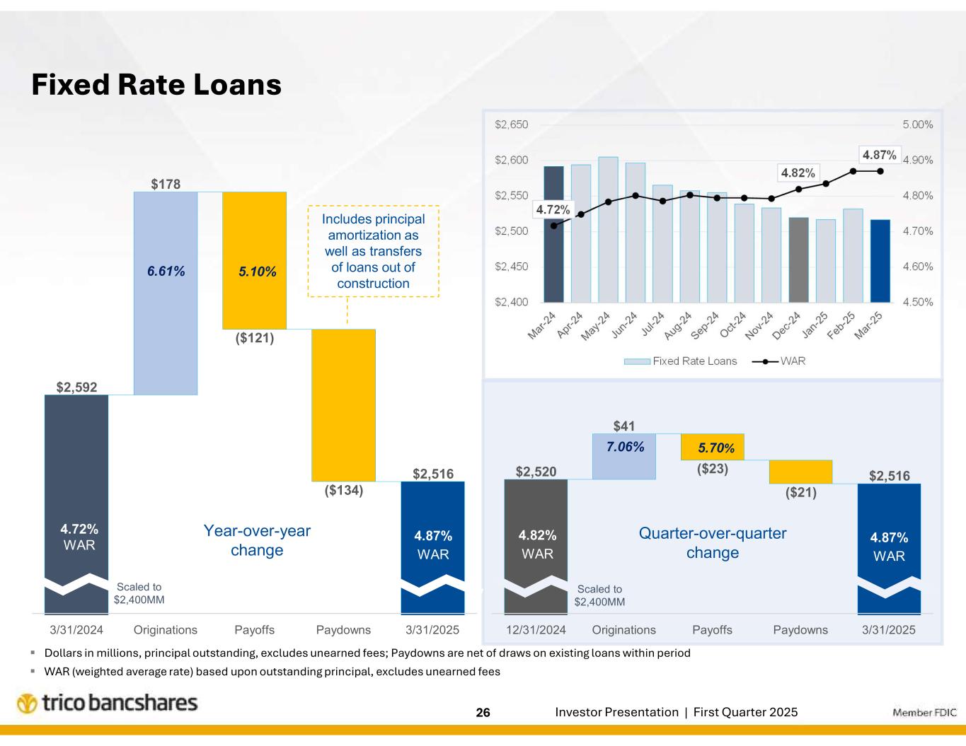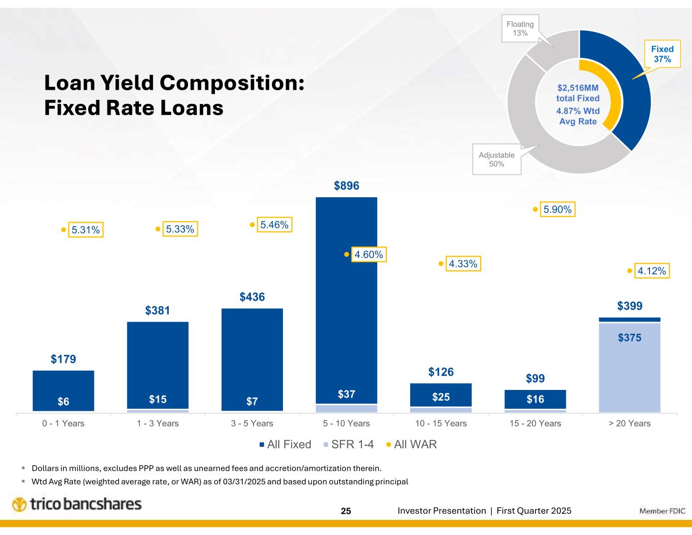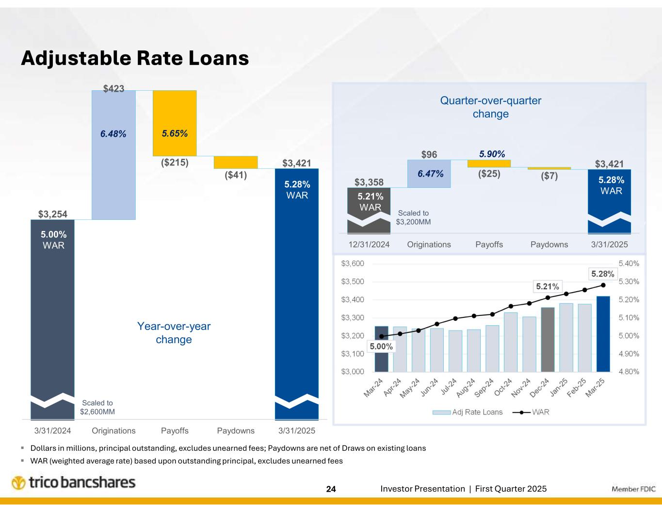 Investor Presentation | First Quarter 202524 $3,358 $3,421 $96 ($25) ($7) 12/31/2024 Originations Payoffs Paydowns 3/31/2025 $3,254 ($215) ($41) $3,421 $423 3/31/2024 Originations Payoffs Paydowns 3/31/2025 Adjustable Rate Loans  Dollars in millions, principal outstanding, excludes unearned fees; Paydowns are net of Draws on existing loans  WAR (weighted average rate) based upon outstanding principal, excludes unearned fees 4.80% WAR Scaled to $3,200MM Scaled to $2,600MM 5.00% WAR Year-over-year change Quarter-over-quarter change 5.28% WAR 5.21% WAR 6.47% 5.90% 5.28% WAR 6.48% 5.65% 5.00% 5.21% 5.28% 4.80% 4.90% 5.00% 5.10% 5.20% 5.30% 5.40% $3,000 $3,100 $3,200 $3,300 $3,400 $3,500 $3,600 Adj Rate Loans WAR