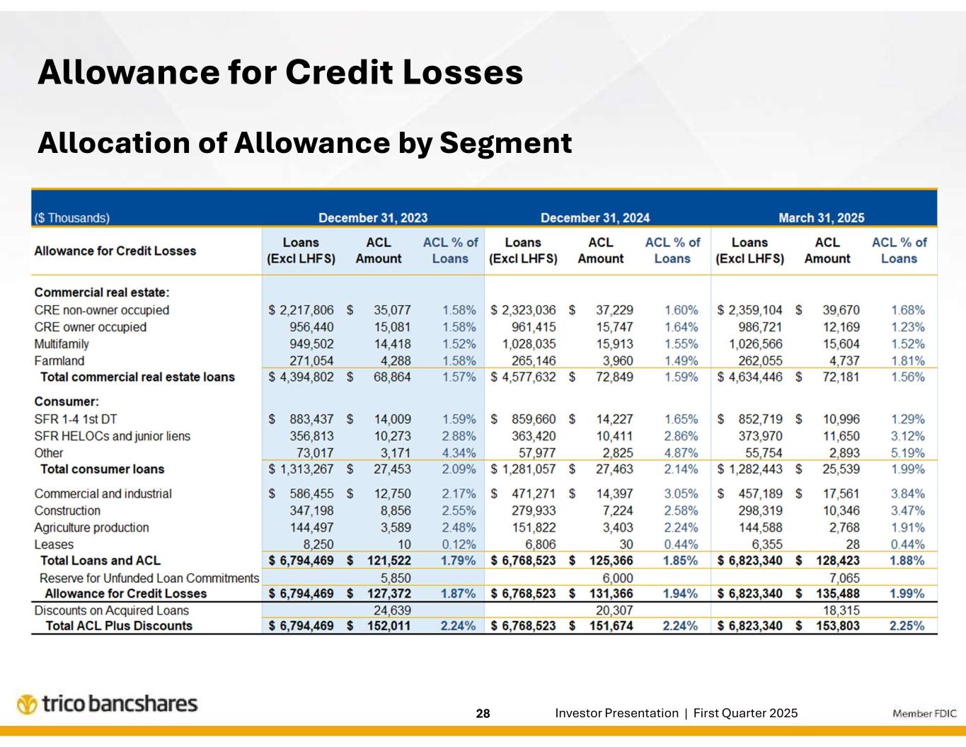 Investor Presentation | First Quarter 20252 Safe Harbor Statement The statements contained herein that are not historical facts are forward-looking statements based on management’s current expectations and beliefs concerning future developments and their potential effects on us. Such statements involve inherent risks and uncertainties, many of which are difficult to predict and are generally beyond our control. We caution readers that a number of important factors could cause actual results to differ materially from those expressed in, or implied or projected by, such forward-looking statements. These risks and uncertainties include, but are not limited to, the following: macroeconomic, geopolitical, and other challenges and uncertainties, including those related to actual or potential policies and actions from the new U.S. administration, such as tariffs, and reciprocal actions by other countries or regions, significant volatility and disruptions in financial markets, a resurgence of inflation, increases in unemployment rates, increases in interest rates and slowing economic growth or recession in the U.S. and other countries or regions; the impact of any future federal government shutdown and uncertainty regarding the federal government’s debt limit; the impact of changes in financial services industry policies, laws and regulations; regulatory restrictions or adverse regulatory findings affecting our ability to successfully market and price our products to consumers; adverse developments in the financial services industry generally such as bank failures and any related impact on depositor behavior or investor sentiment; the impacts of international hostilities, wars, terrorism or geopolitical events; risks related to the sufficiency of liquidity, including our ability to attract and maintain deposits; the risks related to the development, implementation, use and management of emerging technologies, including artificial intelligence and machine learning; extreme weather, natural disasters and other catastrophic events and their effects on our customers and the economic and business environments in which we operate; current and future economic and market conditions of the local economies in which we conduct operations; declines in housing and commercial real estate prices and changes in the financial performance and/or condition of our borrowers; the market value of our investment securities and possible other-than-temporary impairment of securities held by us due to changes in credit quality or rates; the availability of, and cost of, sources of funding and the demand for our products; the possibility that our recorded goodwill could become impaired, which may have an adverse impact on our earnings and capital; the costs or effects of mergers, acquisitions or dispositions we may make, as well as whether we are able to obtain any required governmental approvals in connection with any such activities, or identify and complete favorable transactions in the future, and/or realize the anticipated financial and business benefits; the volatility of the stock market and its impact on our stock price and our ability to conduct acquisitions; the regulatory and financial impacts associated with exceeding $10 billion in total assets; the ability to execute our business plan in new markets; our future operating or financial performance, including our outlook for future growth; changes in the level and direction of our nonperforming assets and charge-offs and the appropriateness of the allowance for credit losses; the effectiveness of us managing the mix of earning assets and in improving, resolving or liquidating lower-quality assets; changes in accounting standards and practices; changes in consumer spending, borrowing and savings habits; the effects of changes in the level or cost of checking or savings account deposits on our funding costs and net interest margin; increasing noninterest expense and its impact on our financial performance; competition and innovation with respect to financial products and services by banks, financial institutions and non-traditional competitors including retail businesses and technology companies; the challenges of attracting, integrating and retaining key employees; the impact of the 2023 cyber security ransomware incident, including the pending litigation, on our operations and reputation; the vulnerability of our operational or security systems or infrastructure, the systems of third-party vendors or other service providers with whom we contract, and our customers to unauthorized access, computer viruses, phishing schemes, spam attacks, human error, natural disasters, power loss and data/security breaches and the cost to defend against and respond to such incidents; increased data security risks due to work from home arrangements and email vulnerability; failure to safeguard personal information, and any resulting litigation; the effect of a fall in stock market prices on our brokerage and wealth management businesses; the emergence or continuation of widespread health emergencies or pandemics; potential judgments, orders, settlements, penalties, fines and reputational damage resulting from pending or future litigation and regulatory investigations, proceedings and enforcement actions; and our ability to manage the risks involved in the foregoing. There can be no assurance that future developments affecting us will be the same as those anticipated by management. Additional factors that could cause results to differ materially from those described above can be found in our filings with the U.S. Securities and Exchange Commission, including without limitation the “Risk Factors” Section of TriCo’s Annual Report on Form 10-K for the year ended December 31, 2024, Such filings are also available in the “Investor Relations” section of our website, https://www.tcbk.com/investor-relations. Annualized, pro forma, projections and estimates are not forecasts 