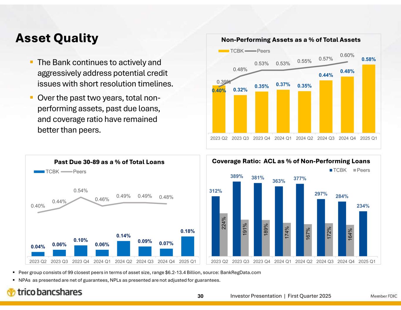 Investor Presentation | First Quarter 202530 0.40% 0.32% 0.35% 0.37% 0.35% 0.44% 0.48% 0.58% 0.39% 0.48% 0.53% 0.53% 0.55% 0.57% 0.60% 2023 Q2 2023 Q3 2023 Q4 2024 Q1 2024 Q2 2024 Q3 2024 Q4 2025 Q1 TCBK Peers 312% 389% 381% 363% 377% 297% 284% 234% 22 4% 19 1% 18 9% 17 4% 16 7% 17 2% 16 4% 2023 Q2 2023 Q3 2023 Q4 2024 Q1 2024 Q2 2024 Q3 2024 Q4 2025 Q1 TCBK Peers Asset Quality  Peer group consists of 99 closest peers in terms of asset size, range $6.2-13.4 Billion, source: BankRegData.com  NPAs as presented are net of guarantees, NPLs as presented are not adjusted for guarantees.  The Bank continues to actively and aggressively address potential credit issues with short resolution timelines.  Over the past two years, total non- performing assets, past due loans, and coverage ratio have remained better than peers. Non-Performing Assets as a % of Total Assets Coverage Ratio: ACL as % of Non-Performing Loans include past due 30+ as % of loans 0.04% 0.06% 0.10% 0.06% 0.14% 0.09% 0.07% 0.18% 0.40% 0.44% 0.54% 0.46% 0.49% 0.49% 0.48% 2023 Q2 2023 Q3 2023 Q4 2024 Q1 2024 Q2 2024 Q3 2024 Q4 2025 Q1 TCBK Peers Past Due 30-89 as a % of Total Loans