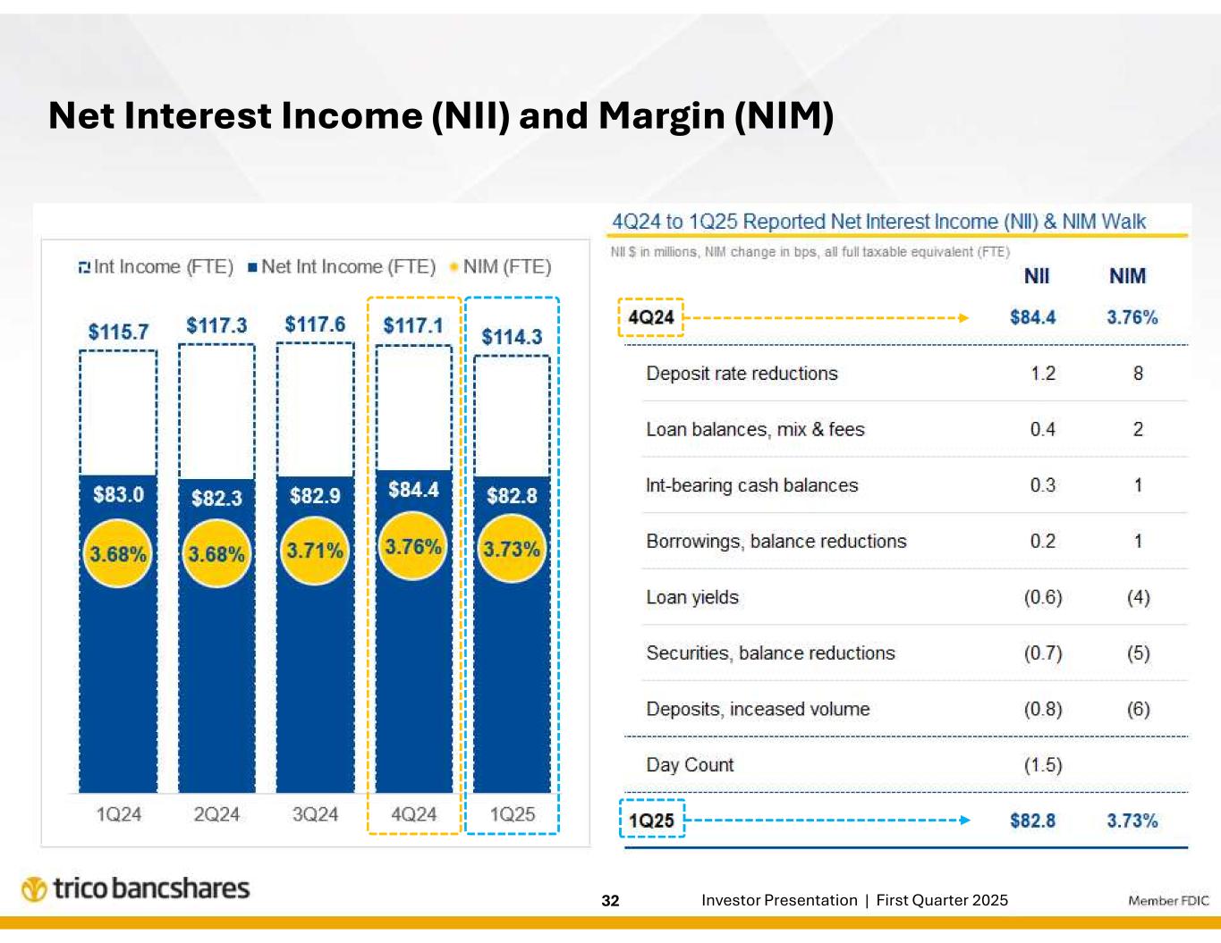 Investor Presentation | First Quarter 20252 Safe Harbor Statement The statements contained herein that are not historical facts are forward-looking statements based on management’s current expectations and beliefs concerning future developments and their potential effects on us. Such statements involve inherent risks and uncertainties, many of which are difficult to predict and are generally beyond our control. We caution readers that a number of important factors could cause actual results to differ materially from those expressed in, or implied or projected by, such forward-looking statements. These risks and uncertainties include, but are not limited to, the following: macroeconomic, geopolitical, and other challenges and uncertainties, including those related to actual or potential policies and actions from the new U.S. administration, such as tariffs, and reciprocal actions by other countries or regions, significant volatility and disruptions in financial markets, a resurgence of inflation, increases in unemployment rates, increases in interest rates and slowing economic growth or recession in the U.S. and other countries or regions; the impact of any future federal government shutdown and uncertainty regarding the federal government’s debt limit; the impact of changes in financial services industry policies, laws and regulations; regulatory restrictions or adverse regulatory findings affecting our ability to successfully market and price our products to consumers; adverse developments in the financial services industry generally such as bank failures and any related impact on depositor behavior or investor sentiment; the impacts of international hostilities, wars, terrorism or geopolitical events; risks related to the sufficiency of liquidity, including our ability to attract and maintain deposits; the risks related to the development, implementation, use and management of emerging technologies, including artificial intelligence and machine learning; extreme weather, natural disasters and other catastrophic events and their effects on our customers and the economic and business environments in which we operate; current and future economic and market conditions of the local economies in which we conduct operations; declines in housing and commercial real estate prices and changes in the financial performance and/or condition of our borrowers; the market value of our investment securities and possible other-than-temporary impairment of securities held by us due to changes in credit quality or rates; the availability of, and cost of, sources of funding and the demand for our products; the possibility that our recorded goodwill could become impaired, which may have an adverse impact on our earnings and capital; the costs or effects of mergers, acquisitions or dispositions we may make, as well as whether we are able to obtain any required governmental approvals in connection with any such activities, or identify and complete favorable transactions in the future, and/or realize the anticipated financial and business benefits; the volatility of the stock market and its impact on our stock price and our ability to conduct acquisitions; the regulatory and financial impacts associated with exceeding $10 billion in total assets; the ability to execute our business plan in new markets; our future operating or financial performance, including our outlook for future growth; changes in the level and direction of our nonperforming assets and charge-offs and the appropriateness of the allowance for credit losses; the effectiveness of us managing the mix of earning assets and in improving, resolving or liquidating lower-quality assets; changes in accounting standards and practices; changes in consumer spending, borrowing and savings habits; the effects of changes in the level or cost of checking or savings account deposits on our funding costs and net interest margin; increasing noninterest expense and its impact on our financial performance; competition and innovation with respect to financial products and services by banks, financial institutions and non-traditional competitors including retail businesses and technology companies; the challenges of attracting, integrating and retaining key employees; the impact of the 2023 cyber security ransomware incident, including the pending litigation, on our operations and reputation; the vulnerability of our operational or security systems or infrastructure, the systems of third-party vendors or other service providers with whom we contract, and our customers to unauthorized access, computer viruses, phishing schemes, spam attacks, human error, natural disasters, power loss and data/security breaches and the cost to defend against and respond to such incidents; increased data security risks due to work from home arrangements and email vulnerability; failure to safeguard personal information, and any resulting litigation; the effect of a fall in stock market prices on our brokerage and wealth management businesses; the emergence or continuation of widespread health emergencies or pandemics; potential judgments, orders, settlements, penalties, fines and reputational damage resulting from pending or future litigation and regulatory investigations, proceedings and enforcement actions; and our ability to manage the risks involved in the foregoing. There can be no assurance that future developments affecting us will be the same as those anticipated by management. Additional factors that could cause results to differ materially from those described above can be found in our filings with the U.S. Securities and Exchange Commission, including without limitation the “Risk Factors” Section of TriCo’s Annual Report on Form 10-K for the year ended December 31, 2024, Such filings are also available in the “Investor Relations” section of our website, https://www.tcbk.com/investor-relations. Annualized, pro forma, projections and estimates are not forecasts 