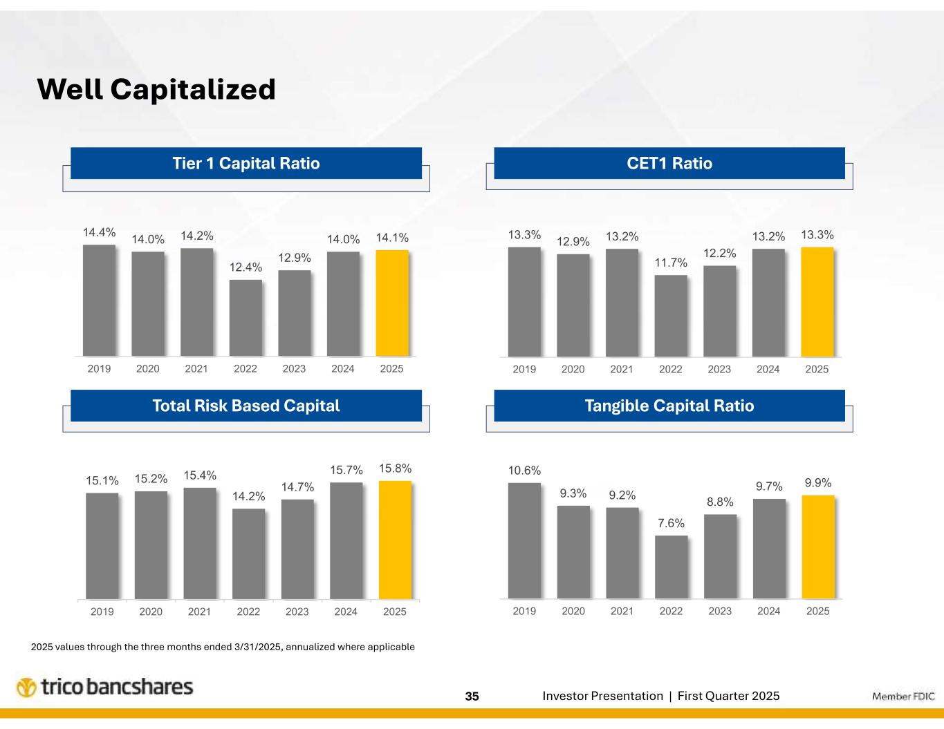Investor Presentation | First Quarter 20252 Safe Harbor Statement The statements contained herein that are not historical facts are forward-looking statements based on management’s current expectations and beliefs concerning future developments and their potential effects on us. Such statements involve inherent risks and uncertainties, many of which are difficult to predict and are generally beyond our control. We caution readers that a number of important factors could cause actual results to differ materially from those expressed in, or implied or projected by, such forward-looking statements. These risks and uncertainties include, but are not limited to, the following: macroeconomic, geopolitical, and other challenges and uncertainties, including those related to actual or potential policies and actions from the new U.S. administration, such as tariffs, and reciprocal actions by other countries or regions, significant volatility and disruptions in financial markets, a resurgence of inflation, increases in unemployment rates, increases in interest rates and slowing economic growth or recession in the U.S. and other countries or regions; the impact of any future federal government shutdown and uncertainty regarding the federal government’s debt limit; the impact of changes in financial services industry policies, laws and regulations; regulatory restrictions or adverse regulatory findings affecting our ability to successfully market and price our products to consumers; adverse developments in the financial services industry generally such as bank failures and any related impact on depositor behavior or investor sentiment; the impacts of international hostilities, wars, terrorism or geopolitical events; risks related to the sufficiency of liquidity, including our ability to attract and maintain deposits; the risks related to the development, implementation, use and management of emerging technologies, including artificial intelligence and machine learning; extreme weather, natural disasters and other catastrophic events and their effects on our customers and the economic and business environments in which we operate; current and future economic and market conditions of the local economies in which we conduct operations; declines in housing and commercial real estate prices and changes in the financial performance and/or condition of our borrowers; the market value of our investment securities and possible other-than-temporary impairment of securities held by us due to changes in credit quality or rates; the availability of, and cost of, sources of funding and the demand for our products; the possibility that our recorded goodwill could become impaired, which may have an adverse impact on our earnings and capital; the costs or effects of mergers, acquisitions or dispositions we may make, as well as whether we are able to obtain any required governmental approvals in connection with any such activities, or identify and complete favorable transactions in the future, and/or realize the anticipated financial and business benefits; the volatility of the stock market and its impact on our stock price and our ability to conduct acquisitions; the regulatory and financial impacts associated with exceeding $10 billion in total assets; the ability to execute our business plan in new markets; our future operating or financial performance, including our outlook for future growth; changes in the level and direction of our nonperforming assets and charge-offs and the appropriateness of the allowance for credit losses; the effectiveness of us managing the mix of earning assets and in improving, resolving or liquidating lower-quality assets; changes in accounting standards and practices; changes in consumer spending, borrowing and savings habits; the effects of changes in the level or cost of checking or savings account deposits on our funding costs and net interest margin; increasing noninterest expense and its impact on our financial performance; competition and innovation with respect to financial products and services by banks, financial institutions and non-traditional competitors including retail businesses and technology companies; the challenges of attracting, integrating and retaining key employees; the impact of the 2023 cyber security ransomware incident, including the pending litigation, on our operations and reputation; the vulnerability of our operational or security systems or infrastructure, the systems of third-party vendors or other service providers with whom we contract, and our customers to unauthorized access, computer viruses, phishing schemes, spam attacks, human error, natural disasters, power loss and data/security breaches and the cost to defend against and respond to such incidents; increased data security risks due to work from home arrangements and email vulnerability; failure to safeguard personal information, and any resulting litigation; the effect of a fall in stock market prices on our brokerage and wealth management businesses; the emergence or continuation of widespread health emergencies or pandemics; potential judgments, orders, settlements, penalties, fines and reputational damage resulting from pending or future litigation and regulatory investigations, proceedings and enforcement actions; and our ability to manage the risks involved in the foregoing. There can be no assurance that future developments affecting us will be the same as those anticipated by management. Additional factors that could cause results to differ materially from those described above can be found in our filings with the U.S. Securities and Exchange Commission, including without limitation the “Risk Factors” Section of TriCo’s Annual Report on Form 10-K for the year ended December 31, 2024, Such filings are also available in the “Investor Relations” section of our website, https://www.tcbk.com/investor-relations. Annualized, pro forma, projections and estimates are not forecasts 