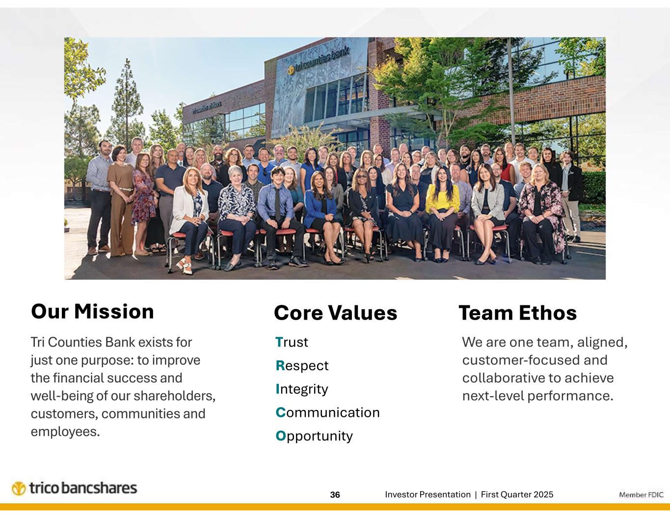 Investor Presentation | First Quarter 202536 Our Mission Tri Counties Bank exists for just one purpose: to improve the financial success and well-being of our shareholders, customers, communities and employees. Core Values Trust Respect Integrity Communication Opportunity Team Ethos We are one team, aligned, customer-focused and collaborative to achieve next-level performance.