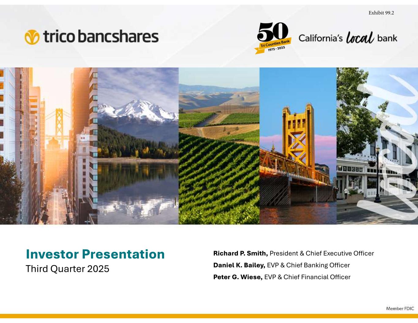 Investor Presentation | Third Quarter 20252 Safe Harbor Statement The statements contained herein that are not historical facts are forward-looking statements based on management’s current expectations and beliefs concerning future developments and their potential effects on us. Such statements involve inherent risks and uncertainties, many of which are difficult to predict and are generally beyond our control. We caution readers that a number of important factors could cause actual results to differ materially from those expressed in, or implied or projected by, such forward-looking statements. These risks and uncertainties include, but are not limited to, the following: macroeconomic, geopolitical, and other challenges and uncertainties, including those related to actual or potential policies and actions from the new U.S. administration, such as tariffs, and reciprocal actions by other countries or regions, significant volatility and disruptions in financial markets, a resurgence of inflation, increases in unemployment rates, increases in interest rates and slowing economic growth or recession in the U.S. and other countries or regions; the impact of any future federal government shutdown and uncertainty regarding the federal government’s debt limit; the impact of changes in financial services industry policies, laws and regulations; regulatory restrictions or adverse regulatory findings affecting our ability to successfully market and price our products to consumers; adverse developments in the financial services industry generally such as bank failures and any related impact on depositor behavior or investor sentiment; the impacts of international hostilities, wars, terrorism or geopolitical events; risks related to the sufficiency of liquidity, including our ability to attract and maintain deposits; the risks related to the development, implementation, use and management of emerging technologies, including artificial intelligence and machine learning; extreme weather, natural disasters and other catastrophic events and their effects on our customers and the economic and business environments in which we operate; current and future economic and market conditions of the local economies in which we conduct operations; declines in housing and commercial real estate prices and changes in the financial performance and/or condition of our borrowers; the market value of our investment securities and possible other-than-temporary impairment of securities held by us due to changes in credit quality or rates; the availability of, and cost of, sources of funding and the demand for our products; the possibility that our recorded goodwill could become impaired, which may have an adverse impact on our earnings and capital; the costs or effects of mergers, acquisitions or dispositions we may make, as well as whether we are able to obtain any required governmental approvals in connection with any such activities, or identify and complete favorable transactions in the future, and/or realize the anticipated financial and business benefits; the volatility of the stock market and its impact on our stock price and our ability to conduct acquisitions; the regulatory and financial impacts associated with exceeding $10 billion in total assets; the ability to execute our business plan in new markets; our future operating or financial performance, including our outlook for future growth; changes in the level and direction of our nonperforming assets and charge-offs and the appropriateness of the allowance for credit losses; the effectiveness of us managing the mix of earning assets and in improving, resolving or liquidating lower-quality assets; changes in accounting standards and practices; changes in consumer spending, borrowing and savings habits; the effects of changes in the level or cost of checking or savings account deposits on our funding costs and net interest margin; increasing noninterest expense and its impact on our financial performance; competition and innovation with respect to financial products and services by banks, financial institutions and non-traditional competitors including retail businesses and technology companies; the challenges of attracting, integrating and retaining key employees; the impact of the 2023 cyber security ransomware incident, including the pending litigation, on our operations and reputation; the vulnerability of our operational or security systems or infrastructure, the systems of third-party vendors or other service providers with whom we contract, and our customers to unauthorized access, computer viruses, phishing schemes, spam attacks, human error, natural disasters, power loss and data/security breaches and the cost to defend against and respond to such incidents; increased data security risks due to work from home arrangements and email vulnerability; failure to safeguard personal information, and any resulting litigation; the effect of a fall in stock market prices on our brokerage and wealth management businesses; the emergence or continuation of widespread health emergencies or pandemics; potential judgments, orders, settlements, penalties, fines and reputational damage resulting from pending or future litigation and regulatory investigations, proceedings and enforcement actions; and our ability to manage the risks involved in the foregoing. There can be no assurance that future developments affecting us will be the same as those anticipated by management. Additional factors that could cause results to differ materially from those described above can be found in our filings with the U.S. Securities and Exchange Commission, including without limitation the “Risk Factors” Section of TriCo’s Annual Report on Form 10-K for the year ended December 31, 2024, Such filings are also available in the “Investor Relations” section of our website, https://www.tcbk.com/investor-relations. Annualized, pro forma, projections and estimates are not forecasts 