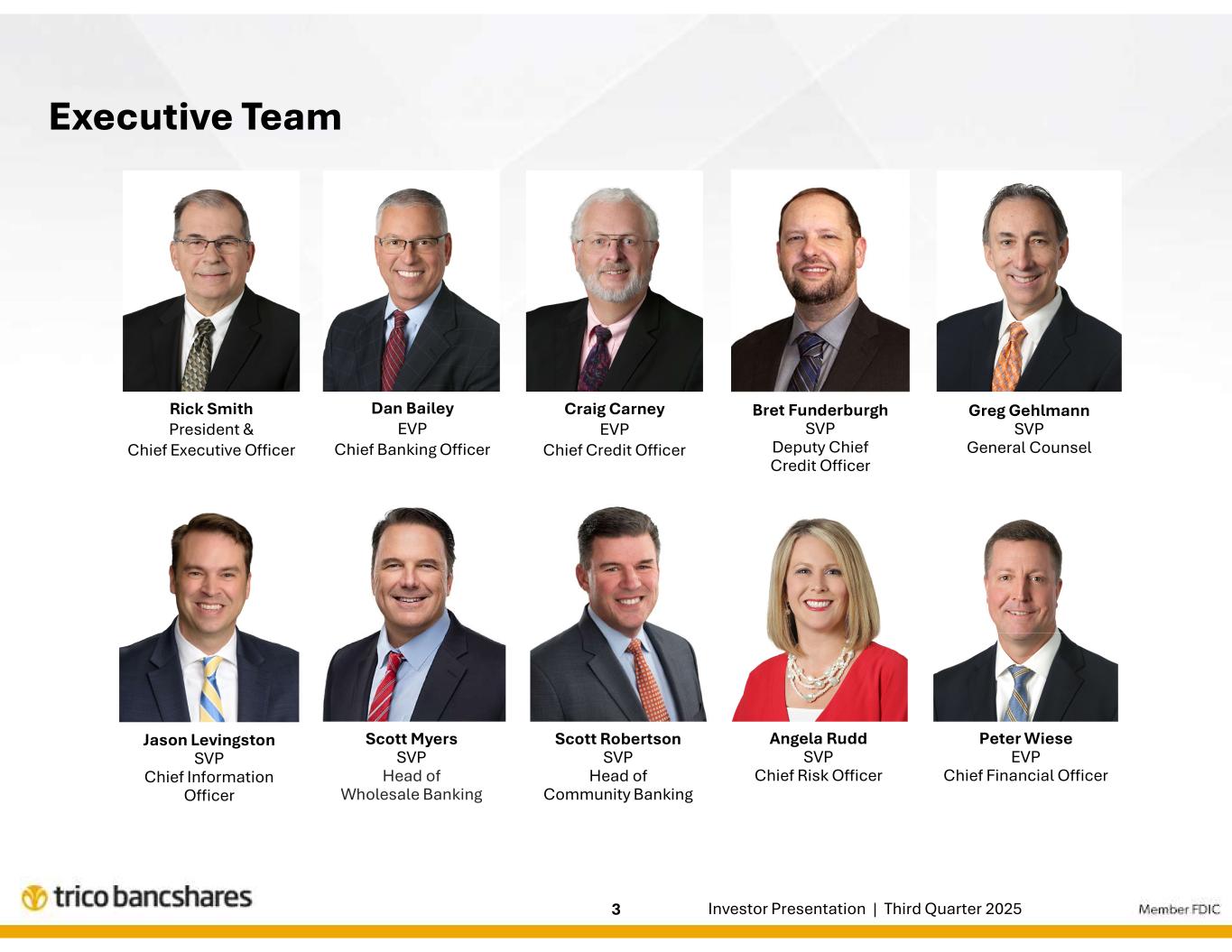 Investor Presentation | Third Quarter 20252 Safe Harbor Statement The statements contained herein that are not historical facts are forward-looking statements based on management’s current expectations and beliefs concerning future developments and their potential effects on us. Such statements involve inherent risks and uncertainties, many of which are difficult to predict and are generally beyond our control. We caution readers that a number of important factors could cause actual results to differ materially from those expressed in, or implied or projected by, such forward-looking statements. These risks and uncertainties include, but are not limited to, the following: macroeconomic, geopolitical, and other challenges and uncertainties, including those related to actual or potential policies and actions from the new U.S. administration, such as tariffs, and reciprocal actions by other countries or regions, significant volatility and disruptions in financial markets, a resurgence of inflation, increases in unemployment rates, increases in interest rates and slowing economic growth or recession in the U.S. and other countries or regions; the impact of any future federal government shutdown and uncertainty regarding the federal government’s debt limit; the impact of changes in financial services industry policies, laws and regulations; regulatory restrictions or adverse regulatory findings affecting our ability to successfully market and price our products to consumers; adverse developments in the financial services industry generally such as bank failures and any related impact on depositor behavior or investor sentiment; the impacts of international hostilities, wars, terrorism or geopolitical events; risks related to the sufficiency of liquidity, including our ability to attract and maintain deposits; the risks related to the development, implementation, use and management of emerging technologies, including artificial intelligence and machine learning; extreme weather, natural disasters and other catastrophic events and their effects on our customers and the economic and business environments in which we operate; current and future economic and market conditions of the local economies in which we conduct operations; declines in housing and commercial real estate prices and changes in the financial performance and/or condition of our borrowers; the market value of our investment securities and possible other-than-temporary impairment of securities held by us due to changes in credit quality or rates; the availability of, and cost of, sources of funding and the demand for our products; the possibility that our recorded goodwill could become impaired, which may have an adverse impact on our earnings and capital; the costs or effects of mergers, acquisitions or dispositions we may make, as well as whether we are able to obtain any required governmental approvals in connection with any such activities, or identify and complete favorable transactions in the future, and/or realize the anticipated financial and business benefits; the volatility of the stock market and its impact on our stock price and our ability to conduct acquisitions; the regulatory and financial impacts associated with exceeding $10 billion in total assets; the ability to execute our business plan in new markets; our future operating or financial performance, including our outlook for future growth; changes in the level and direction of our nonperforming assets and charge-offs and the appropriateness of the allowance for credit losses; the effectiveness of us managing the mix of earning assets and in improving, resolving or liquidating lower-quality assets; changes in accounting standards and practices; changes in consumer spending, borrowing and savings habits; the effects of changes in the level or cost of checking or savings account deposits on our funding costs and net interest margin; increasing noninterest expense and its impact on our financial performance; competition and innovation with respect to financial products and services by banks, financial institutions and non-traditional competitors including retail businesses and technology companies; the challenges of attracting, integrating and retaining key employees; the impact of the 2023 cyber security ransomware incident, including the pending litigation, on our operations and reputation; the vulnerability of our operational or security systems or infrastructure, the systems of third-party vendors or other service providers with whom we contract, and our customers to unauthorized access, computer viruses, phishing schemes, spam attacks, human error, natural disasters, power loss and data/security breaches and the cost to defend against and respond to such incidents; increased data security risks due to work from home arrangements and email vulnerability; failure to safeguard personal information, and any resulting litigation; the effect of a fall in stock market prices on our brokerage and wealth management businesses; the emergence or continuation of widespread health emergencies or pandemics; potential judgments, orders, settlements, penalties, fines and reputational damage resulting from pending or future litigation and regulatory investigations, proceedings and enforcement actions; and our ability to manage the risks involved in the foregoing. There can be no assurance that future developments affecting us will be the same as those anticipated by management. Additional factors that could cause results to differ materially from those described above can be found in our filings with the U.S. Securities and Exchange Commission, including without limitation the “Risk Factors” Section of TriCo’s Annual Report on Form 10-K for the year ended December 31, 2024, Such filings are also available in the “Investor Relations” section of our website, https://www.tcbk.com/investor-relations. Annualized, pro forma, projections and estimates are not forecasts 