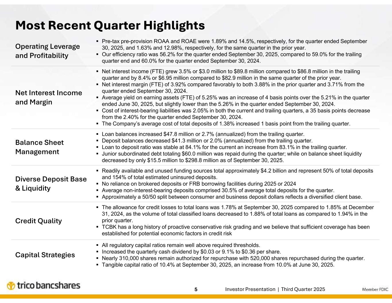 Investor Presentation | Third Quarter 20252 Safe Harbor Statement The statements contained herein that are not historical facts are forward-looking statements based on management’s current expectations and beliefs concerning future developments and their potential effects on us. Such statements involve inherent risks and uncertainties, many of which are difficult to predict and are generally beyond our control. We caution readers that a number of important factors could cause actual results to differ materially from those expressed in, or implied or projected by, such forward-looking statements. These risks and uncertainties include, but are not limited to, the following: macroeconomic, geopolitical, and other challenges and uncertainties, including those related to actual or potential policies and actions from the new U.S. administration, such as tariffs, and reciprocal actions by other countries or regions, significant volatility and disruptions in financial markets, a resurgence of inflation, increases in unemployment rates, increases in interest rates and slowing economic growth or recession in the U.S. and other countries or regions; the impact of any future federal government shutdown and uncertainty regarding the federal government’s debt limit; the impact of changes in financial services industry policies, laws and regulations; regulatory restrictions or adverse regulatory findings affecting our ability to successfully market and price our products to consumers; adverse developments in the financial services industry generally such as bank failures and any related impact on depositor behavior or investor sentiment; the impacts of international hostilities, wars, terrorism or geopolitical events; risks related to the sufficiency of liquidity, including our ability to attract and maintain deposits; the risks related to the development, implementation, use and management of emerging technologies, including artificial intelligence and machine learning; extreme weather, natural disasters and other catastrophic events and their effects on our customers and the economic and business environments in which we operate; current and future economic and market conditions of the local economies in which we conduct operations; declines in housing and commercial real estate prices and changes in the financial performance and/or condition of our borrowers; the market value of our investment securities and possible other-than-temporary impairment of securities held by us due to changes in credit quality or rates; the availability of, and cost of, sources of funding and the demand for our products; the possibility that our recorded goodwill could become impaired, which may have an adverse impact on our earnings and capital; the costs or effects of mergers, acquisitions or dispositions we may make, as well as whether we are able to obtain any required governmental approvals in connection with any such activities, or identify and complete favorable transactions in the future, and/or realize the anticipated financial and business benefits; the volatility of the stock market and its impact on our stock price and our ability to conduct acquisitions; the regulatory and financial impacts associated with exceeding $10 billion in total assets; the ability to execute our business plan in new markets; our future operating or financial performance, including our outlook for future growth; changes in the level and direction of our nonperforming assets and charge-offs and the appropriateness of the allowance for credit losses; the effectiveness of us managing the mix of earning assets and in improving, resolving or liquidating lower-quality assets; changes in accounting standards and practices; changes in consumer spending, borrowing and savings habits; the effects of changes in the level or cost of checking or savings account deposits on our funding costs and net interest margin; increasing noninterest expense and its impact on our financial performance; competition and innovation with respect to financial products and services by banks, financial institutions and non-traditional competitors including retail businesses and technology companies; the challenges of attracting, integrating and retaining key employees; the impact of the 2023 cyber security ransomware incident, including the pending litigation, on our operations and reputation; the vulnerability of our operational or security systems or infrastructure, the systems of third-party vendors or other service providers with whom we contract, and our customers to unauthorized access, computer viruses, phishing schemes, spam attacks, human error, natural disasters, power loss and data/security breaches and the cost to defend against and respond to such incidents; increased data security risks due to work from home arrangements and email vulnerability; failure to safeguard personal information, and any resulting litigation; the effect of a fall in stock market prices on our brokerage and wealth management businesses; the emergence or continuation of widespread health emergencies or pandemics; potential judgments, orders, settlements, penalties, fines and reputational damage resulting from pending or future litigation and regulatory investigations, proceedings and enforcement actions; and our ability to manage the risks involved in the foregoing. There can be no assurance that future developments affecting us will be the same as those anticipated by management. Additional factors that could cause results to differ materially from those described above can be found in our filings with the U.S. Securities and Exchange Commission, including without limitation the “Risk Factors” Section of TriCo’s Annual Report on Form 10-K for the year ended December 31, 2024, Such filings are also available in the “Investor Relations” section of our website, https://www.tcbk.com/investor-relations. Annualized, pro forma, projections and estimates are not forecasts 