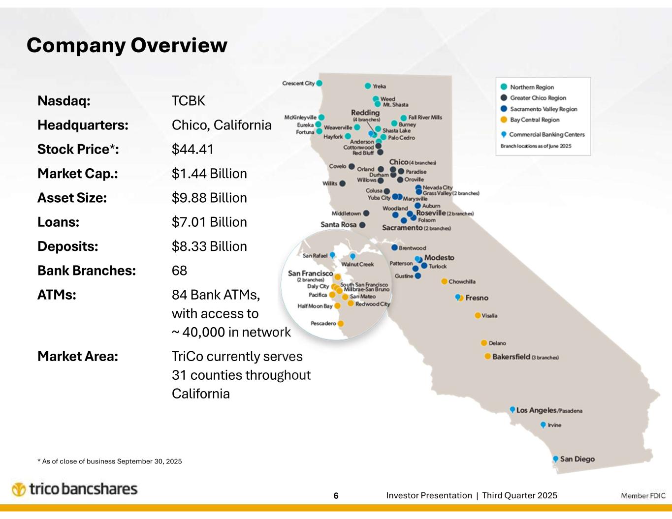 Investor Presentation | Third Quarter 20252 Safe Harbor Statement The statements contained herein that are not historical facts are forward-looking statements based on management’s current expectations and beliefs concerning future developments and their potential effects on us. Such statements involve inherent risks and uncertainties, many of which are difficult to predict and are generally beyond our control. We caution readers that a number of important factors could cause actual results to differ materially from those expressed in, or implied or projected by, such forward-looking statements. These risks and uncertainties include, but are not limited to, the following: macroeconomic, geopolitical, and other challenges and uncertainties, including those related to actual or potential policies and actions from the new U.S. administration, such as tariffs, and reciprocal actions by other countries or regions, significant volatility and disruptions in financial markets, a resurgence of inflation, increases in unemployment rates, increases in interest rates and slowing economic growth or recession in the U.S. and other countries or regions; the impact of any future federal government shutdown and uncertainty regarding the federal government’s debt limit; the impact of changes in financial services industry policies, laws and regulations; regulatory restrictions or adverse regulatory findings affecting our ability to successfully market and price our products to consumers; adverse developments in the financial services industry generally such as bank failures and any related impact on depositor behavior or investor sentiment; the impacts of international hostilities, wars, terrorism or geopolitical events; risks related to the sufficiency of liquidity, including our ability to attract and maintain deposits; the risks related to the development, implementation, use and management of emerging technologies, including artificial intelligence and machine learning; extreme weather, natural disasters and other catastrophic events and their effects on our customers and the economic and business environments in which we operate; current and future economic and market conditions of the local economies in which we conduct operations; declines in housing and commercial real estate prices and changes in the financial performance and/or condition of our borrowers; the market value of our investment securities and possible other-than-temporary impairment of securities held by us due to changes in credit quality or rates; the availability of, and cost of, sources of funding and the demand for our products; the possibility that our recorded goodwill could become impaired, which may have an adverse impact on our earnings and capital; the costs or effects of mergers, acquisitions or dispositions we may make, as well as whether we are able to obtain any required governmental approvals in connection with any such activities, or identify and complete favorable transactions in the future, and/or realize the anticipated financial and business benefits; the volatility of the stock market and its impact on our stock price and our ability to conduct acquisitions; the regulatory and financial impacts associated with exceeding $10 billion in total assets; the ability to execute our business plan in new markets; our future operating or financial performance, including our outlook for future growth; changes in the level and direction of our nonperforming assets and charge-offs and the appropriateness of the allowance for credit losses; the effectiveness of us managing the mix of earning assets and in improving, resolving or liquidating lower-quality assets; changes in accounting standards and practices; changes in consumer spending, borrowing and savings habits; the effects of changes in the level or cost of checking or savings account deposits on our funding costs and net interest margin; increasing noninterest expense and its impact on our financial performance; competition and innovation with respect to financial products and services by banks, financial institutions and non-traditional competitors including retail businesses and technology companies; the challenges of attracting, integrating and retaining key employees; the impact of the 2023 cyber security ransomware incident, including the pending litigation, on our operations and reputation; the vulnerability of our operational or security systems or infrastructure, the systems of third-party vendors or other service providers with whom we contract, and our customers to unauthorized access, computer viruses, phishing schemes, spam attacks, human error, natural disasters, power loss and data/security breaches and the cost to defend against and respond to such incidents; increased data security risks due to work from home arrangements and email vulnerability; failure to safeguard personal information, and any resulting litigation; the effect of a fall in stock market prices on our brokerage and wealth management businesses; the emergence or continuation of widespread health emergencies or pandemics; potential judgments, orders, settlements, penalties, fines and reputational damage resulting from pending or future litigation and regulatory investigations, proceedings and enforcement actions; and our ability to manage the risks involved in the foregoing. There can be no assurance that future developments affecting us will be the same as those anticipated by management. Additional factors that could cause results to differ materially from those described above can be found in our filings with the U.S. Securities and Exchange Commission, including without limitation the “Risk Factors” Section of TriCo’s Annual Report on Form 10-K for the year ended December 31, 2024, Such filings are also available in the “Investor Relations” section of our website, https://www.tcbk.com/investor-relations. Annualized, pro forma, projections and estimates are not forecasts 